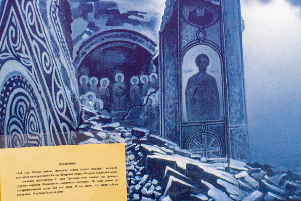 Некоторые из работ проникнуты духом Православия. На картине «Нашествие» изображен полуразрушенный фашистами Успенский собор Киево-Печерской Лавры. Развалины и грозовые тучи создают гнетущее впечатление, однако на полотне нашлось место и надежде: святые на уцелевших иконах продолжают стоять, символизируя непобедимость Святой Руси.