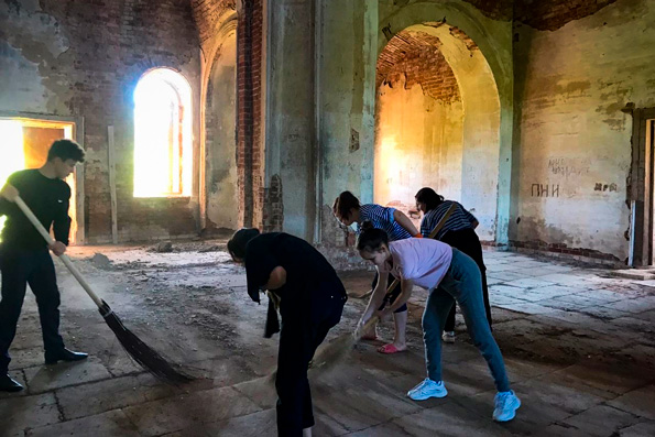 Православная молодежь под руководством настоятеля храма преподобной Ксении Римляныни — иерея Олега Малышева, очистила храм и территорию вокруг него от скопившегося мусора, восстановив повреждённые фрагменты каменного пола.