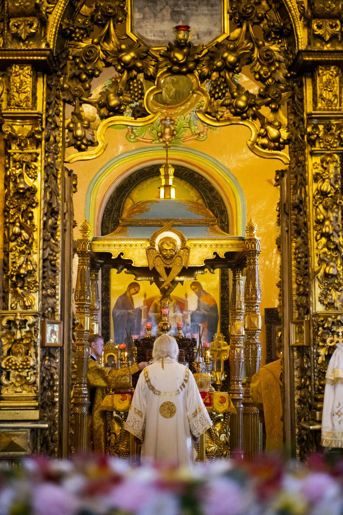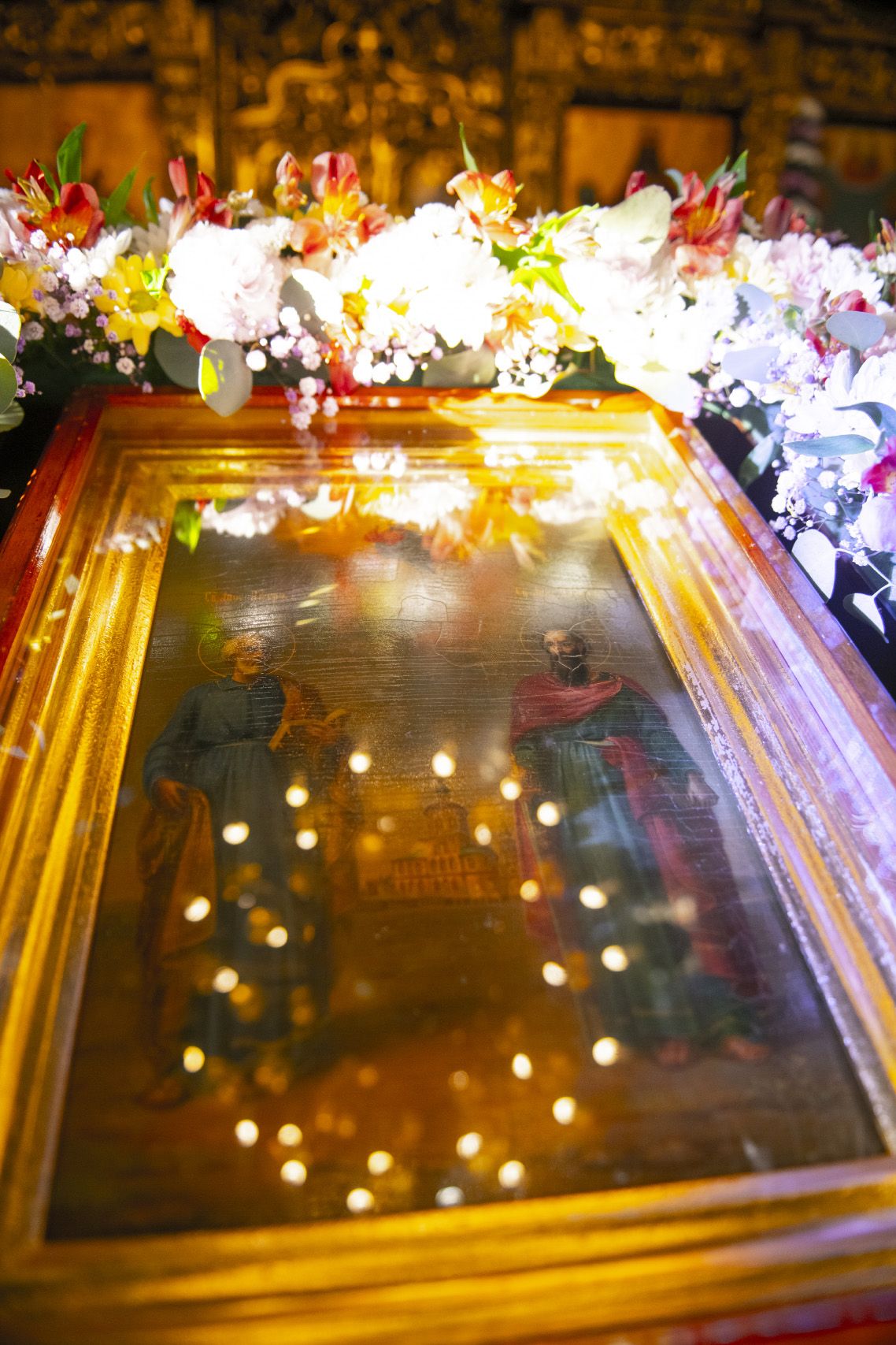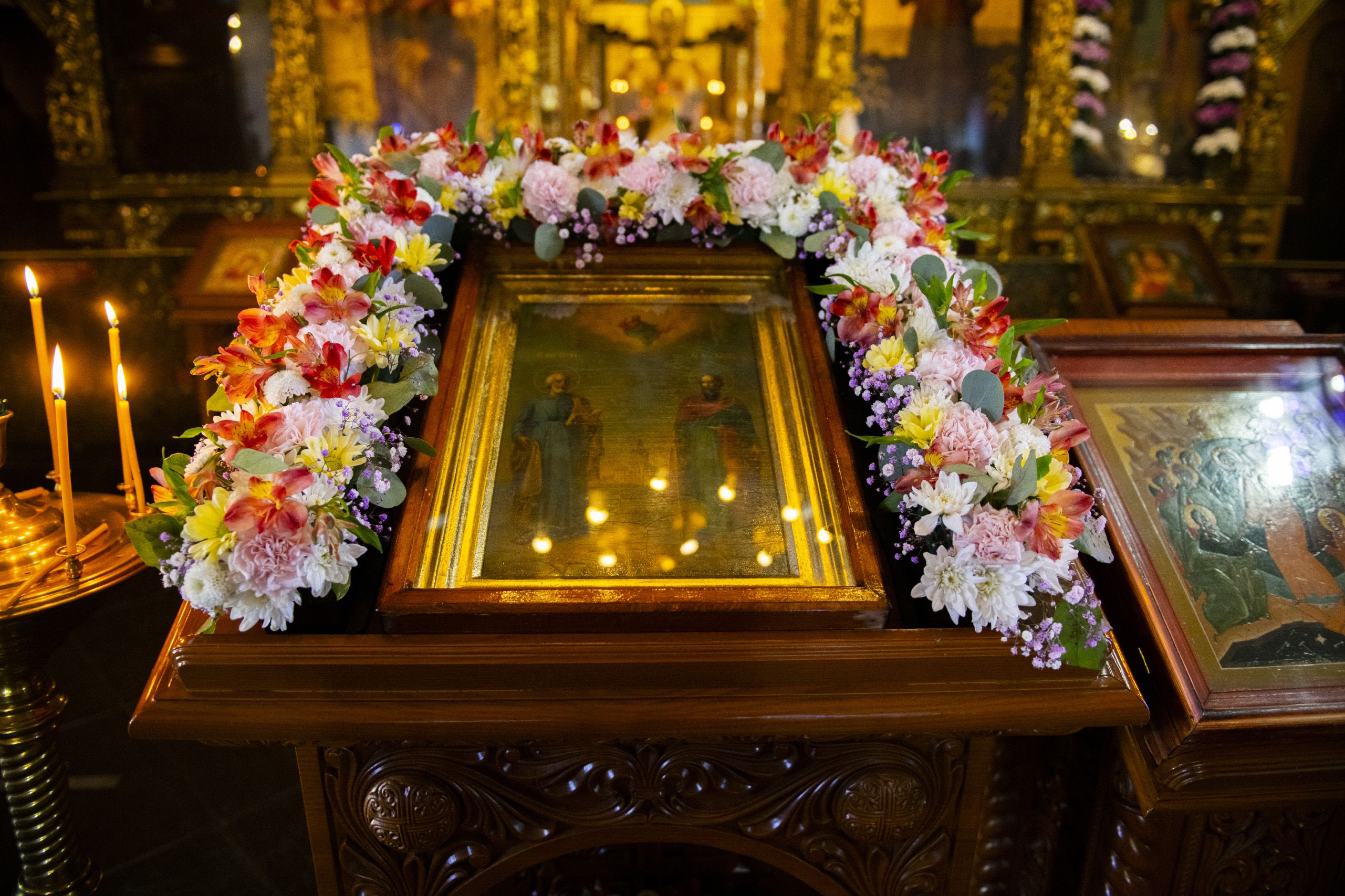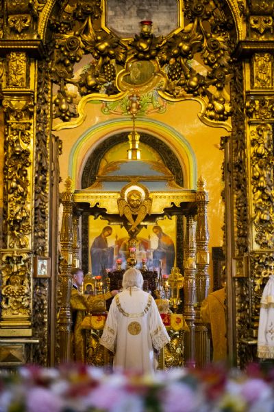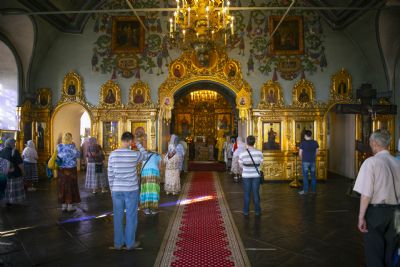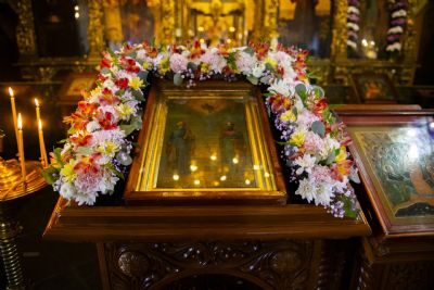 По прочтении заамвонной молитвы духовенство на середине храма перед праздничной иконой пропело славление святым покровителям храма.