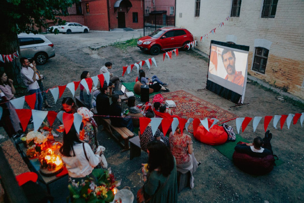 Вечером во дворе храма был организован совместный кинопросмотр. Организаторы украсили площадку праздничными флажками и гирляндами, приготовили для гостей оригинальные столы с угощениями и напитками и оборудовали фотозону.