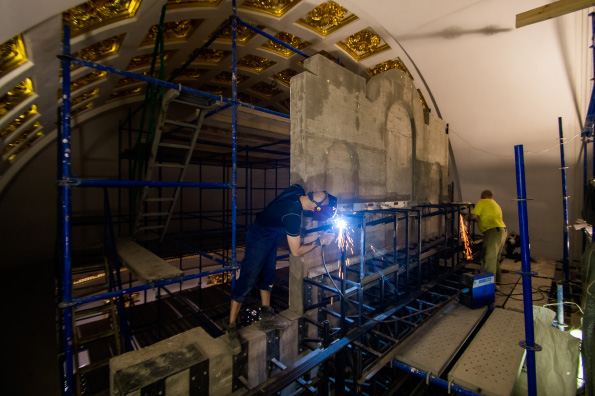 Иконостасы воссоздаваемого собора представляют собой металлические каркасы, обшитые плитами «Аквапанель» и облицованные белым и темно-фиолетовым мрамором. Колонны также изготовят из белого мрамора. Капители, базы колонны, архитравов, фризов и карнизов всех иконостасов, консоли центрального иконостаса, Царские врата центрального и северного приделов украсят резными позолоченными элементами.