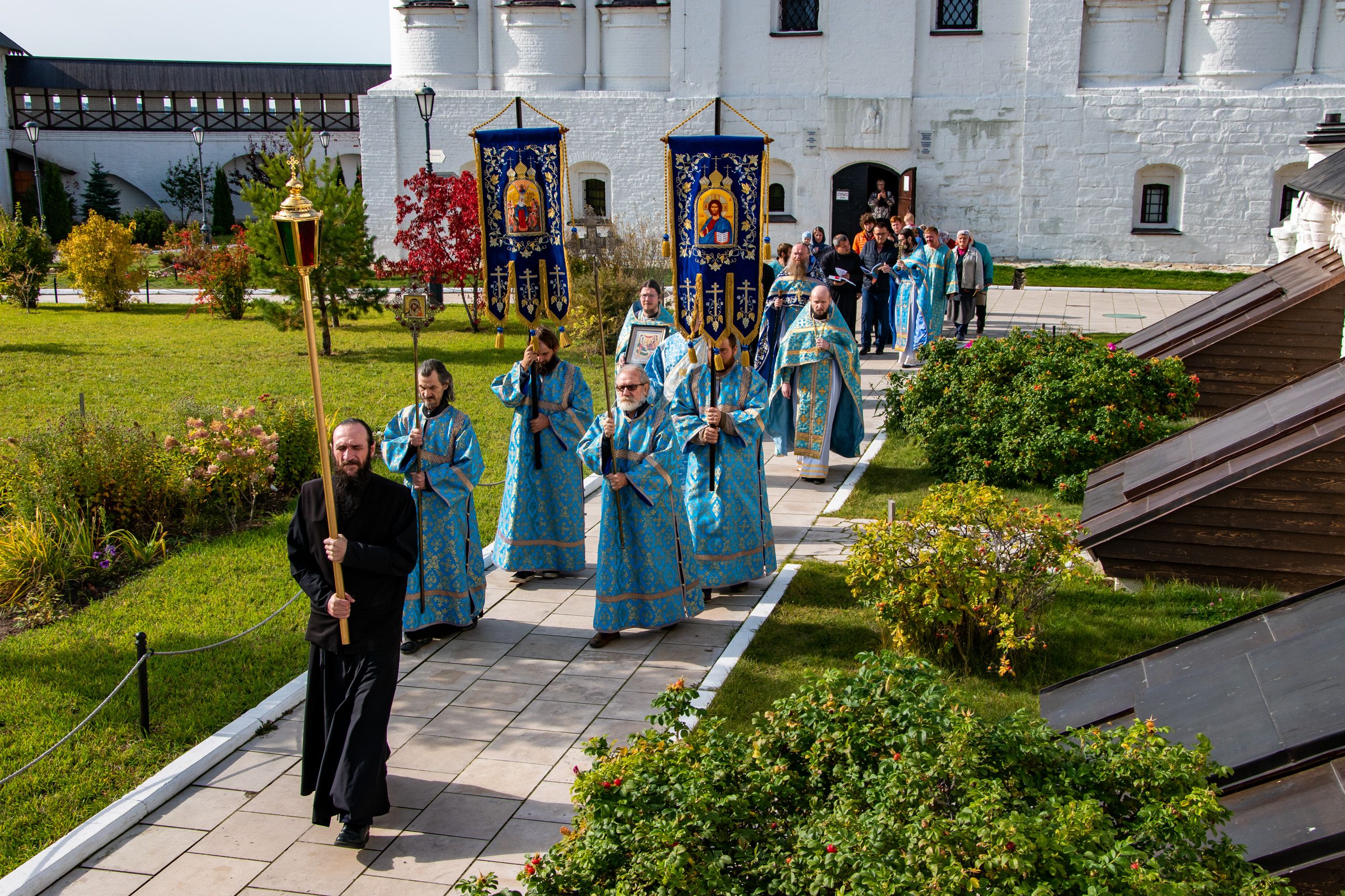 По окончании Литургии состоялся молебен Пресвятой Богородице. Затем духовенство и верующие прошли крестным ходом вокруг Успенского собора.