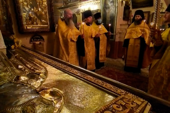 В конце богослужения было совершено славление у раки с мощами святителя Гурия и прочитана молитва всем ныне празднуемым Казанским святым.