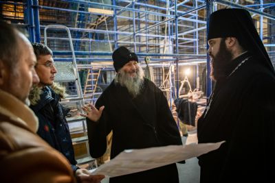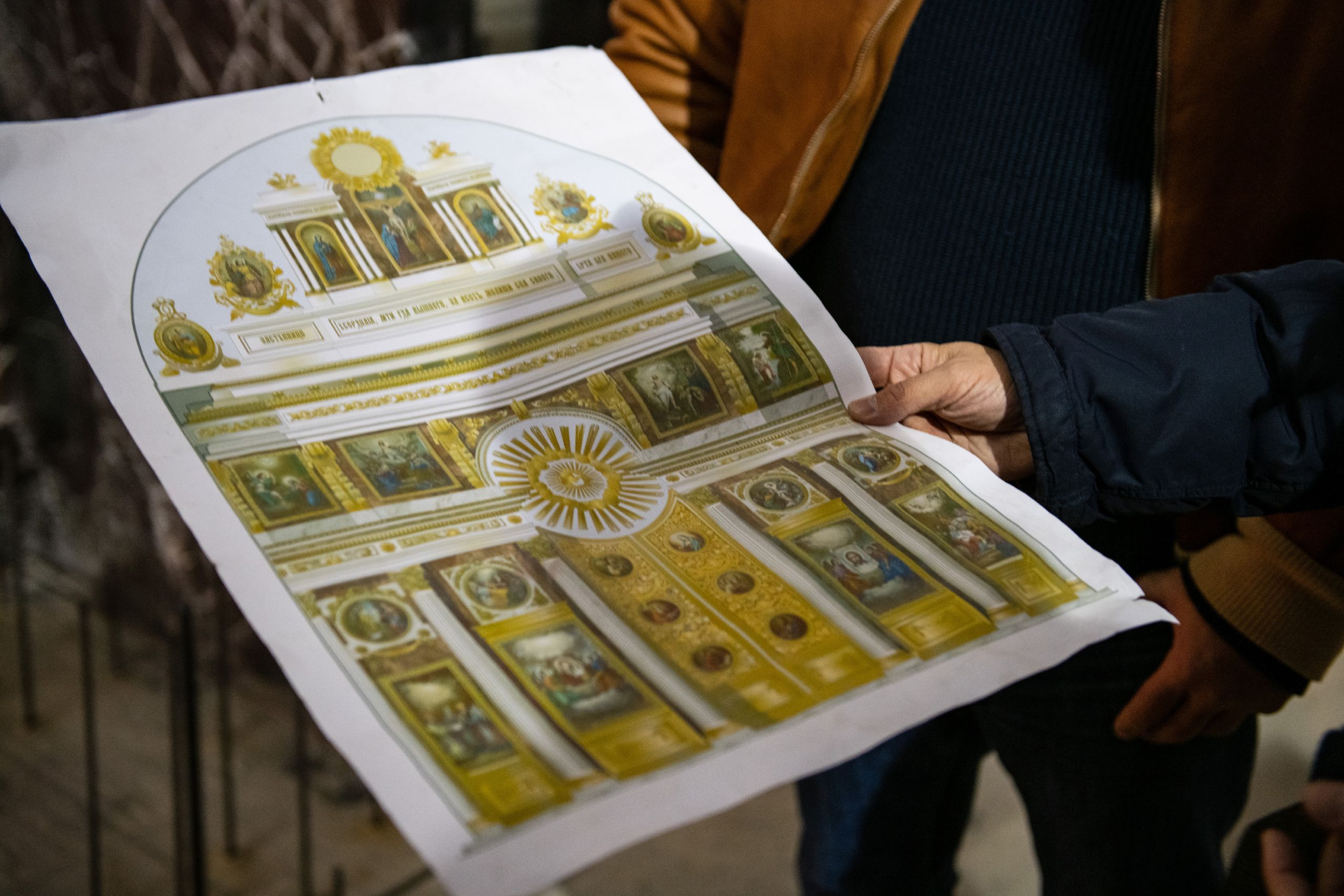 Владыке Иоанну рассказали об основных проектных решениях, выполнении каждого вида работ и графике их исполнения. Архипастырь ознакомился с эскизным проектом и цветовым решением иконостасов, задал вопросы, касающиеся некоторых проектных решений. Отдельно обсуждались способ крепления иконных досок и иконных рам, технология золочения резьбы и механизм открытия и закрытия Царских врат.