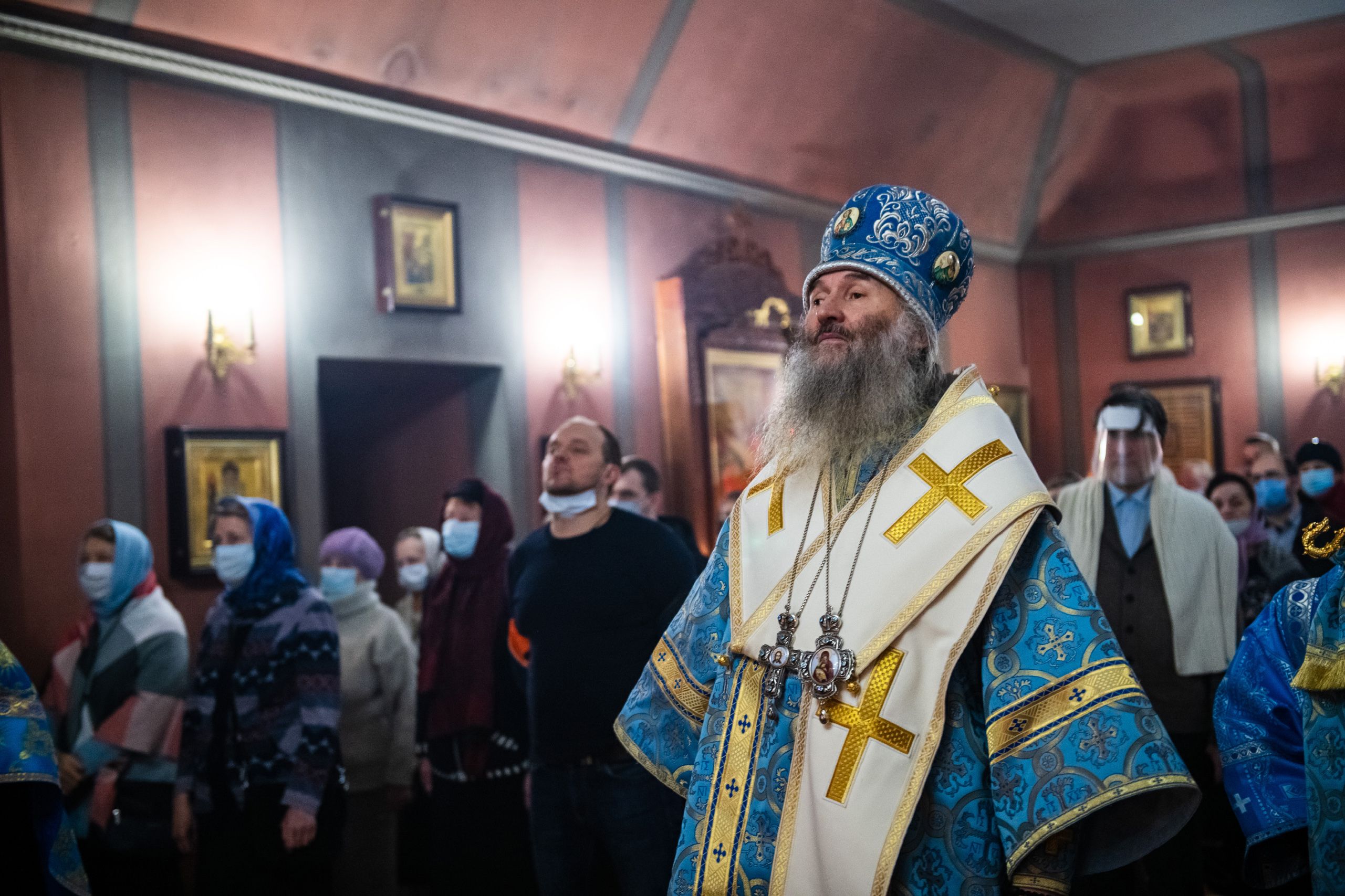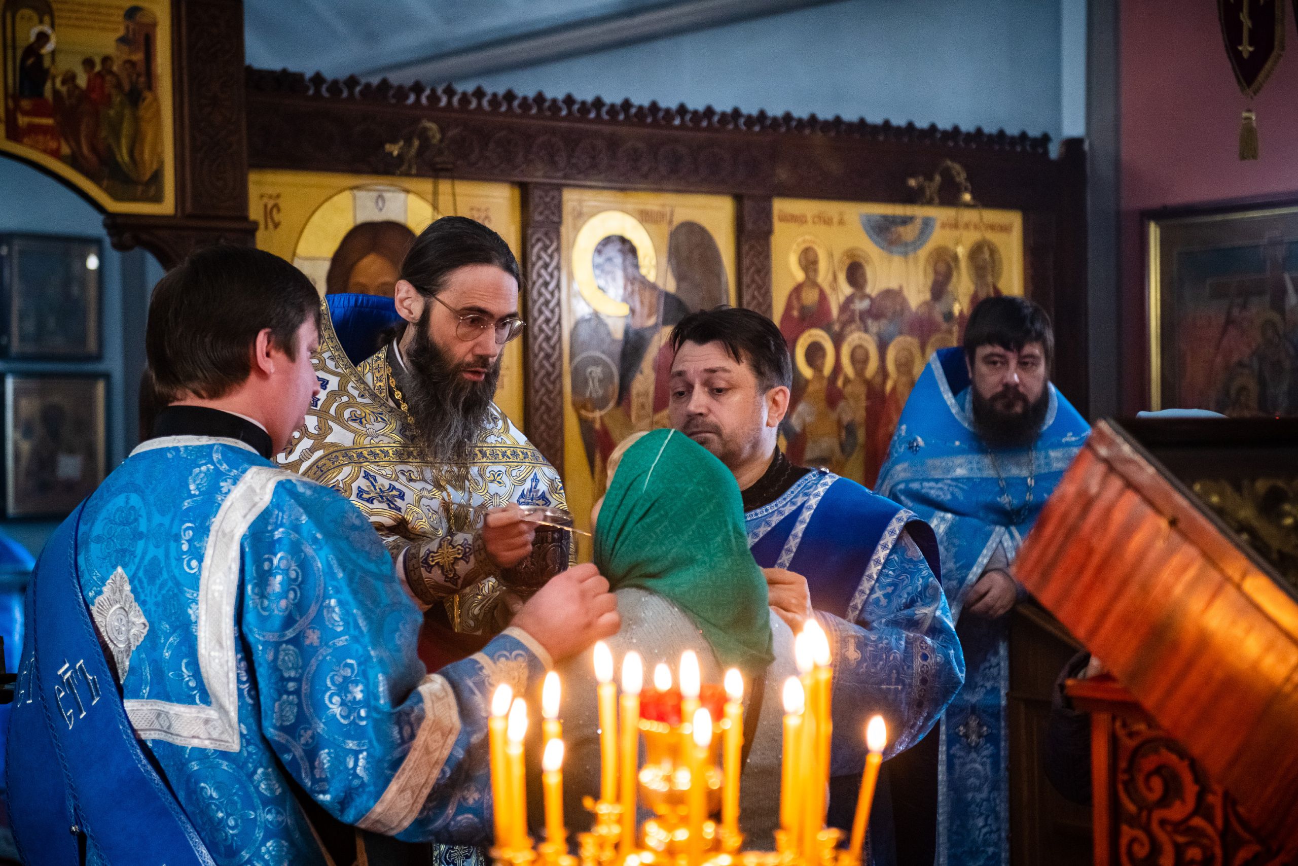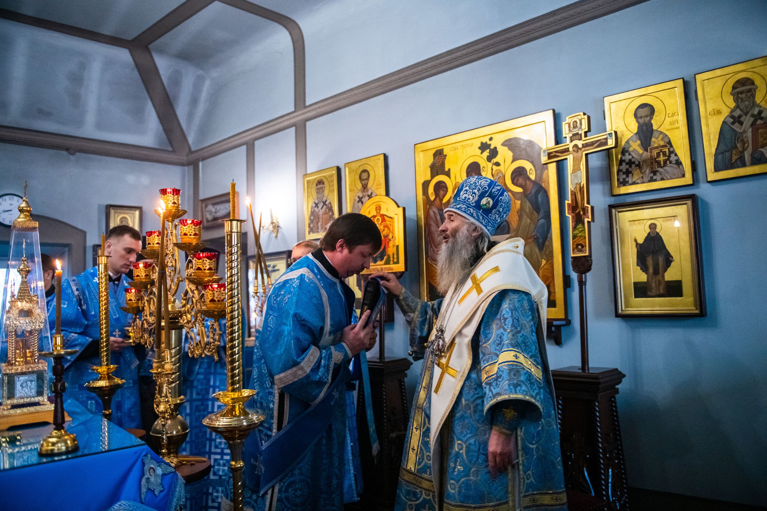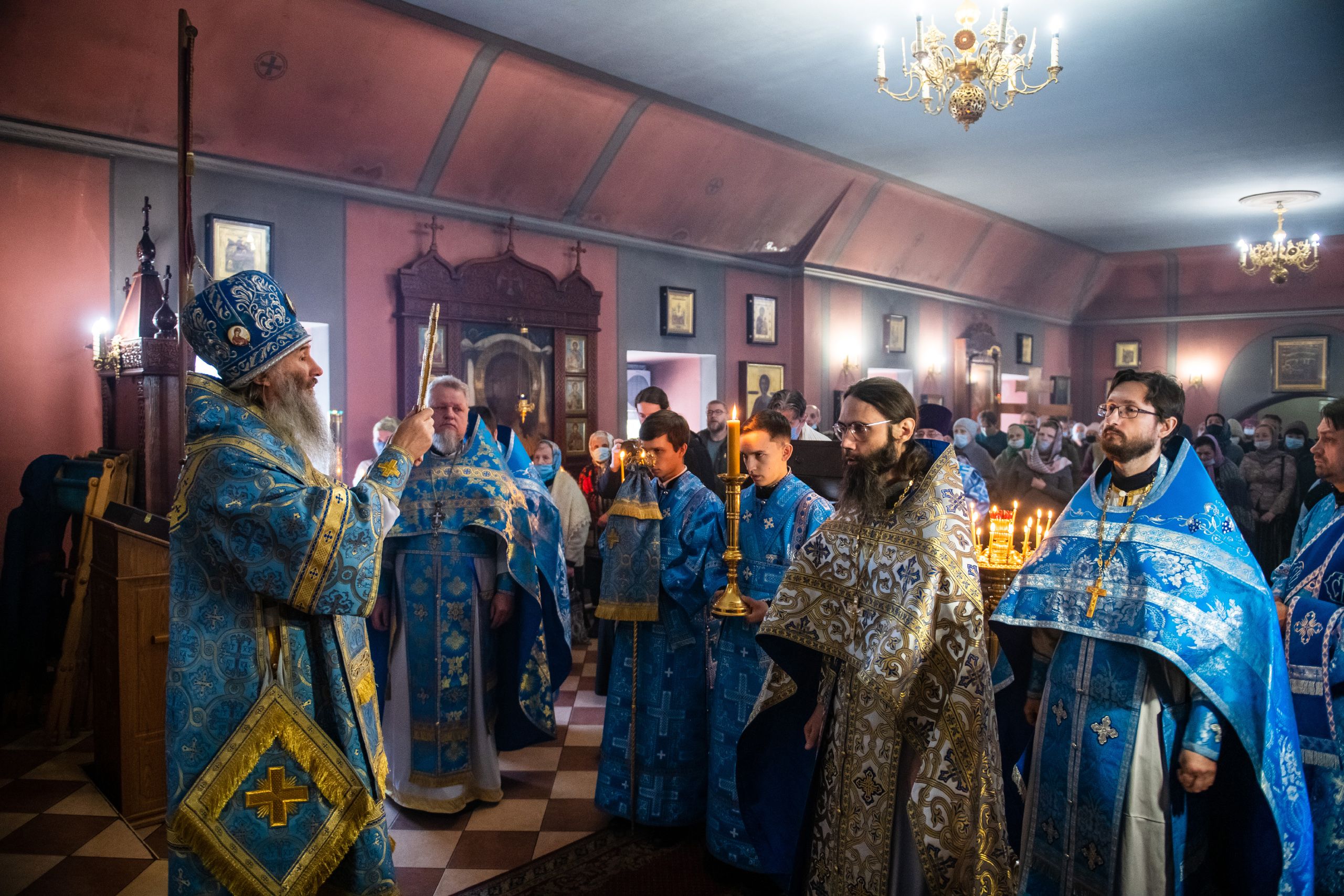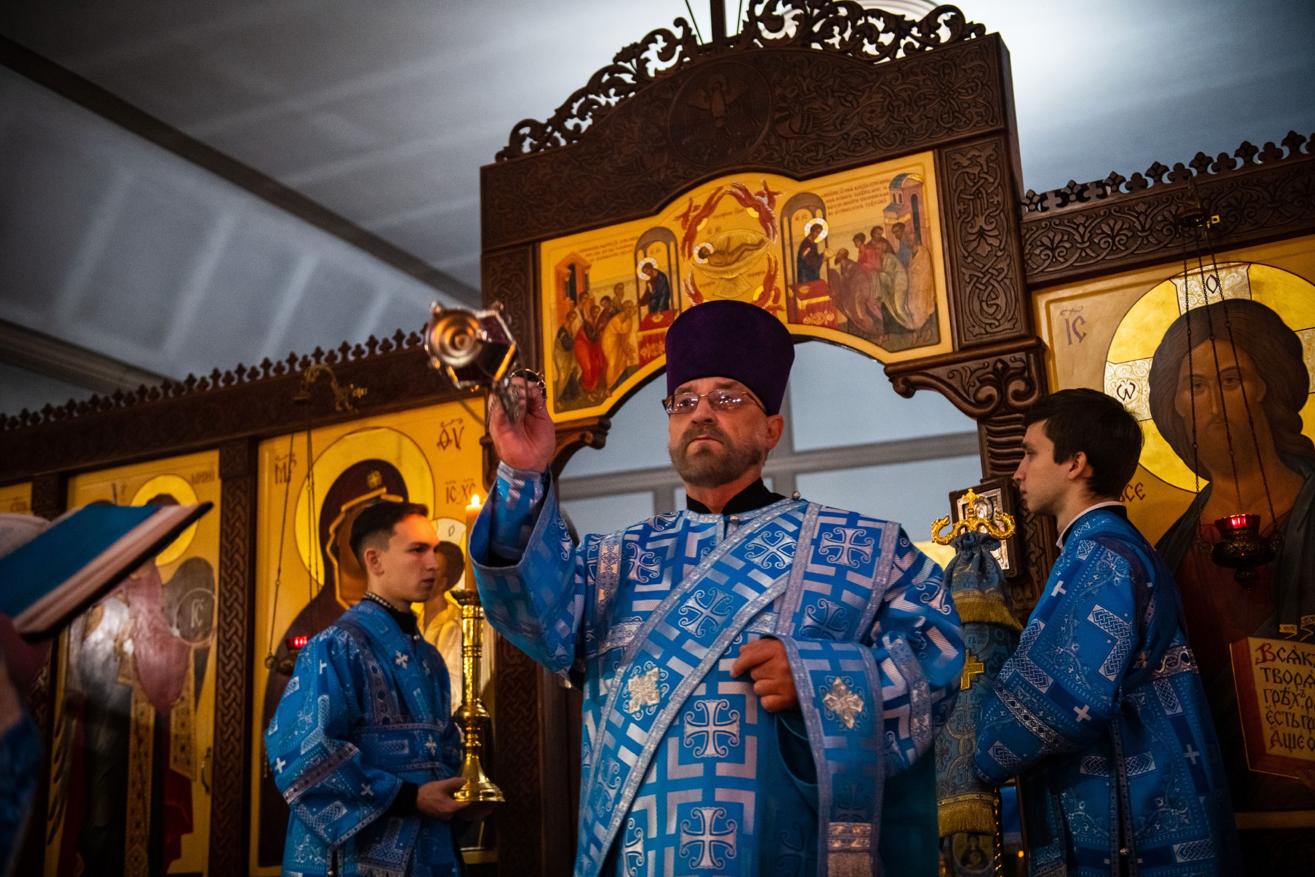 По заамвонной молитве священнослужители на середине храма пропели славление Пресвятой Богородице — тропарь, кондак и величание праздника.