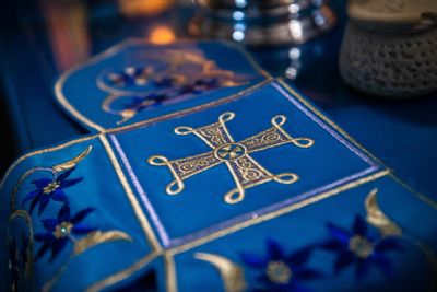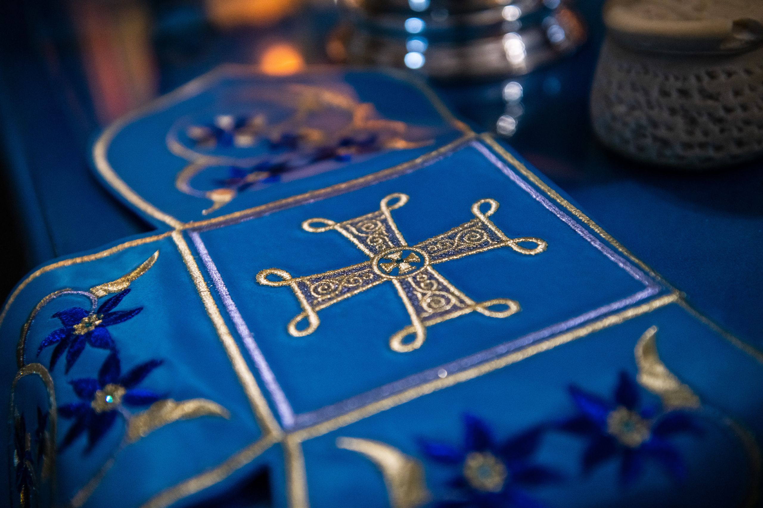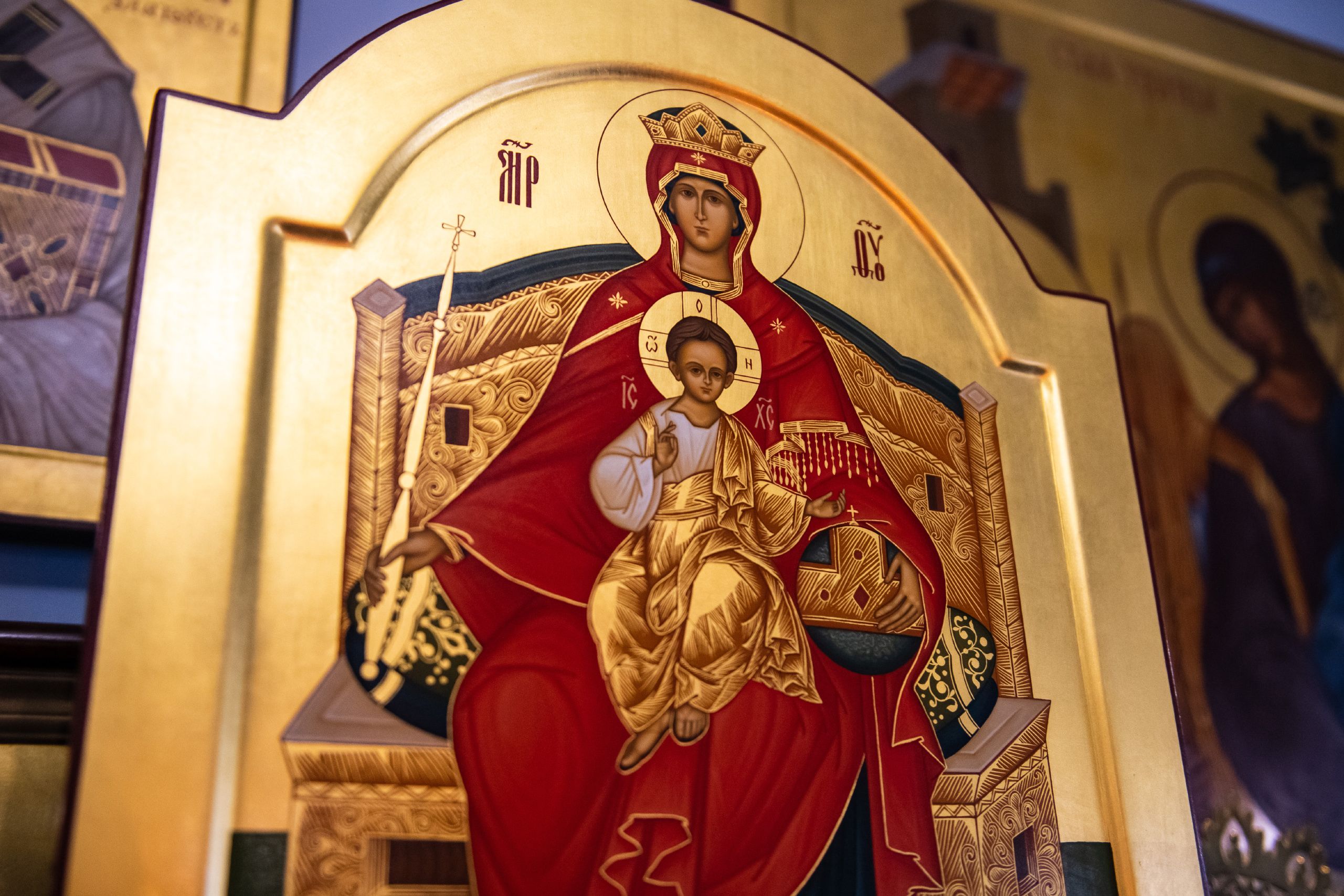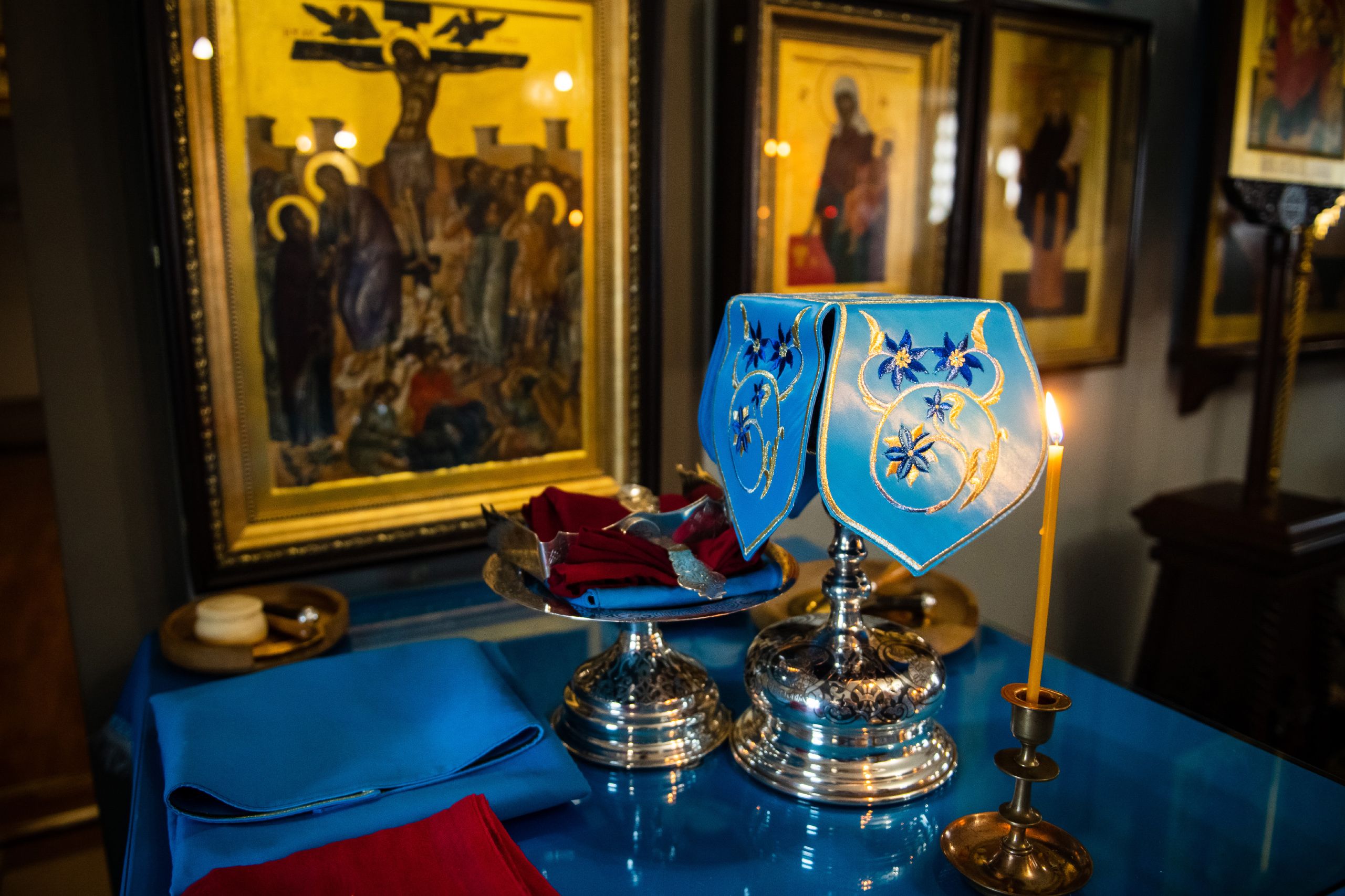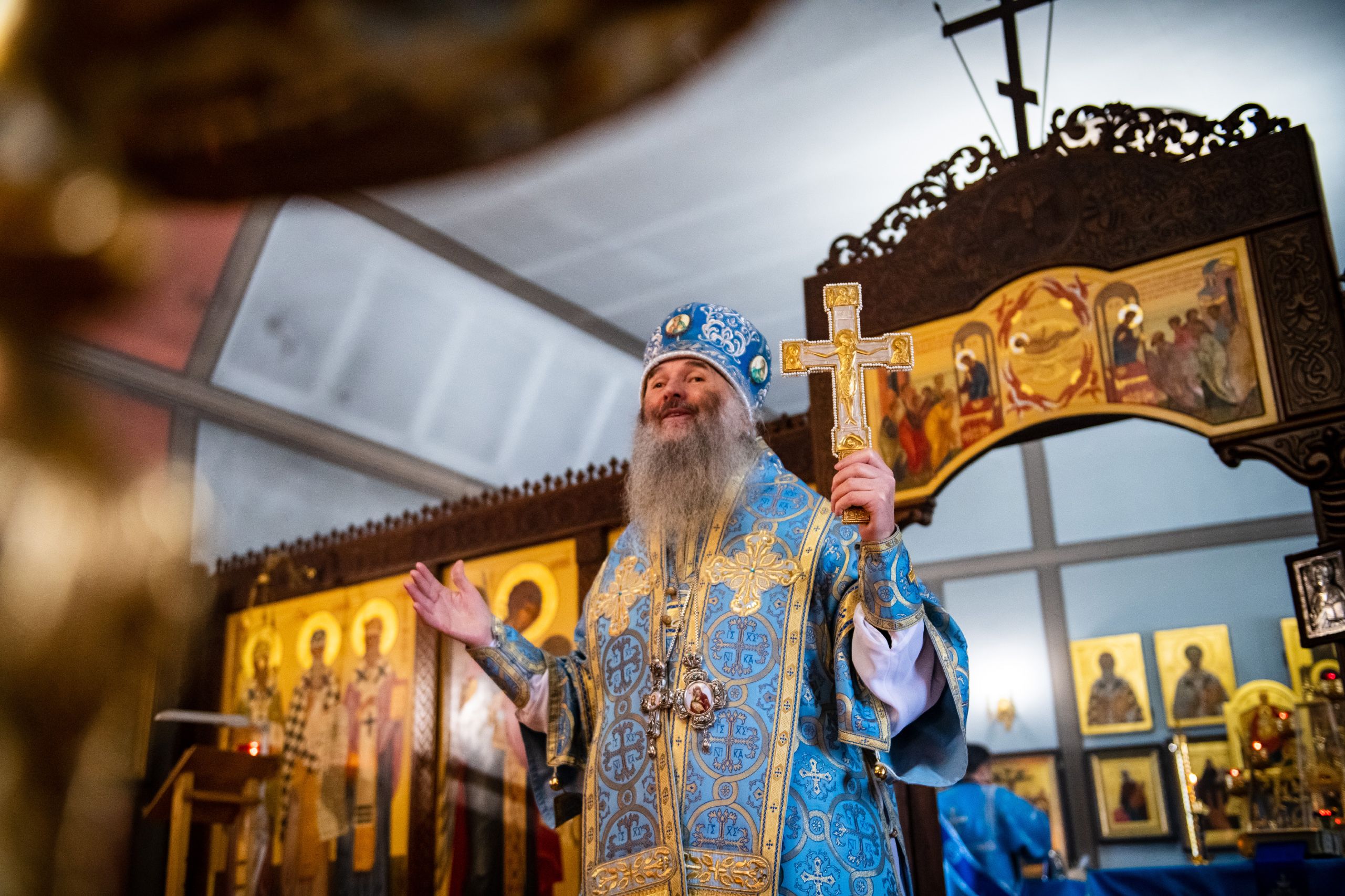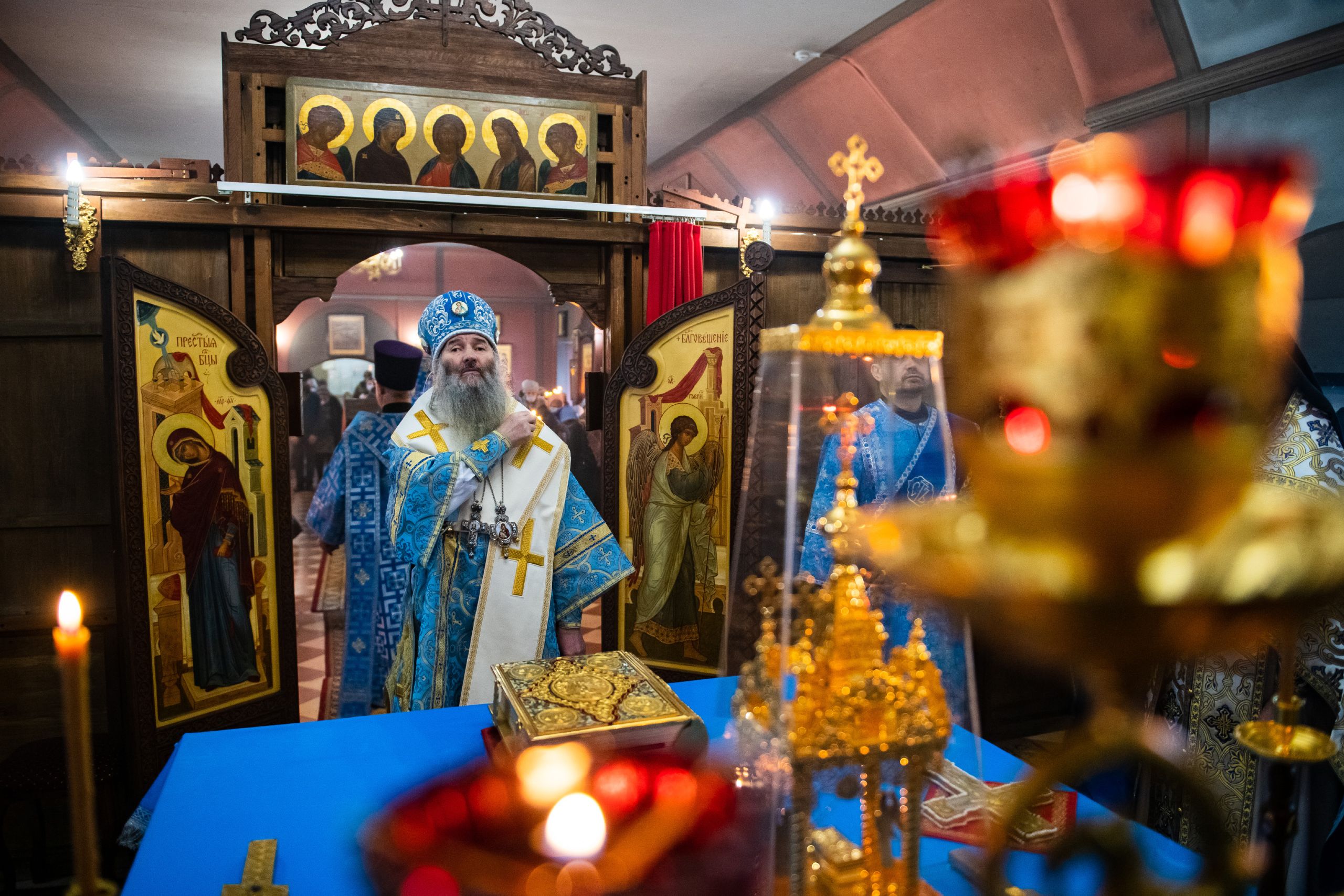 По заамвонной молитве священнослужители на середине храма пропели славление Пресвятой Богородице — тропарь, кондак и величание праздника.