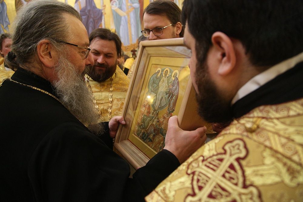 В ответном слове епископ Евгений поблагодарил всех за теплую встречу. Он отметил, что именно владыка Кирилл привел его как священника в этот мир и нарек затем имя при монашеском постриге. Владыка Евгений также пожелал, чтобы отеческое сердце митрополита Кирилла радовалось всему происходящему на уральской земле, возделанной его духовными трудами. В дар главе Татарстанской митрополии он передал келейный образ святителя Тихона, Патриарха Московского, освященный на мощах святого.