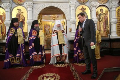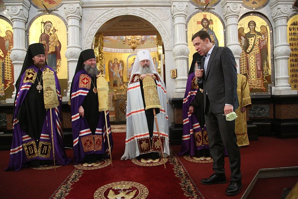 Со словами благодарности к Его Высокопреосвященству обратился глава региона. «Вы славно потрудились здесь, на Уральской земле. Были осуществлены многие начинания, строились и восстанавливались храмы, все больше людей приходило к вере, — отметил Евгений Куйвашев. — Я хочу вас поблагодарить за это, пожелать вам на новом месте успехов». Евгений Владимирович также обратился к новому главе Екатеринбургской митрополии. Губернатор поздравил владыку Евгения с возвращением на Урал и подчеркнул, что все совместные с владыкой Кириллом начинания будут продолжены «и все, что задумано, обязательно реализуем».