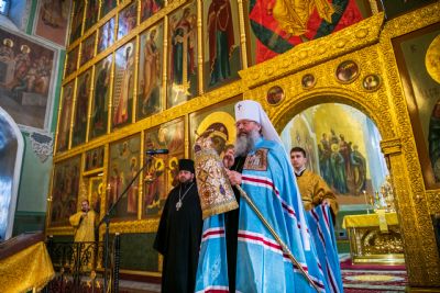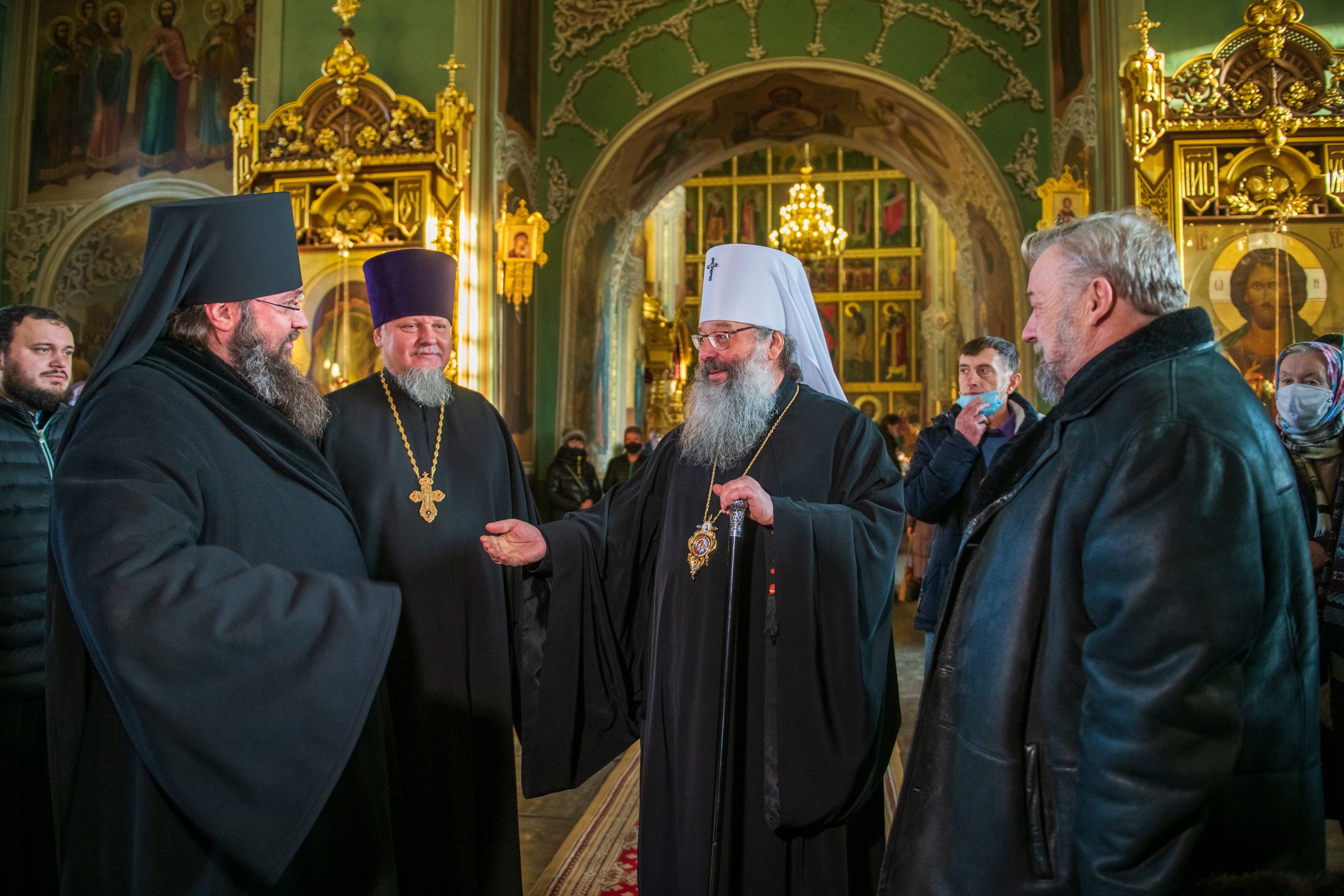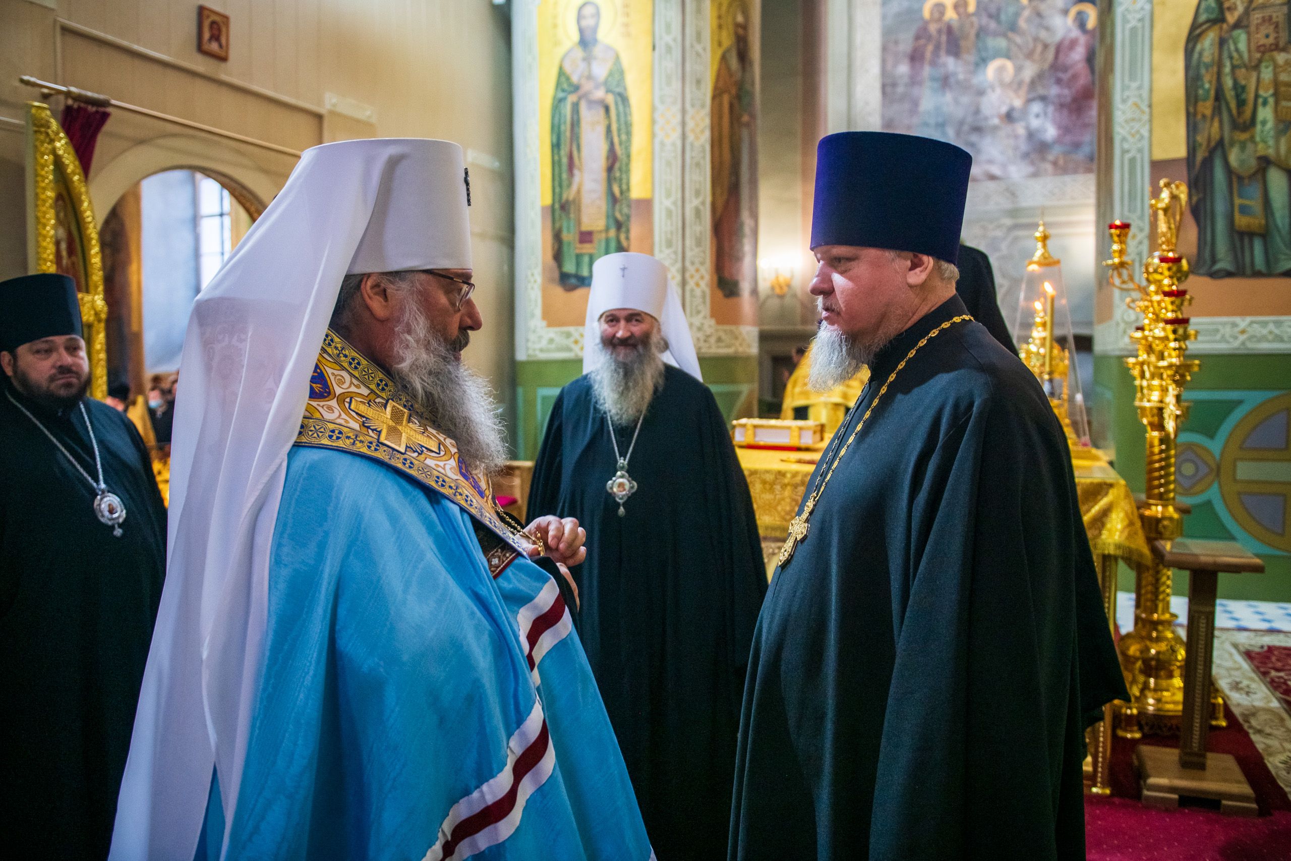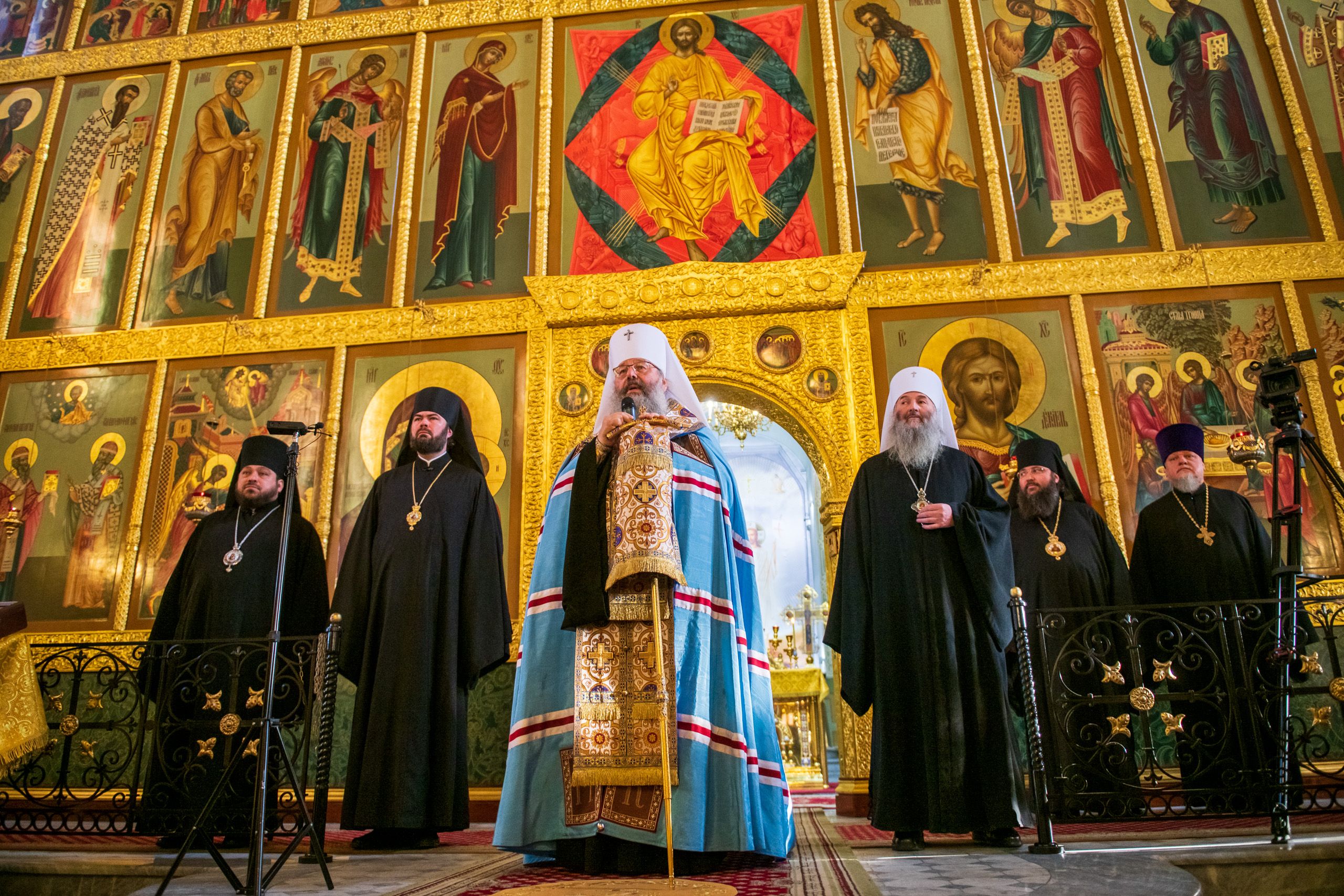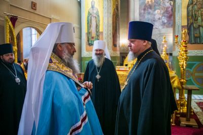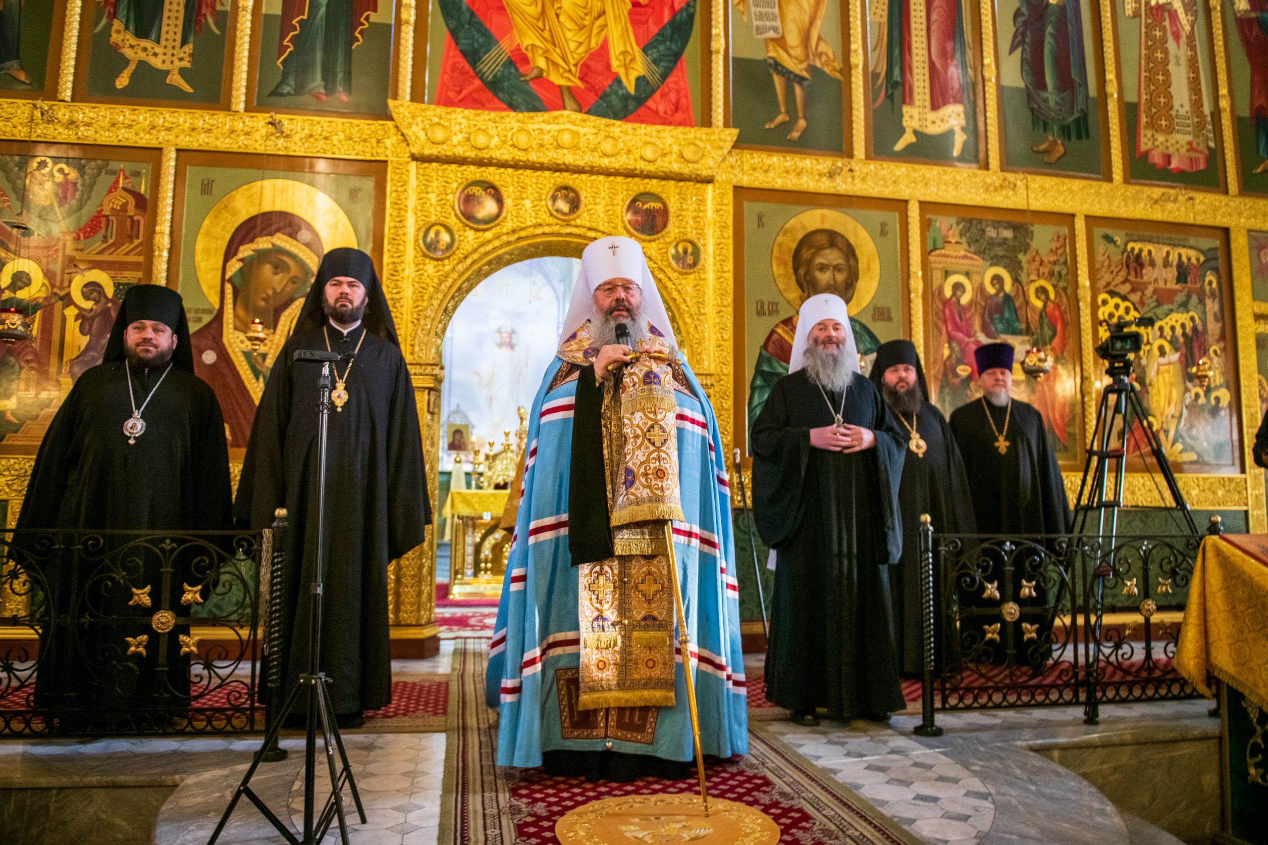 А сейчас приступаю к исполнению благословения Великого Господина и Отца нашего Кирилла, Святейшего Патриарха Московского и всея Руси, и Священного Синода Русской Православной Церкви, направивших меня сюда. Помолимся Богородице в этом дивном храме Божием, в котором, как совсем недавно вся страна и я сам наблюдали со стороны, уходил в вечность владыка митрополит Феофан. Он много потрудился, много подвизался и оставил очень многого доброго и полезного в этой жизни. Но Господь судил так, что он сейчас в вечности. Сейчас дни его памяти как новопреставленного, и надо чаще служить в храмах, вспоминая владыку. Пусть это будет свидетельством нашей любви к нему.