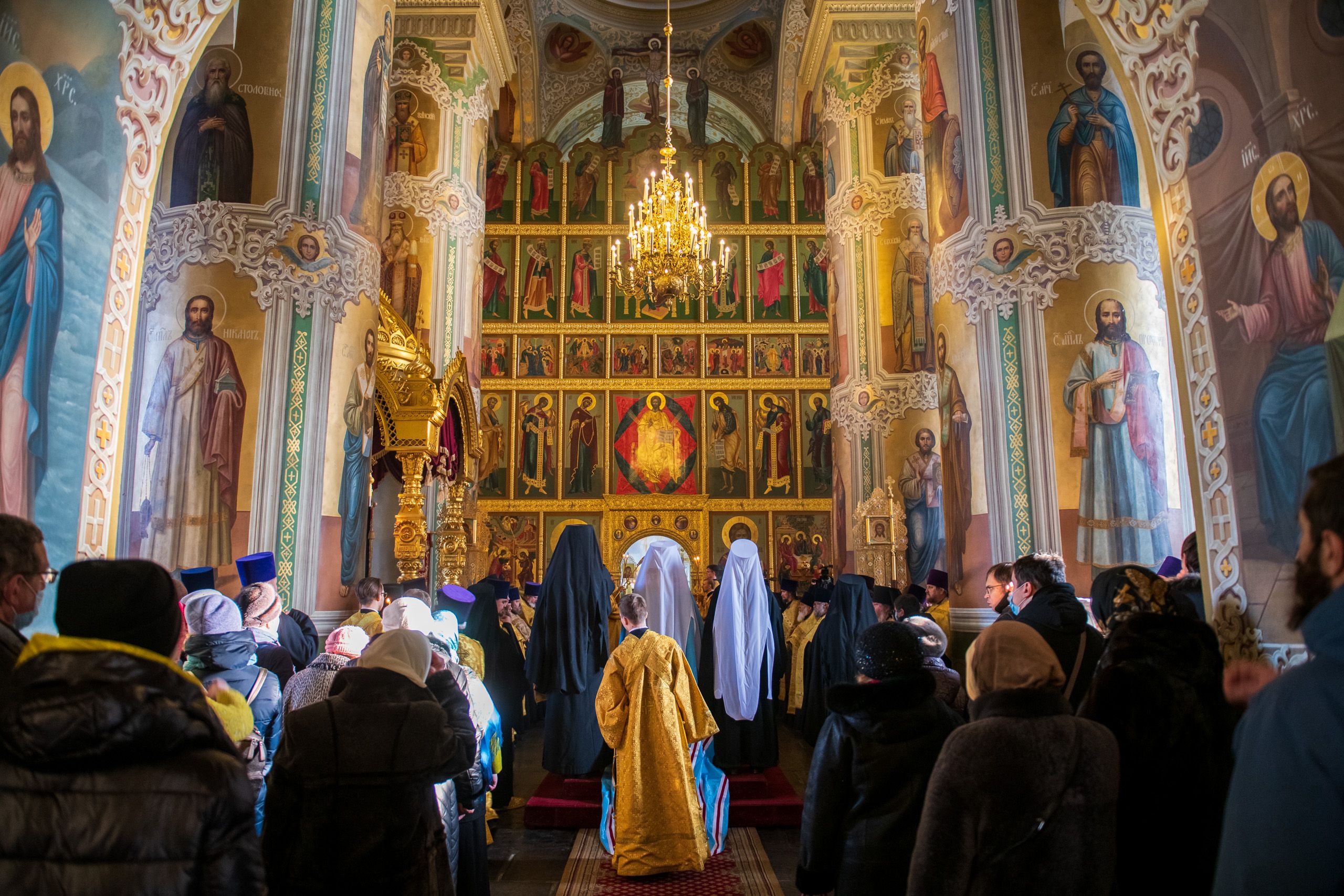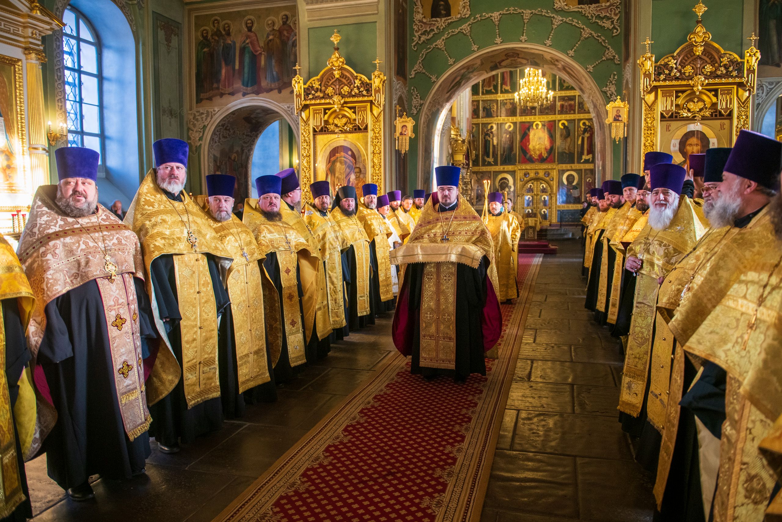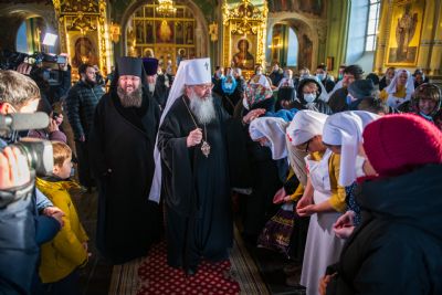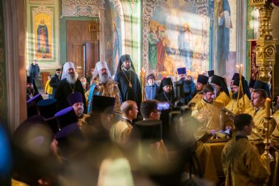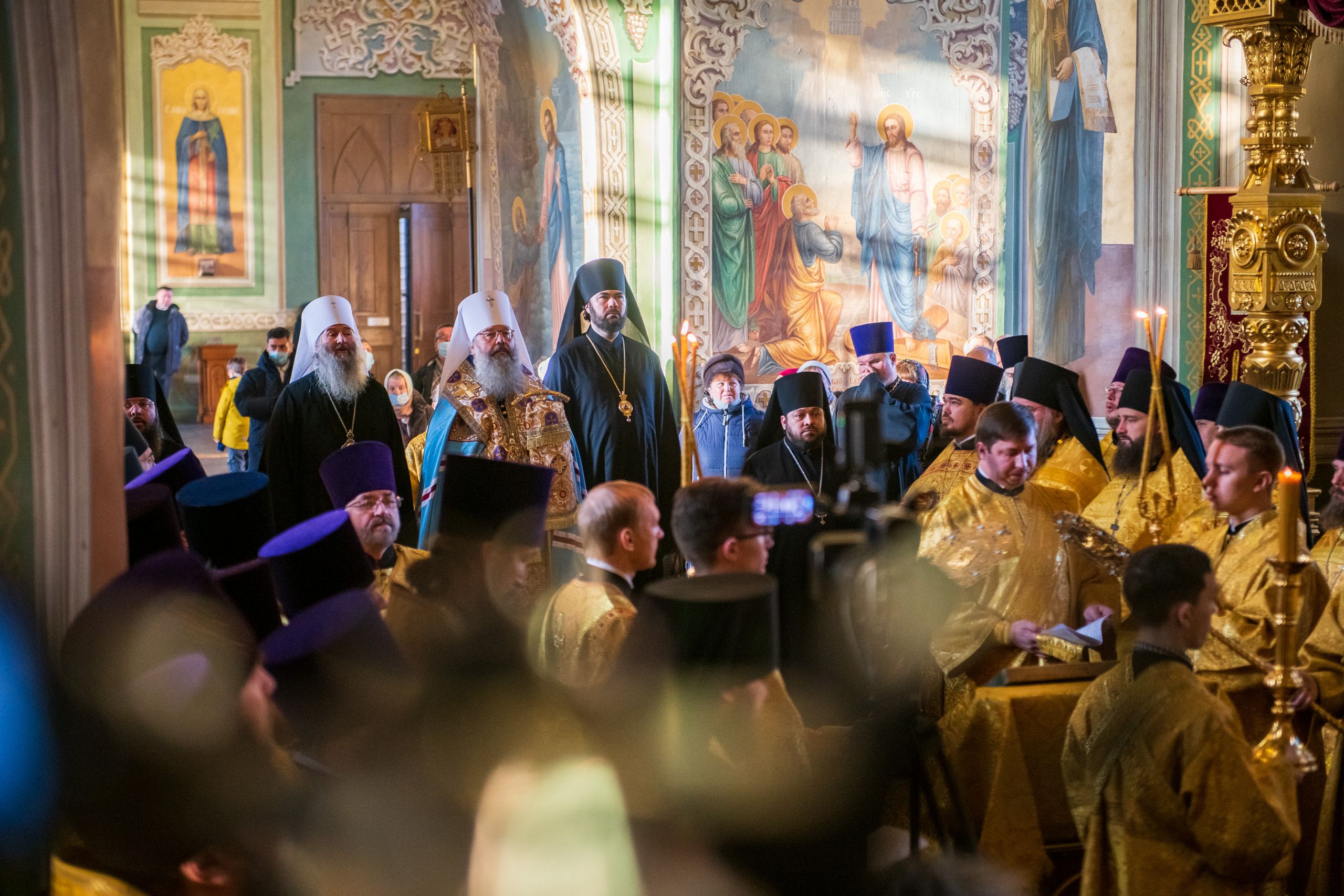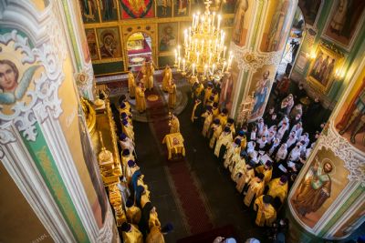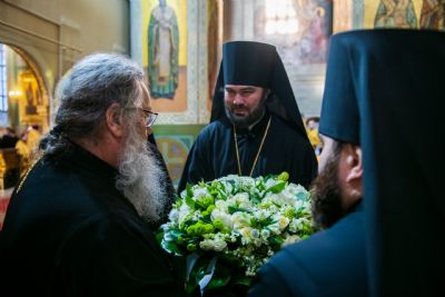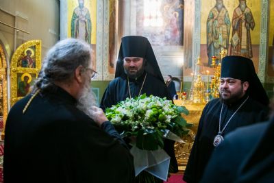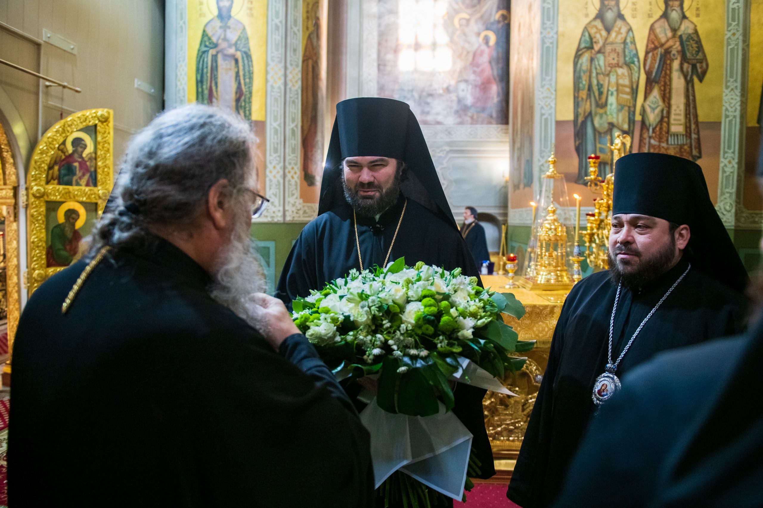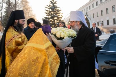 В соборном храме архипастыря встречали Преосвященные архипастыри, благочинные, настоятели, наместники и настоятельницы монастырей Казанской епархии. С амвона митрополит Кирилл обратился ко всем присутствующим с приветственным словом:
