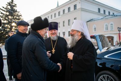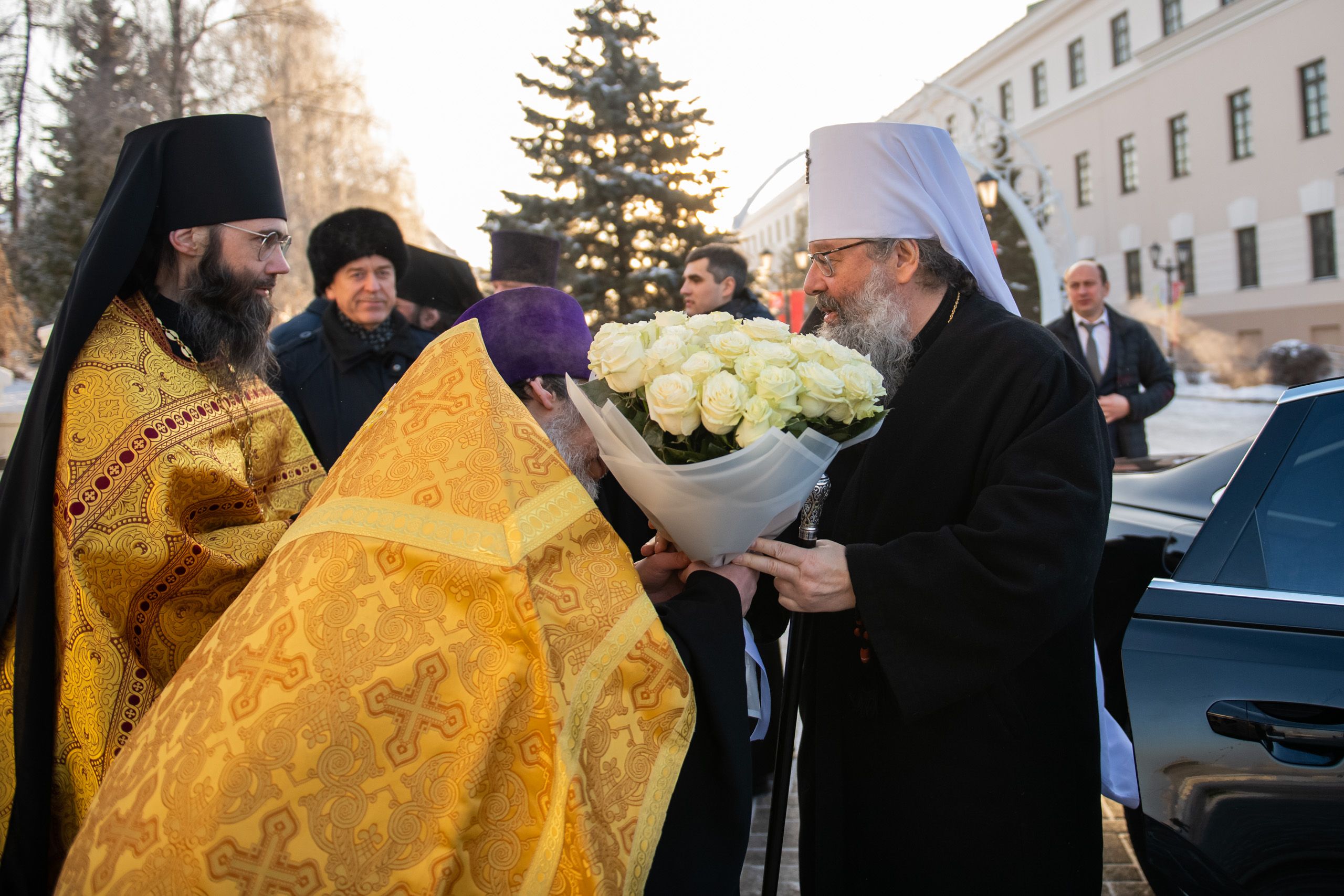 Перед входом в храм митрополита Кирилла приветствовали заместитель руководителя Аппарата Президента Республики Татарстан — руководитель Департамента Президента РТ по вопросам внутренней политики Александр Терентьев, заместитель руководителя Департамента Президента РТ по вопросам внутренней политики Руслан Мухарлямов, директор Государственного историко-архитектурного и художественного музея-заповедника «Казанский Кремль» Айрат Сибагатуллин. Состоялось краткое общение новоназначенного главы Татарстанской митрополии с представителями республиканской государственной власти.