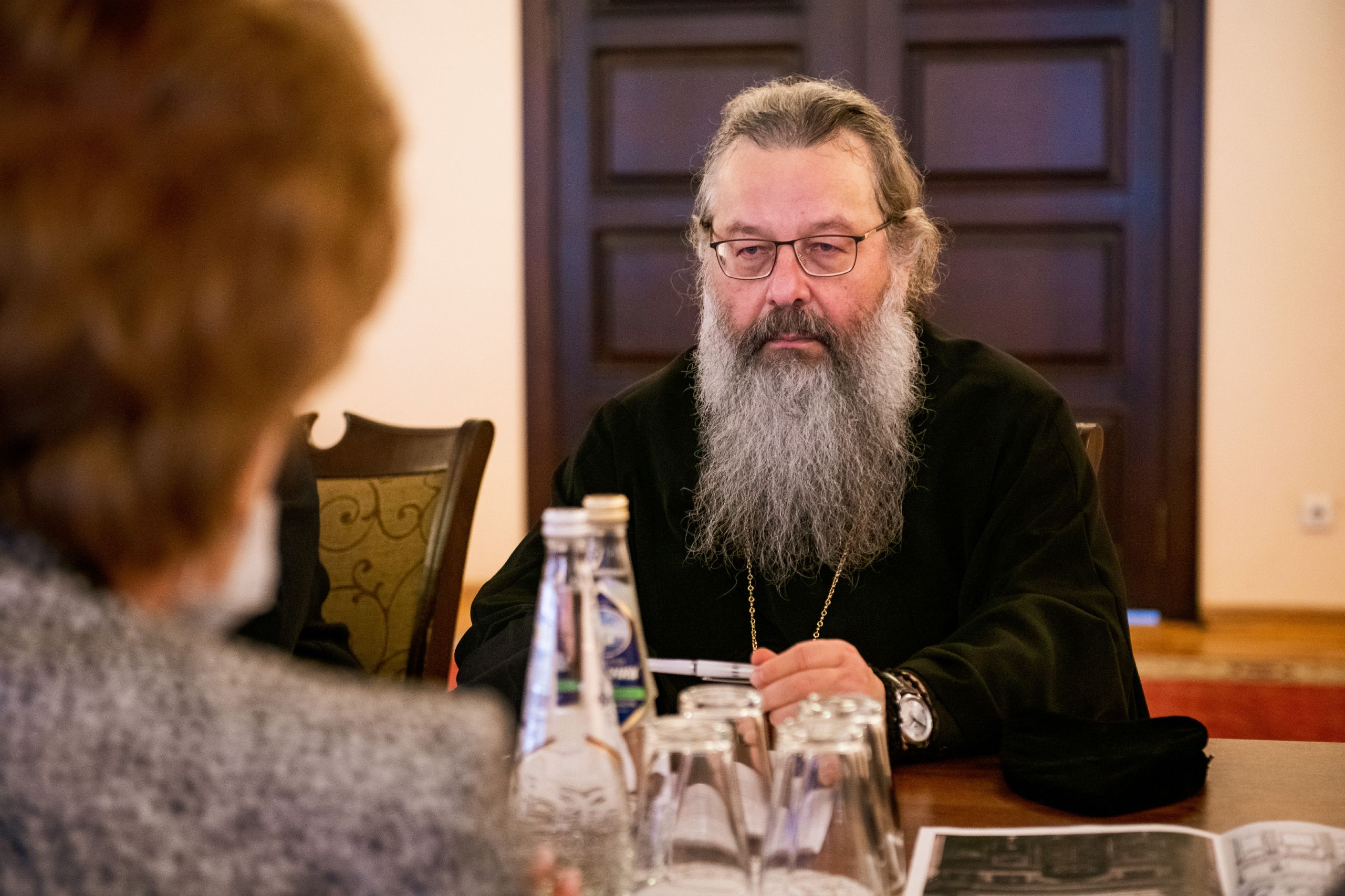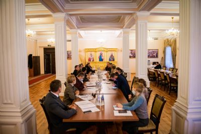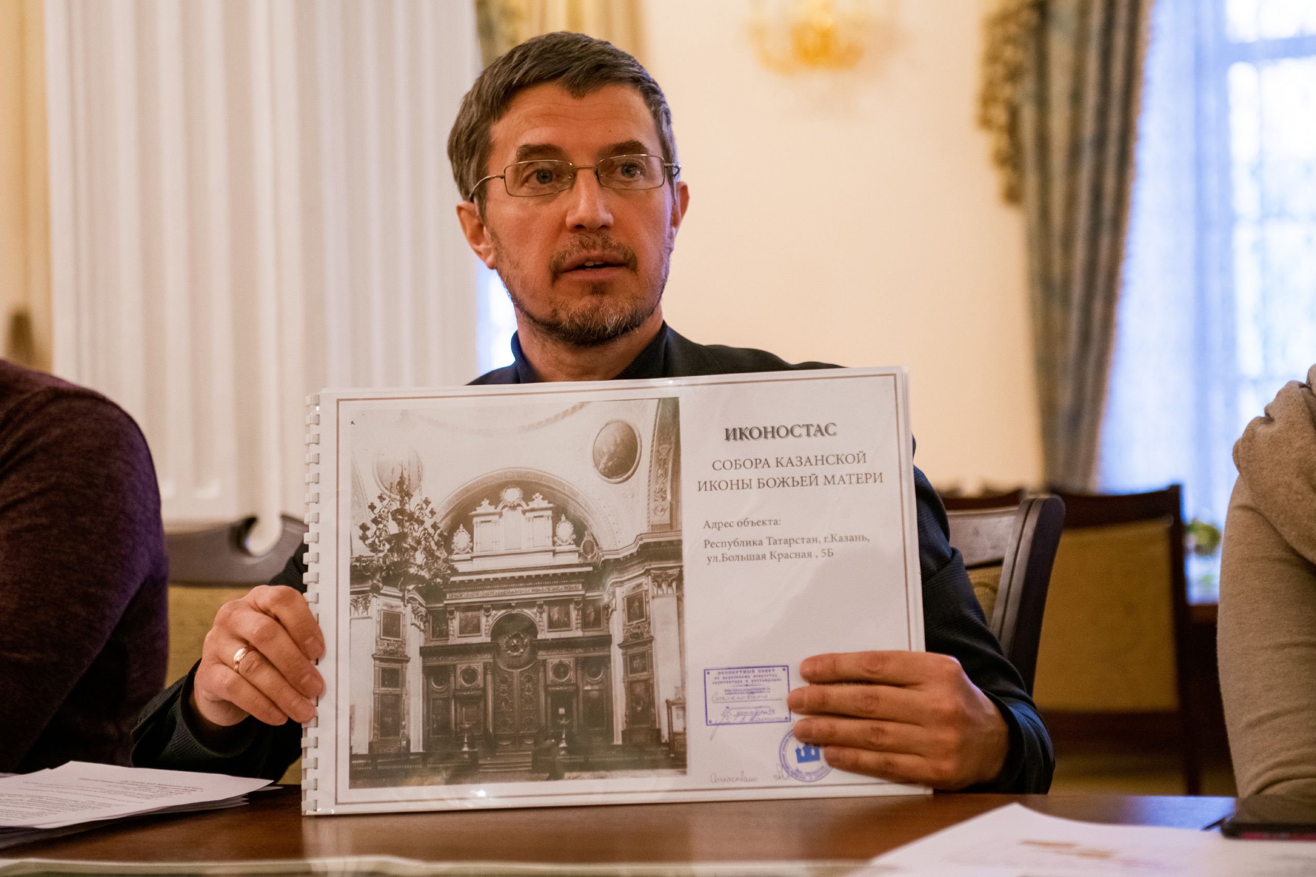 Михаил Федотов также рассказал об особенностях эскизного и рабочего проектов иконостасов Казанского собора, выборе материалов и текущих работах по изготовлению иконостасов. Главный епархиальный инженер представил фотоотчёт об изготовленных Царских вратах. В настоящее время также завершены работы по изготовлению резного и бронзового декора всех иконостасов