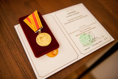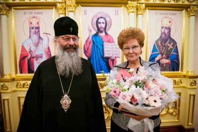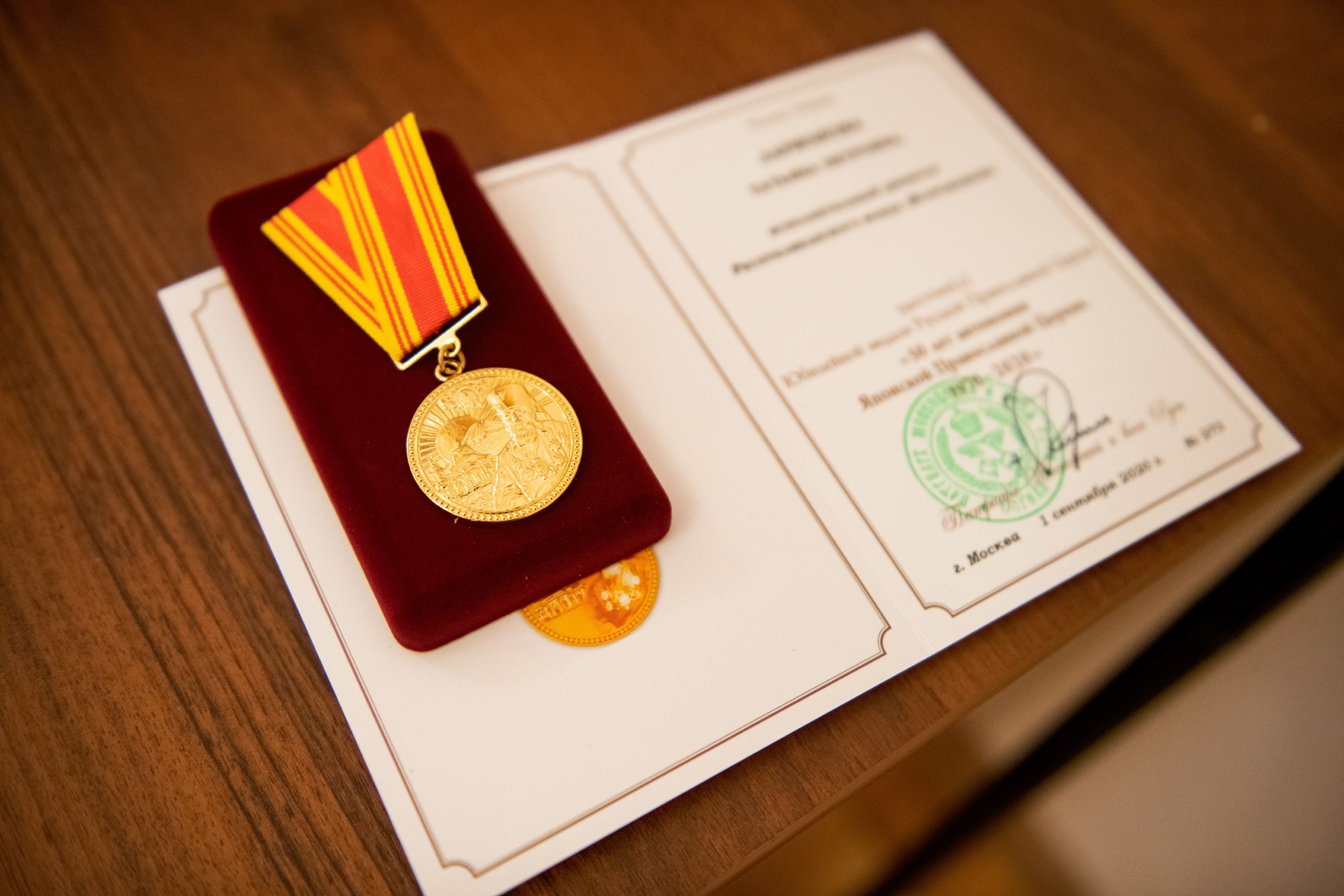В завершение рабочей встречи митрополит Кирилл по благословению Святейшего Патриарха Кирилла вручил исполнительному директору Фонда «Возрождение» Татьяне Петровне Ларионовой в знак благодарности за многолетние труды юбилейную медаль Русской Православной Церкви «50 лет автономии Японской Православной Церкви (1970-2020)».