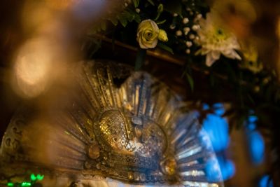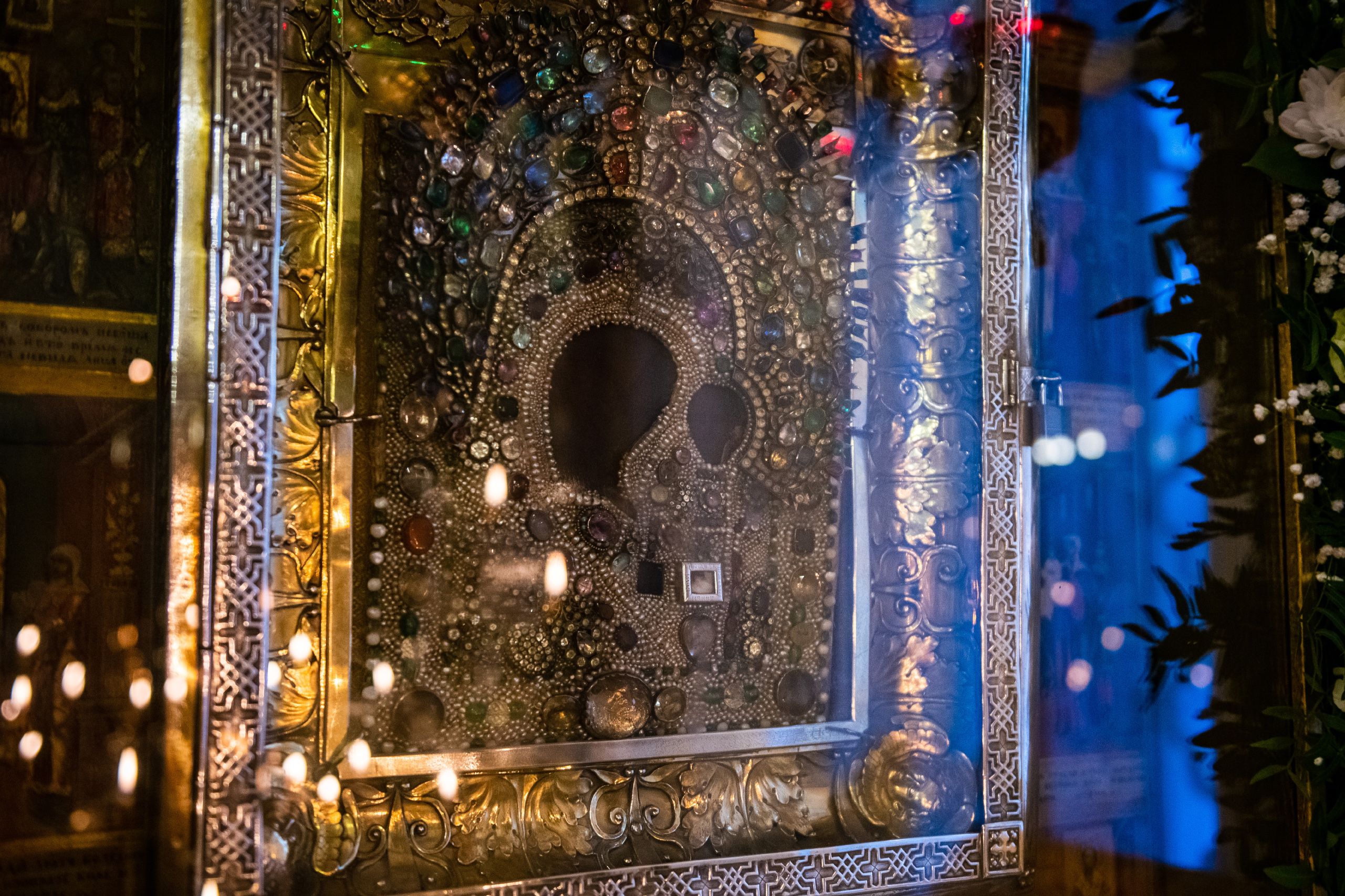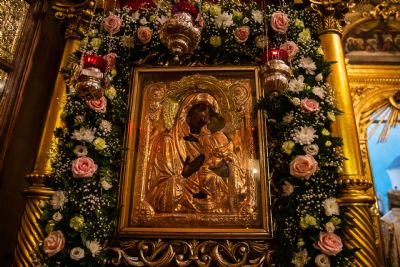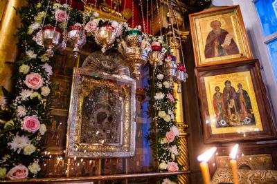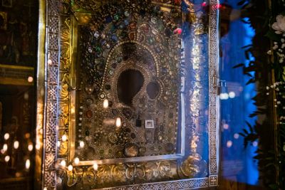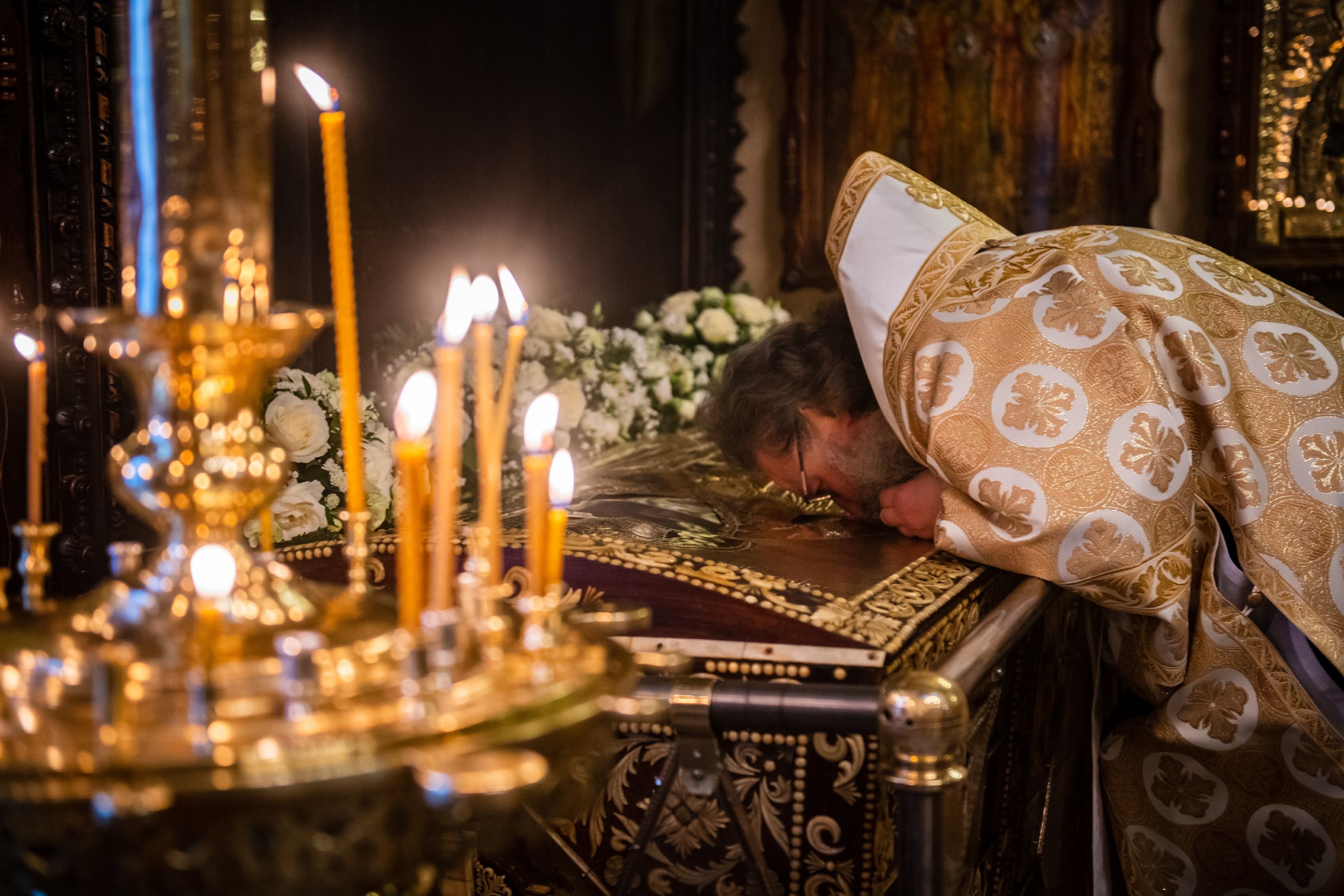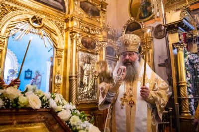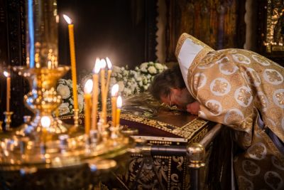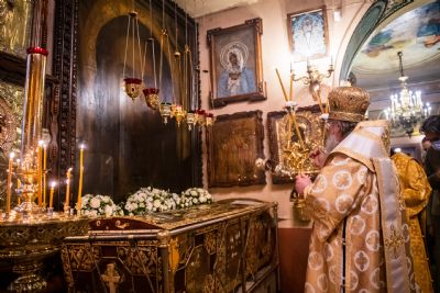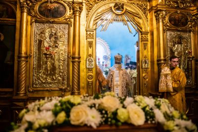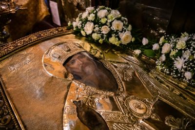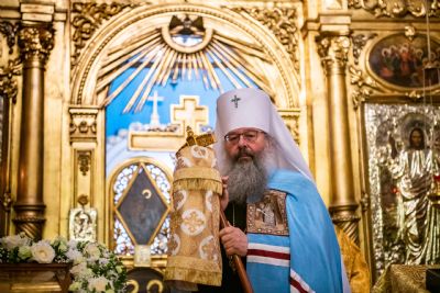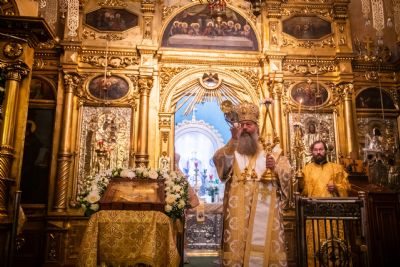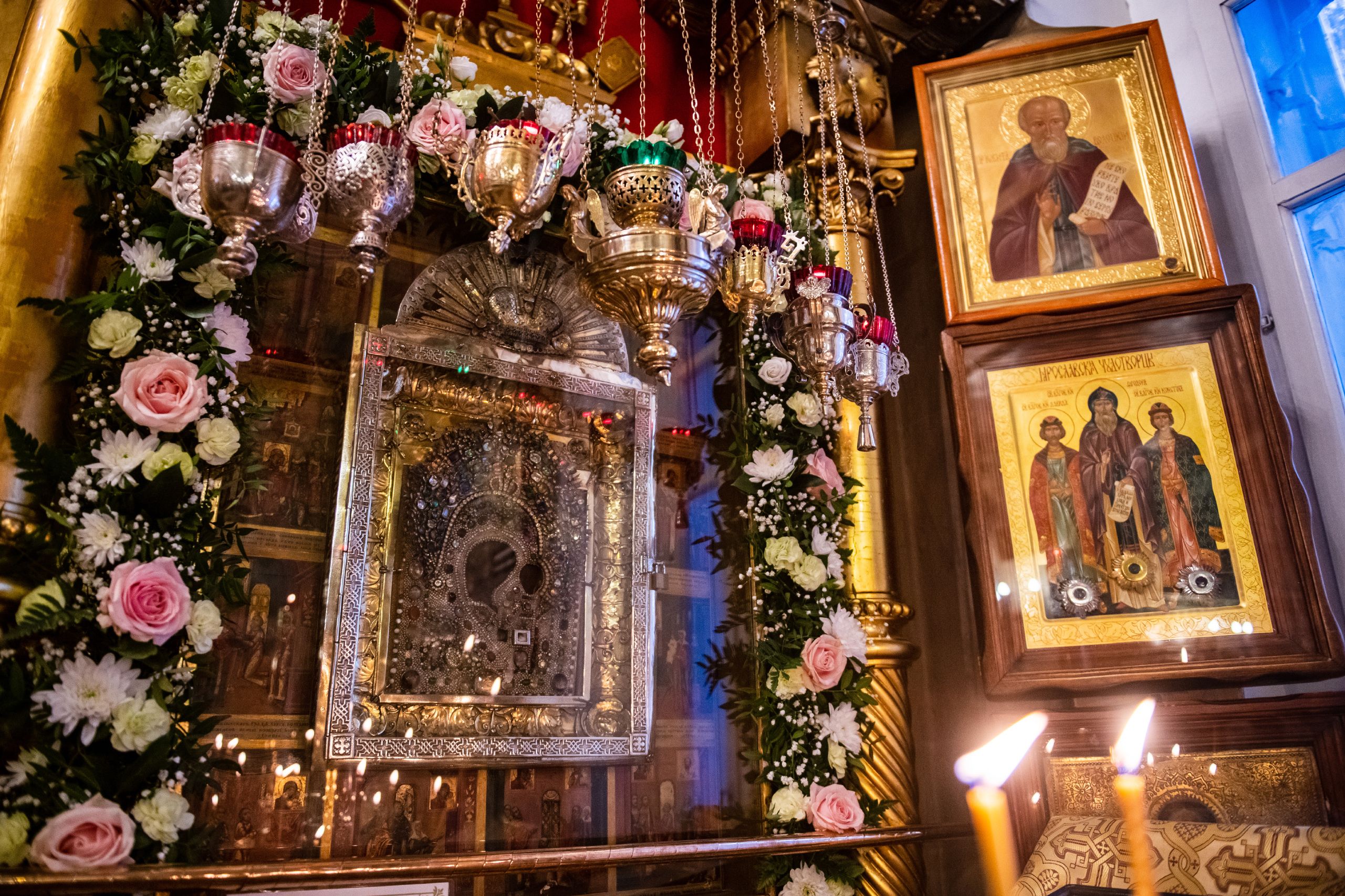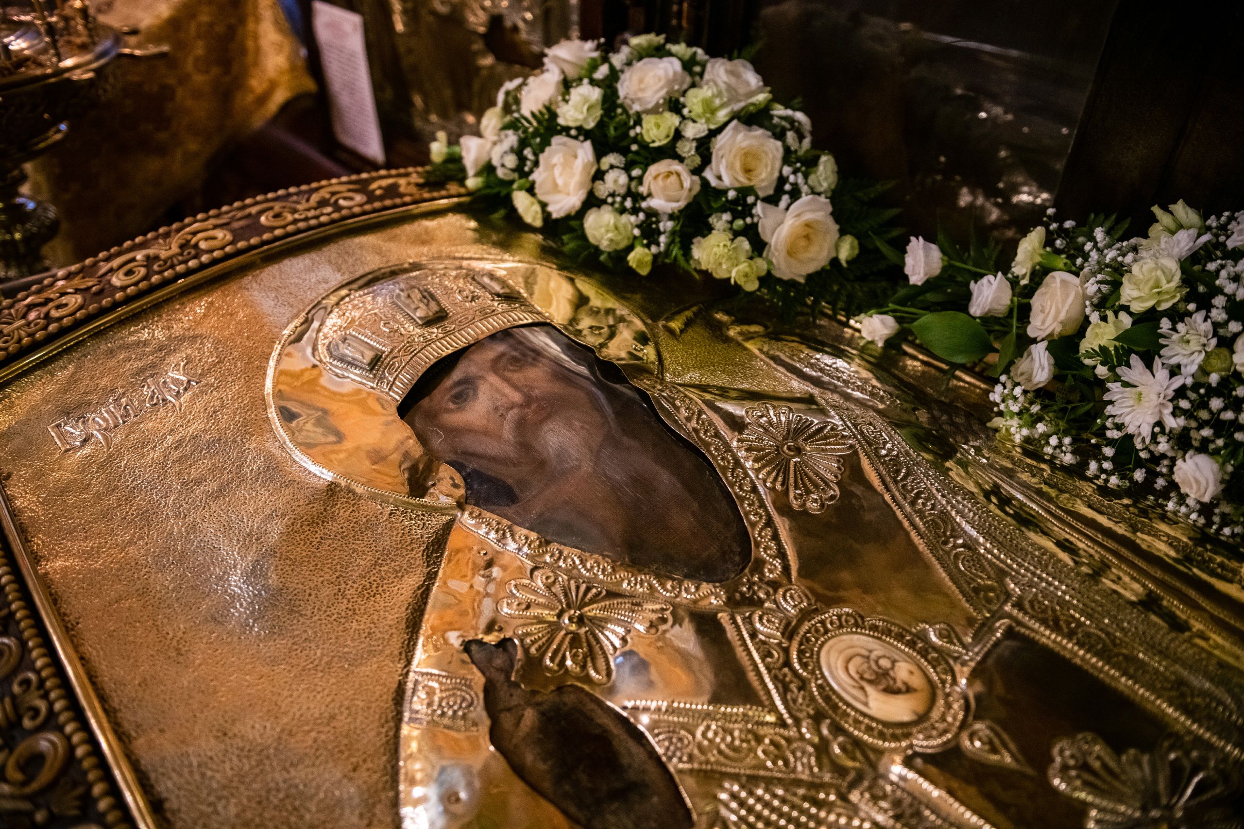 Перед началом Литургии глава Татарстанской митрополии поклонился раке с честными мощами святителя Гурия и древним спискам икон Божией Матери «Казанская» и «Толгская».
