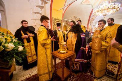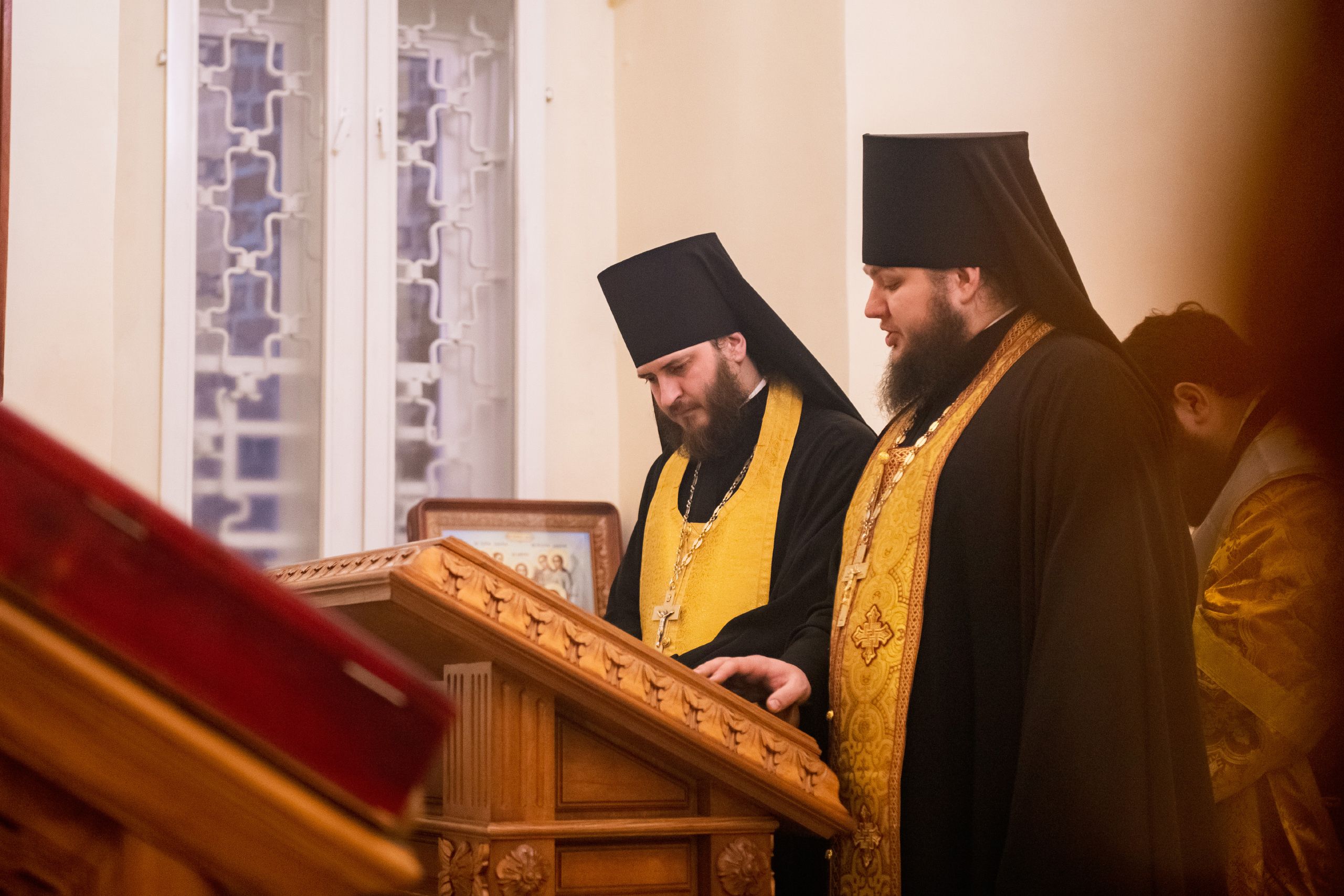 Архипастырям сослужили секретарь Татарстанской митрополии иеромонах Кирилл (Корытко), секретарь Казанского епархиального управления протоиерей Владимир Самойленко, настоятель Введенского Кизического мужского монастыря игумен Пимен (Ивентьев), настоятель Никольского храма иерей Валерий Карпухин, заведующий канцелярией Казанской епархии протоиерей Александр Павлов, настоятель храма преподобного Сергия Радонежского города Казани иерей Сергий Петров, иеромонах Филипп (Киселёв), иеромонах Алексий (Яцейко).