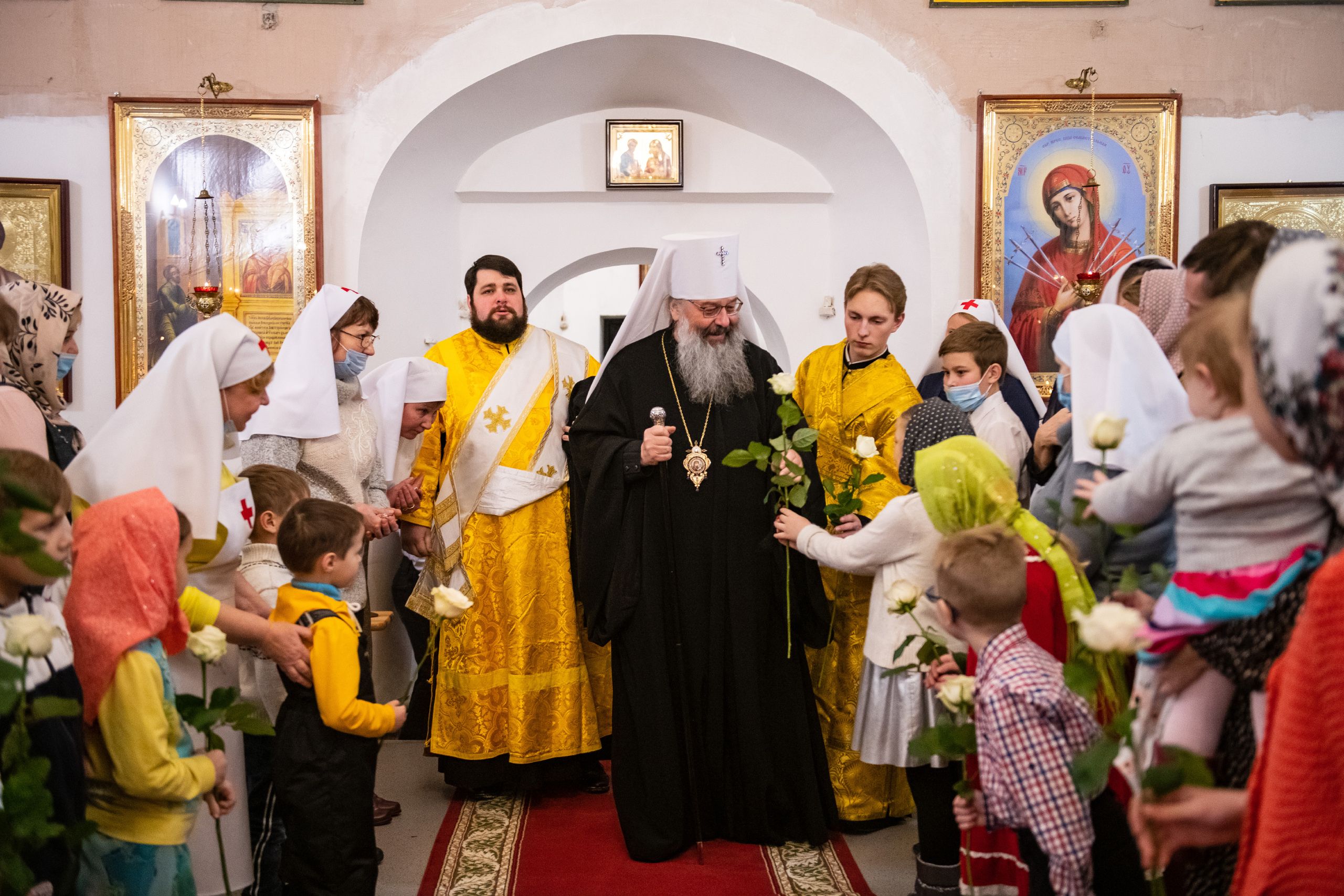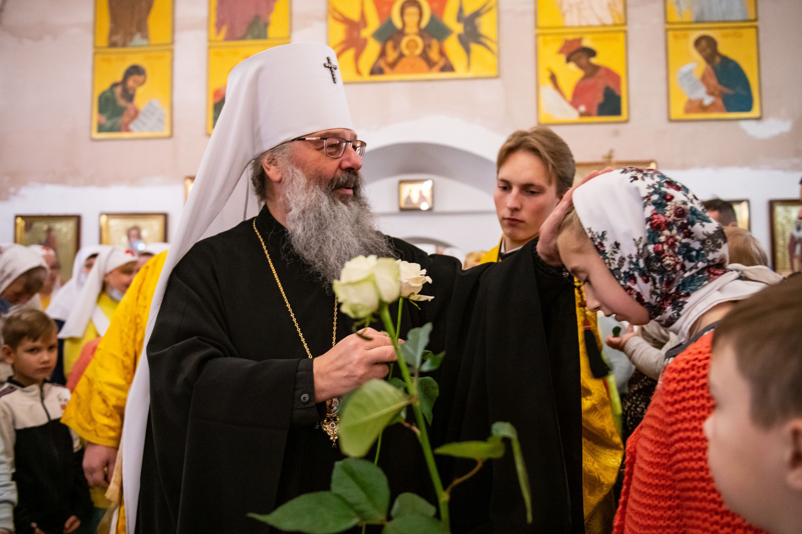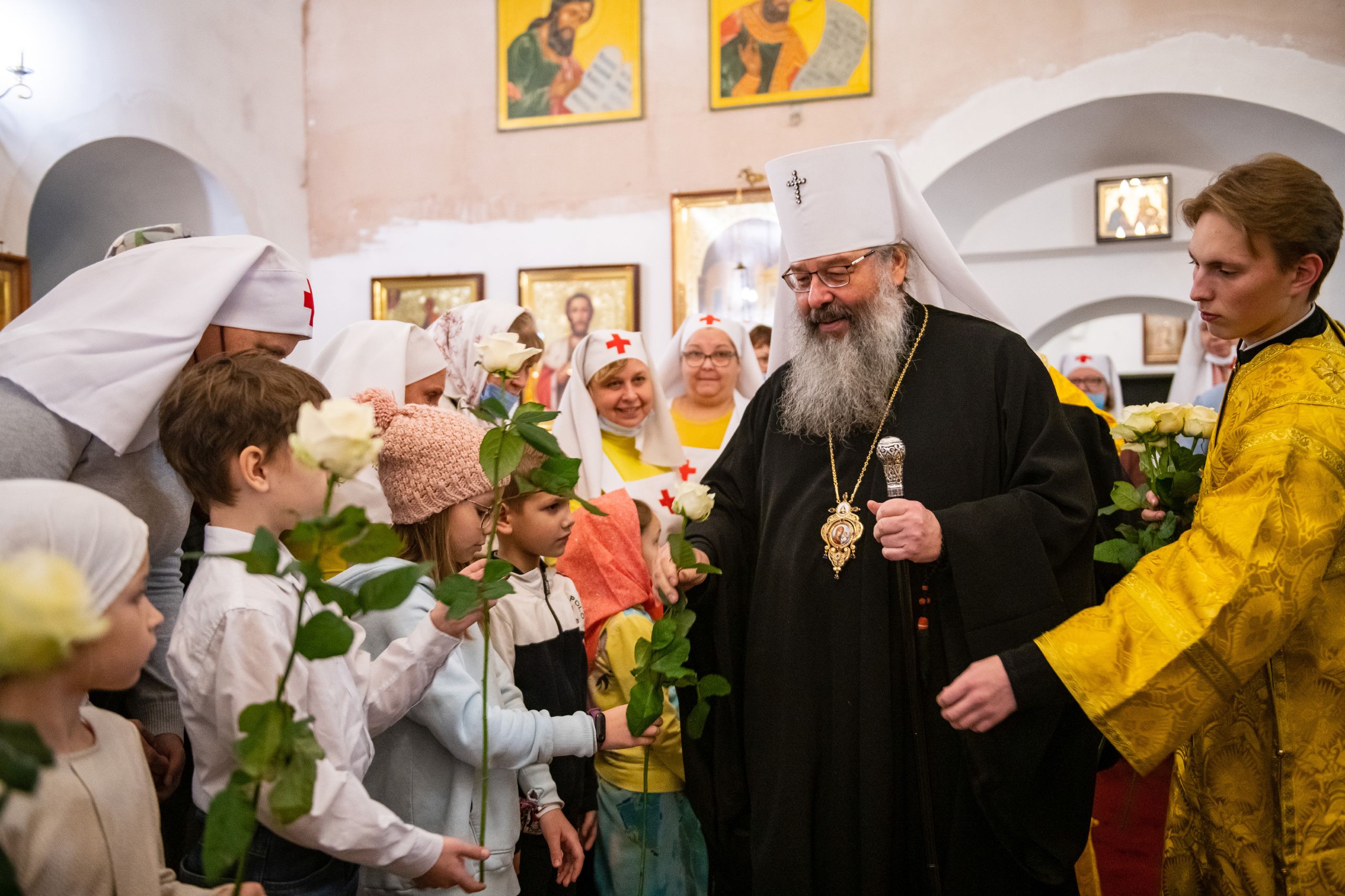 Перед началом богослужения владыку Кирилла приветствовали учащиеся воскресной школы, действующей при подворье.