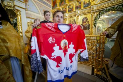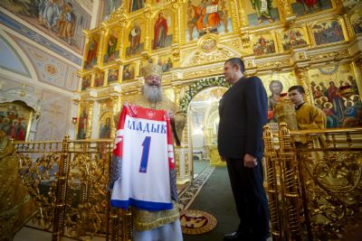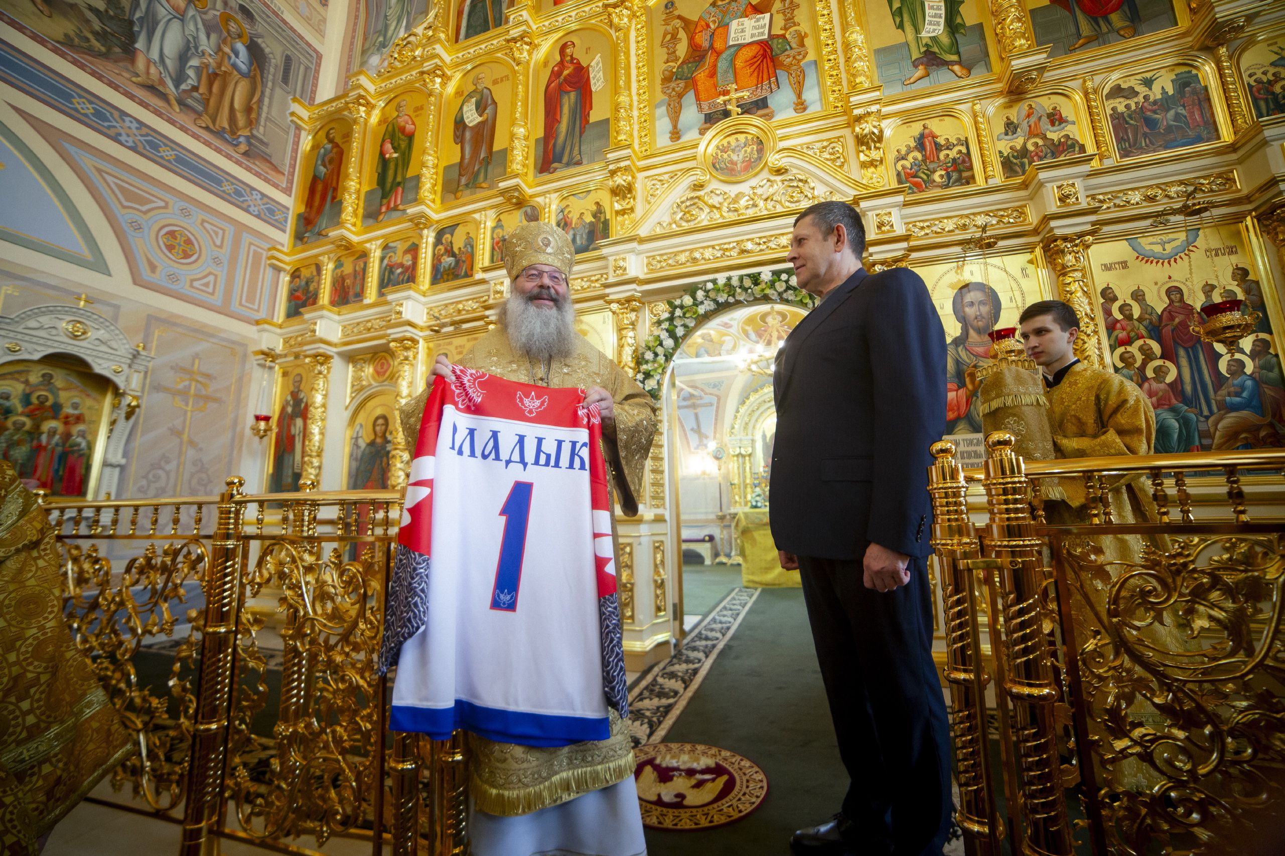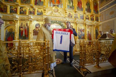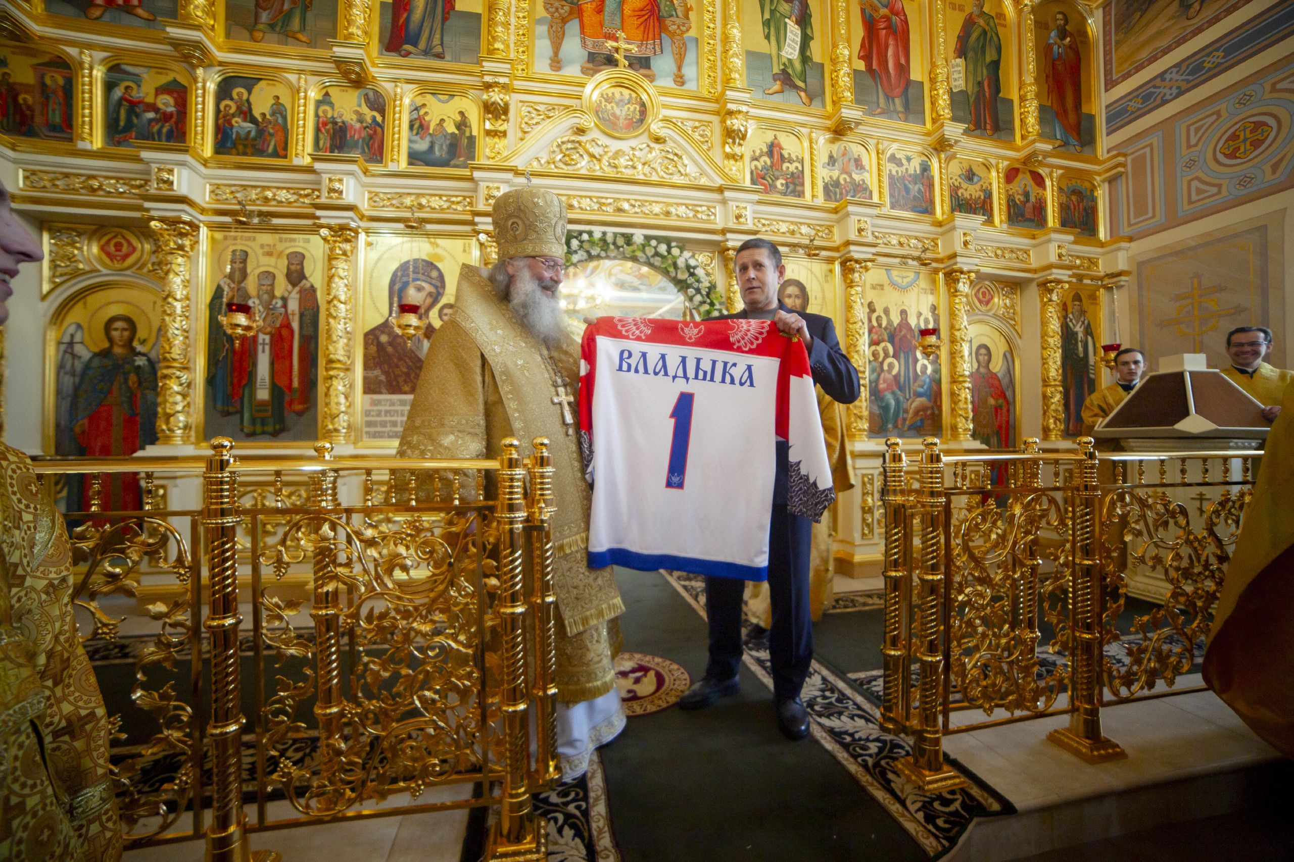 Далее архипастыря приветствовал вице-президент Федерации хоккея Республики Татарстан Андрей Рябов. От имени хоккейной команды Духосошественского храма «Добрыня» Андрей Александрович вручил митрополиту Кириллу майку почётного капитана с надписью «Владыка».