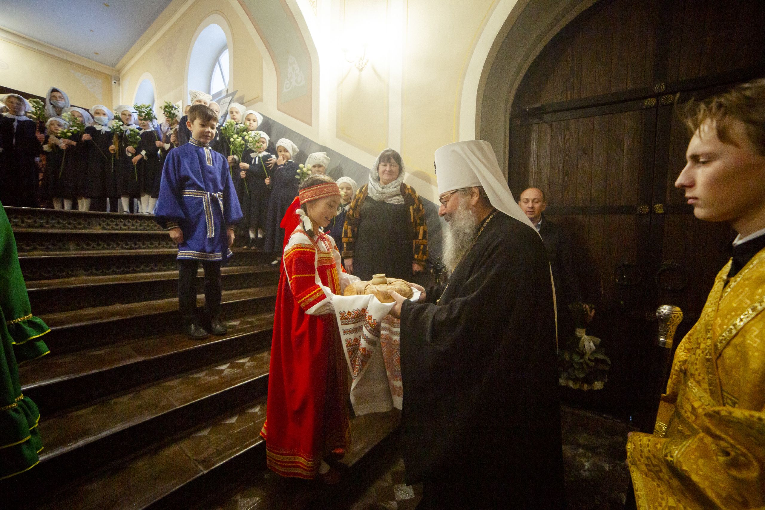 Перед входом в храм главу Татарстанской митрополии с цветами и хлебом-солью встречали воспитанники православной гимназии имени святителя Гурия Казанского.