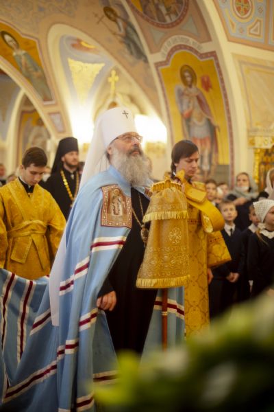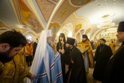 По окончании праздничного богослужения духовенство пропело славление Пресвятой Богородице. Его Высокопреосвященство окропил всех молящихся святой водой. Митрополит Кирилл поздравил участников богослужения с воскресным днём, Неделей святых праотец и пятилетием освящения храма.