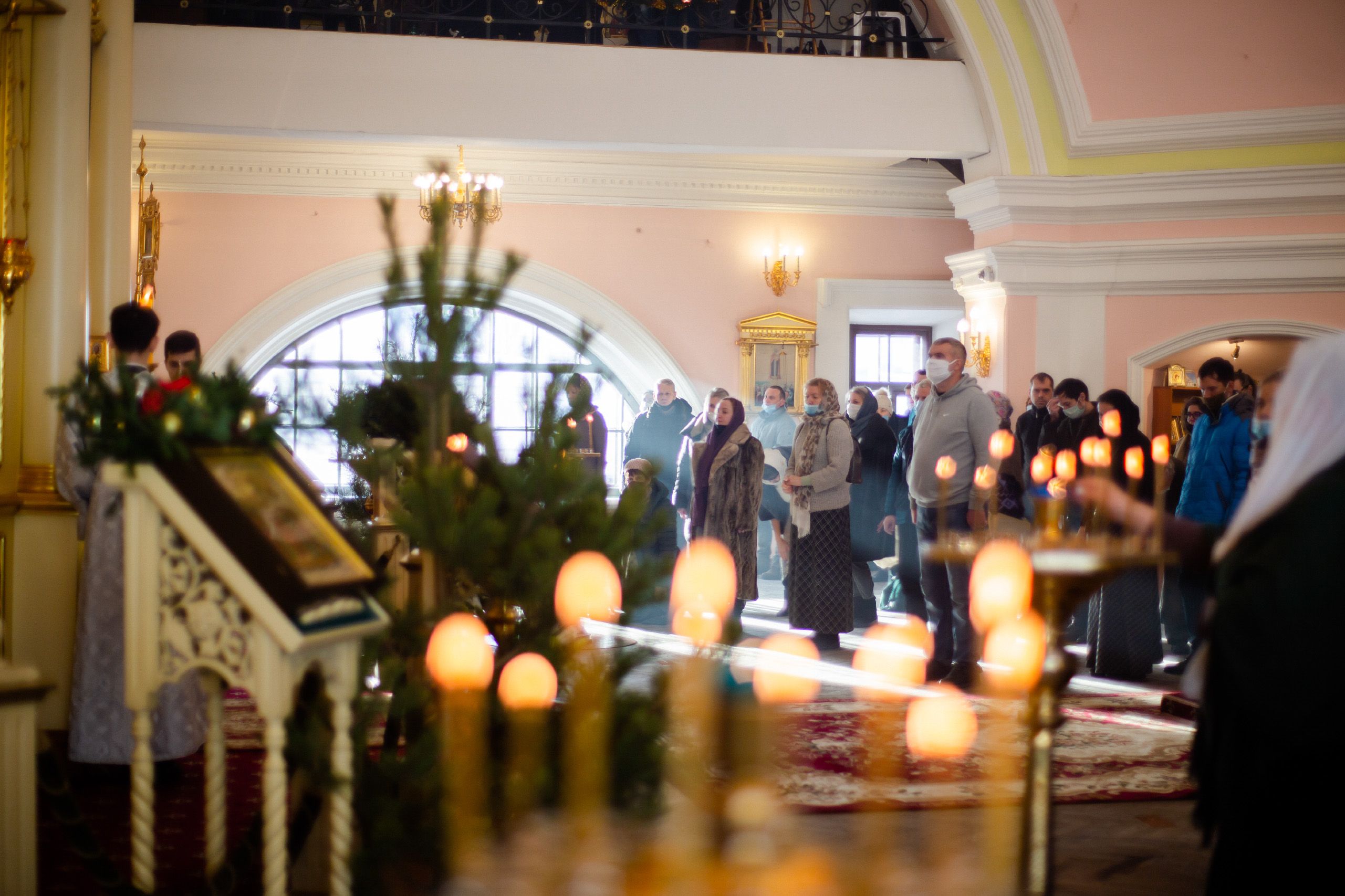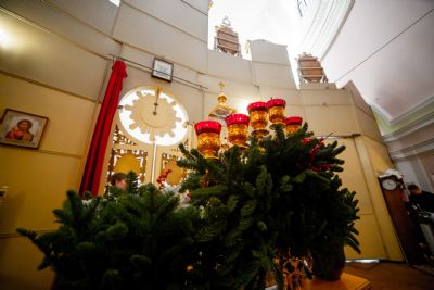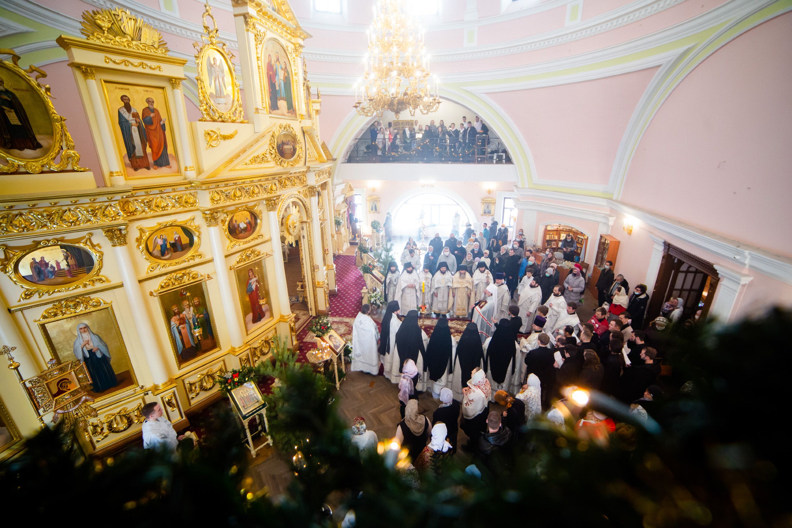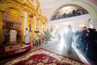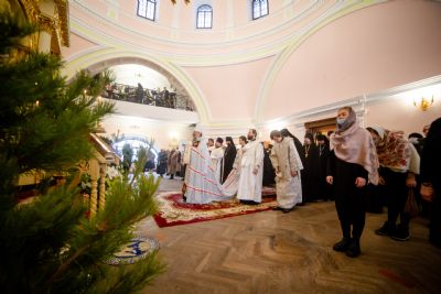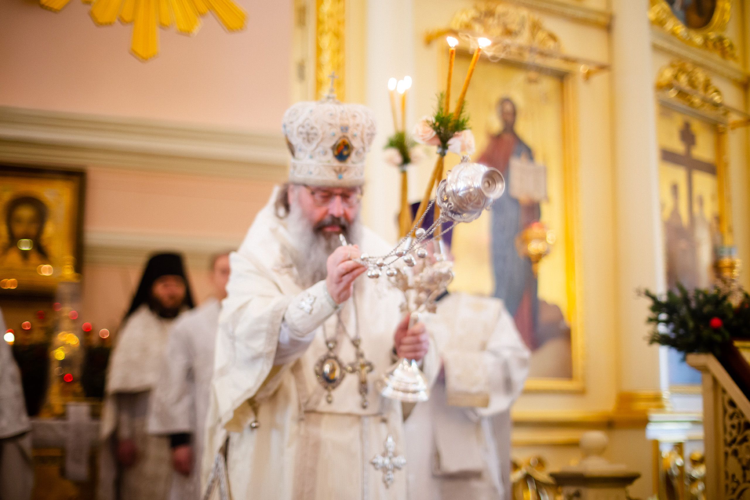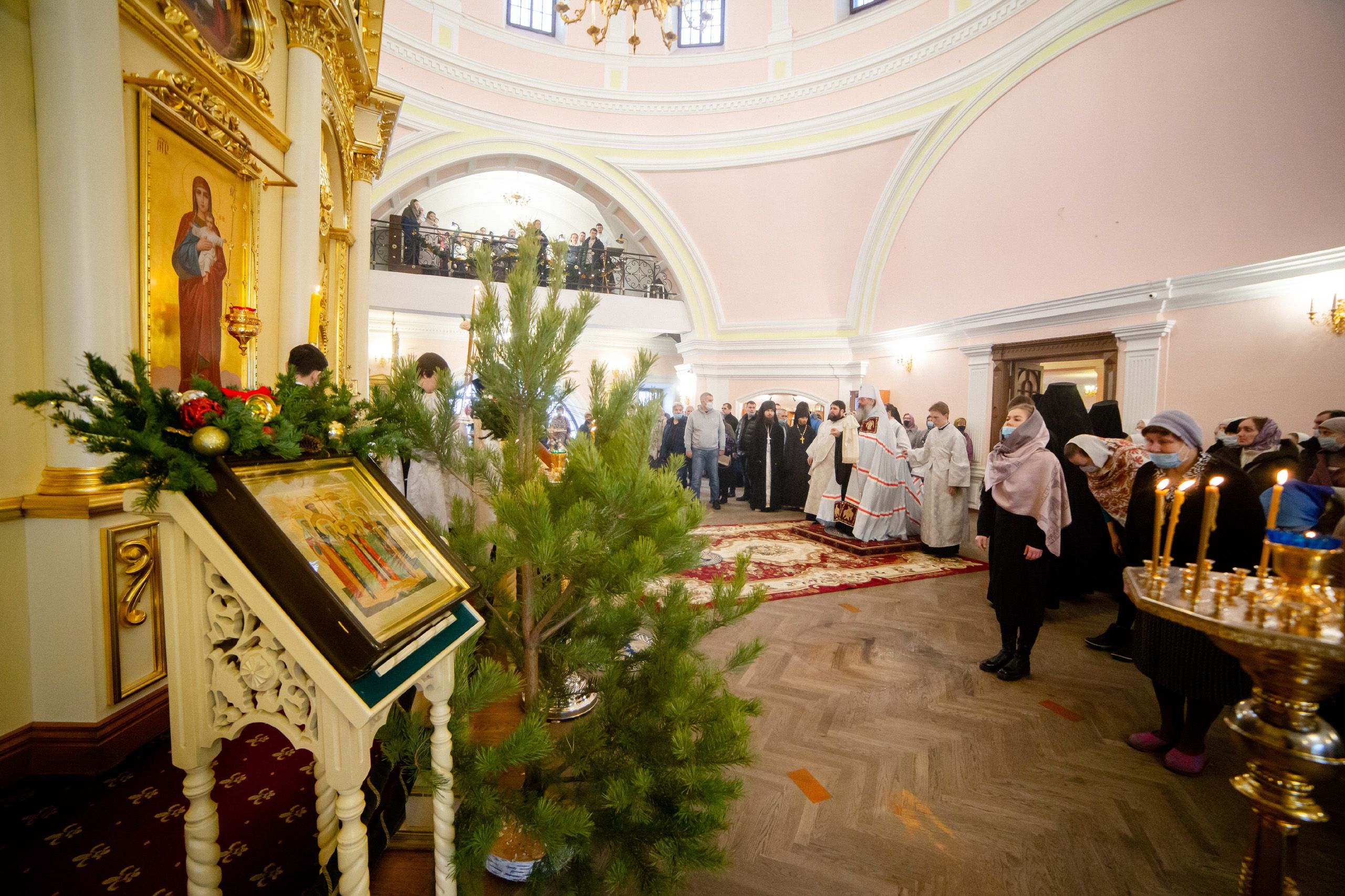По отпусте Литургии на середину храма была вынесена свеча, символизирующая звезду, возвестившую о долгожданном Рождении Спасителя. Изшедшие из алтаря архипастырь и священнослужители пропели тропарь и кондак праздника Рождества Христова.