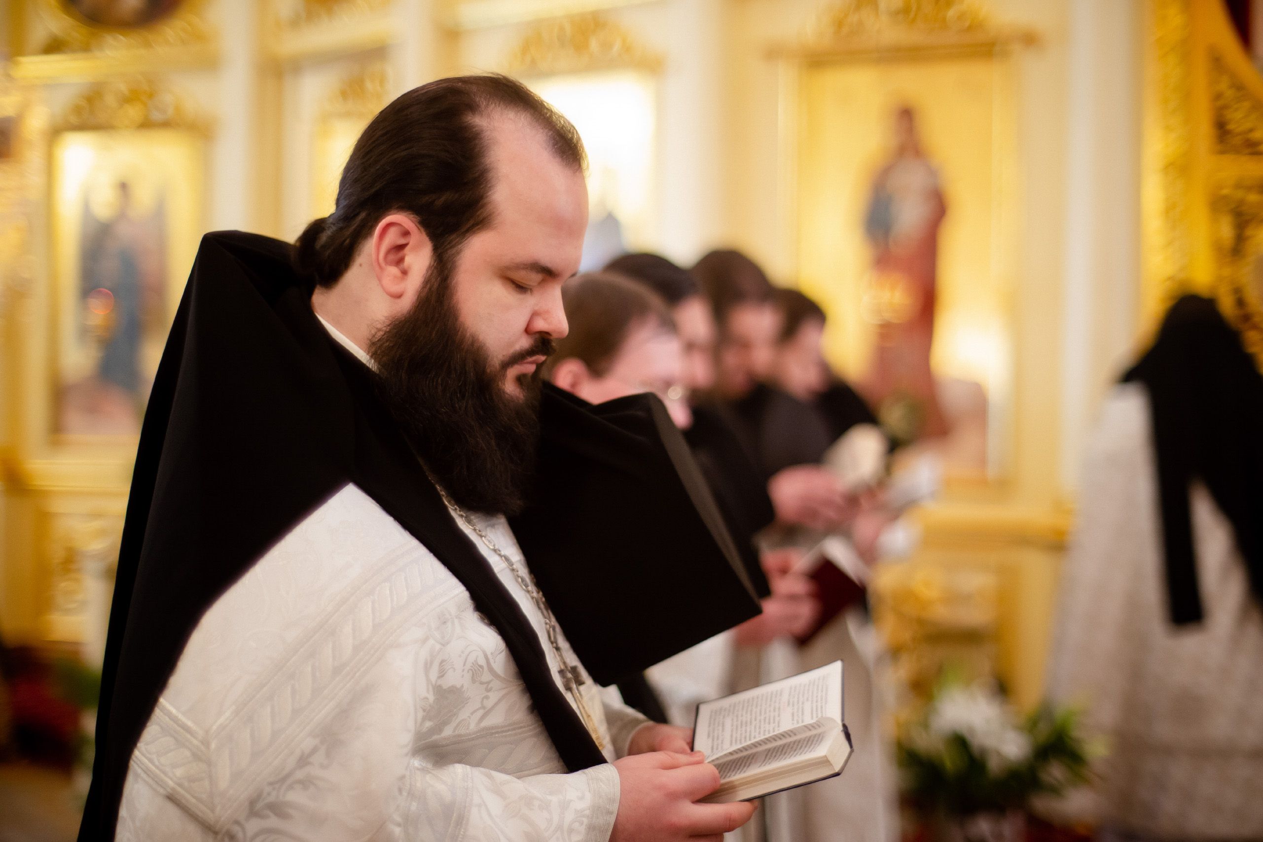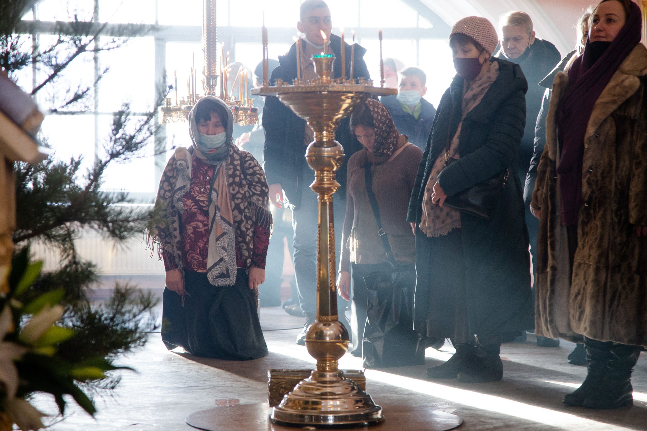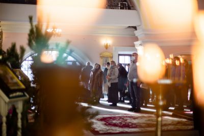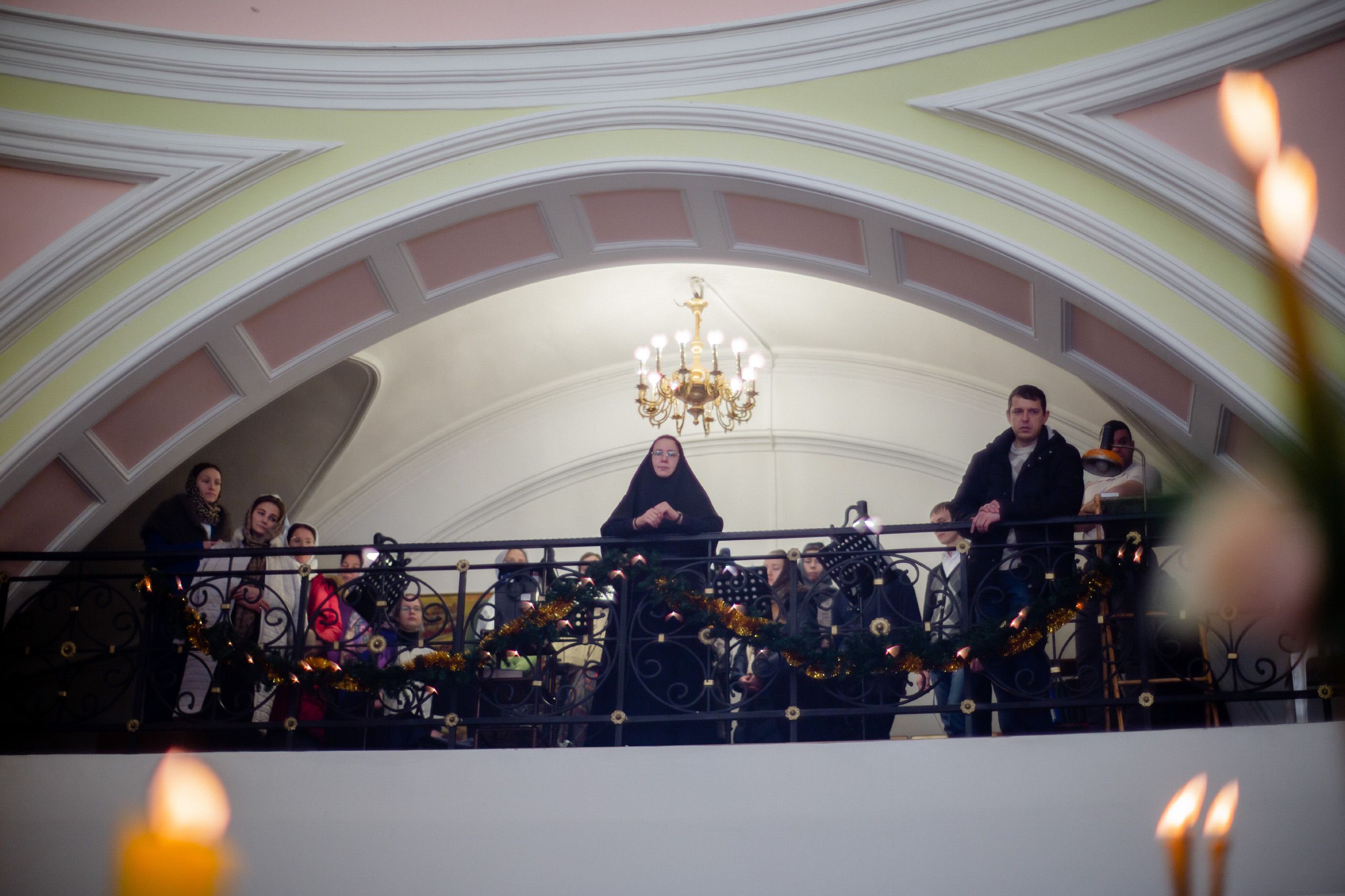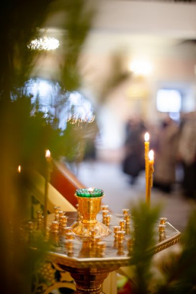 По отпусте Литургии на середину храма была вынесена свеча, символизирующая звезду, возвестившую о долгожданном Рождении Спасителя. Изшедшие из алтаря архипастырь и священнослужители пропели тропарь и кондак праздника Рождества Христова.