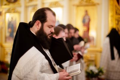 После входа с Евангелием за вечерней были прочитаны восемь паремий праздника. Перед причастием иеромонах Кирилл (Корытко) произнёс проповедь.