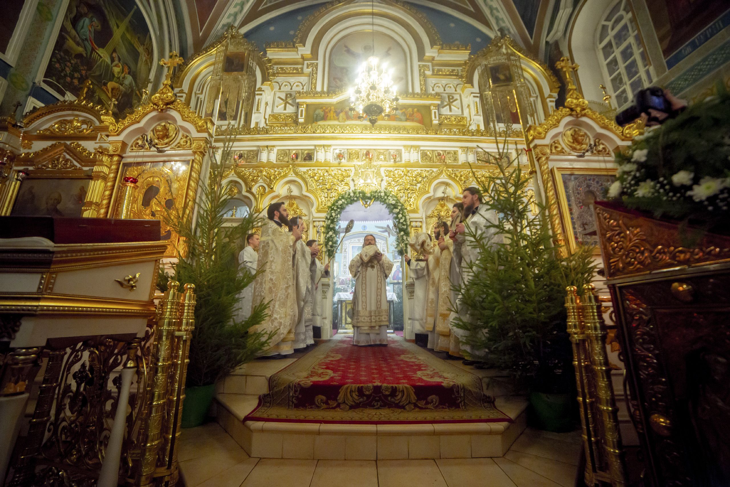 В конце Литургии архипастырь с духовенством на середине храма пропели тропарь, кондак и величание Рождества Христова.