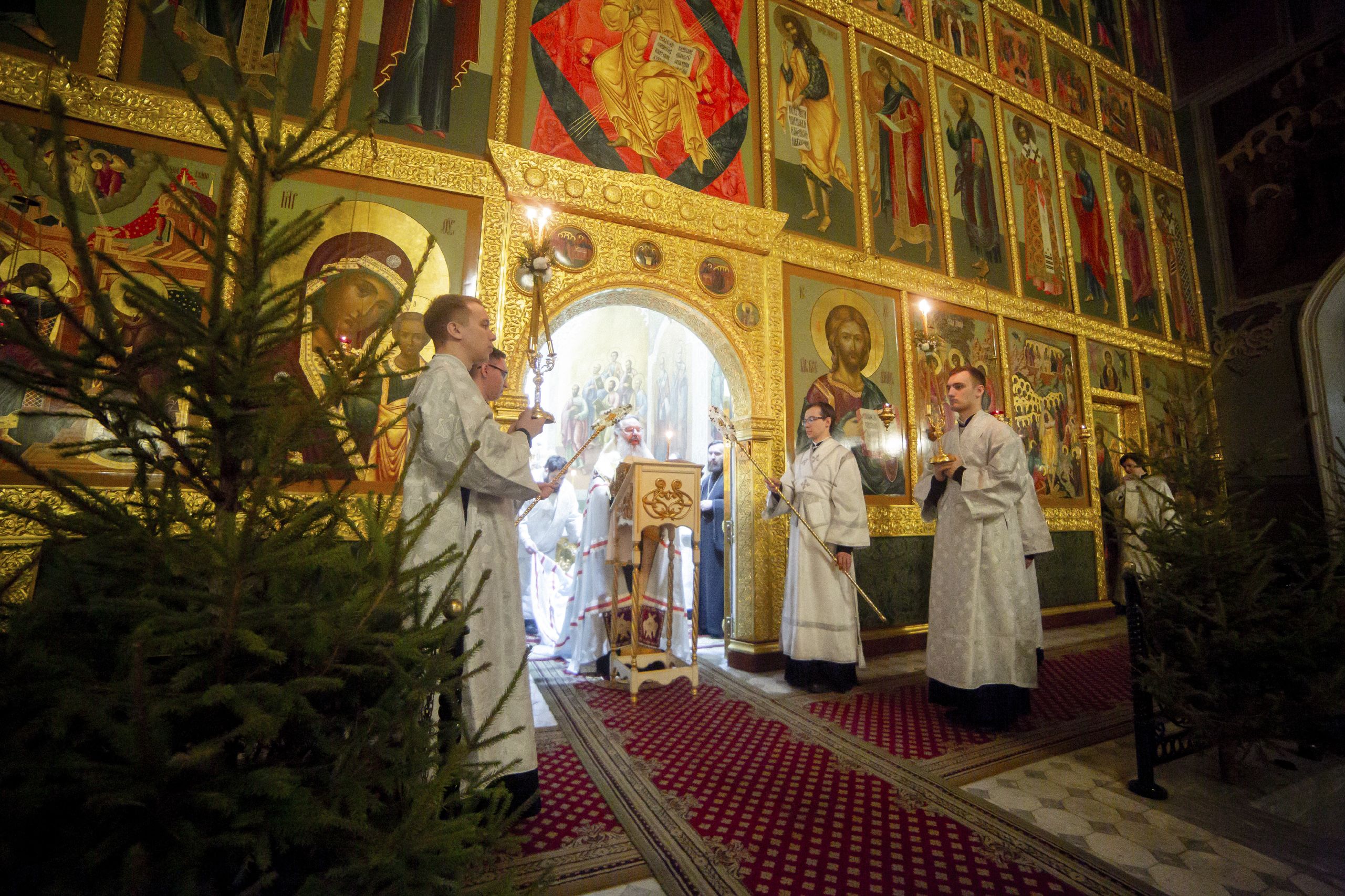 После малого входа в алтаре диакон Димитрий Вивчер и хор духовенства пропели великий прокимен «Кто Бог велий…» В конце вечернего богослужения архипастыри и духовенство на середине храма пропели тропарь, кондак и величание праздника Рождества Христова.