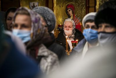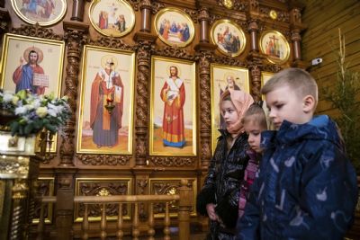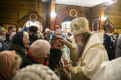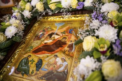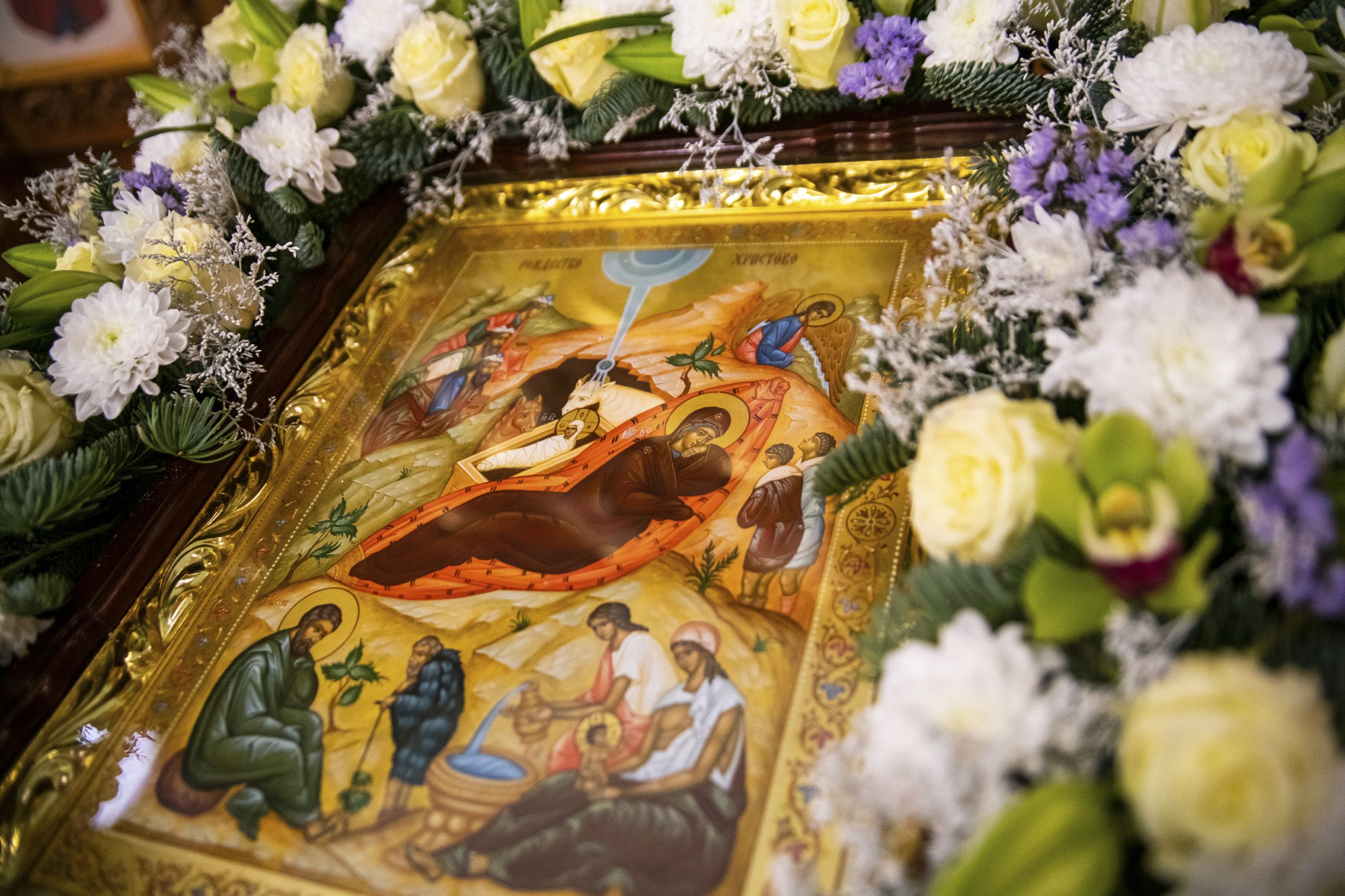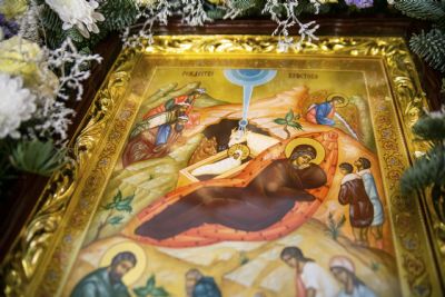 После отпуста священнослужители на середине храма перед праздничной иконой совершили славление празднику Рождества, пропев тропарь, кондак и величание.
