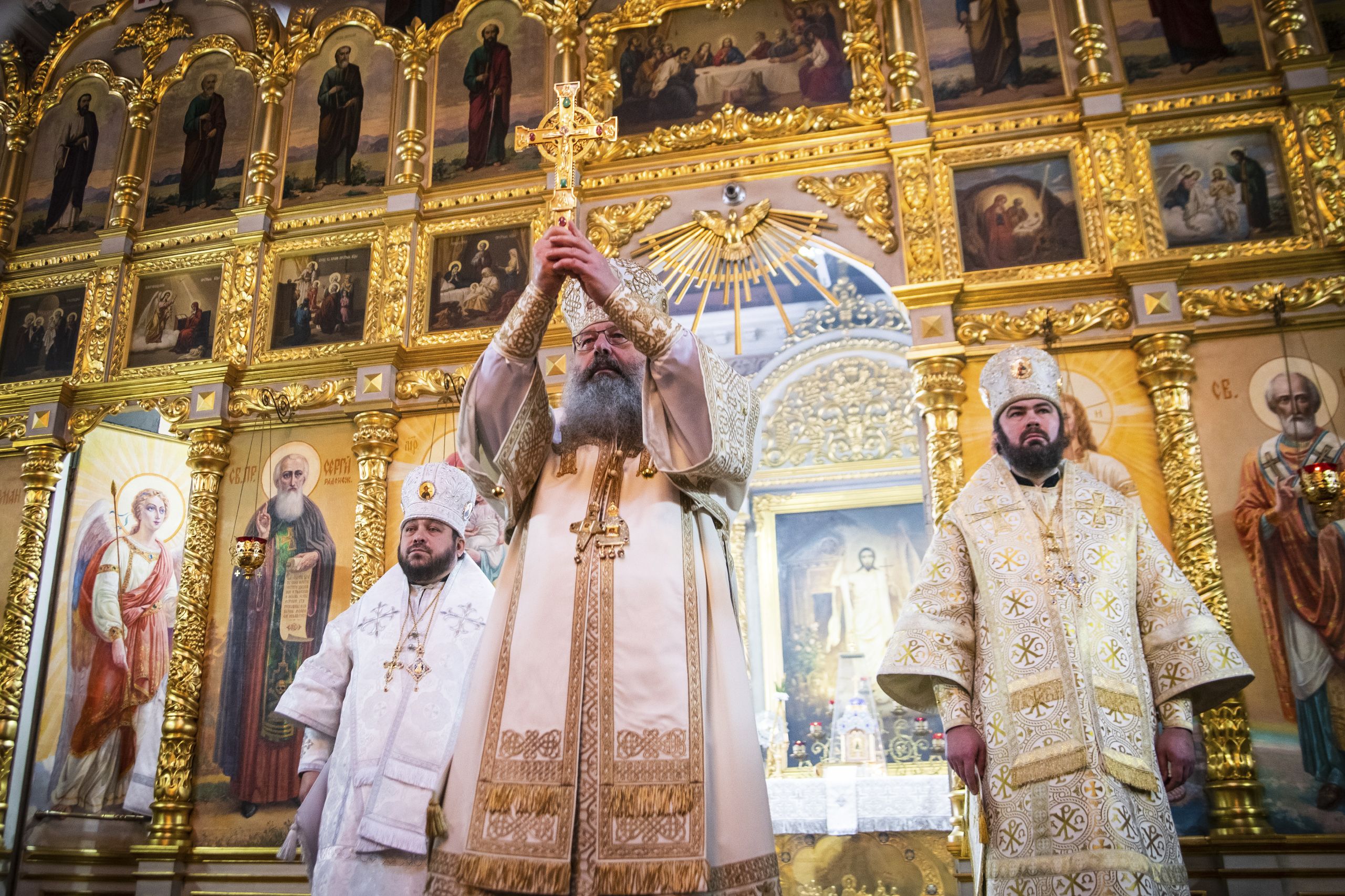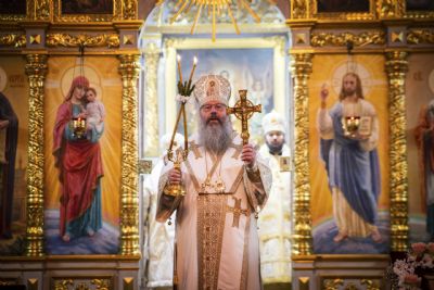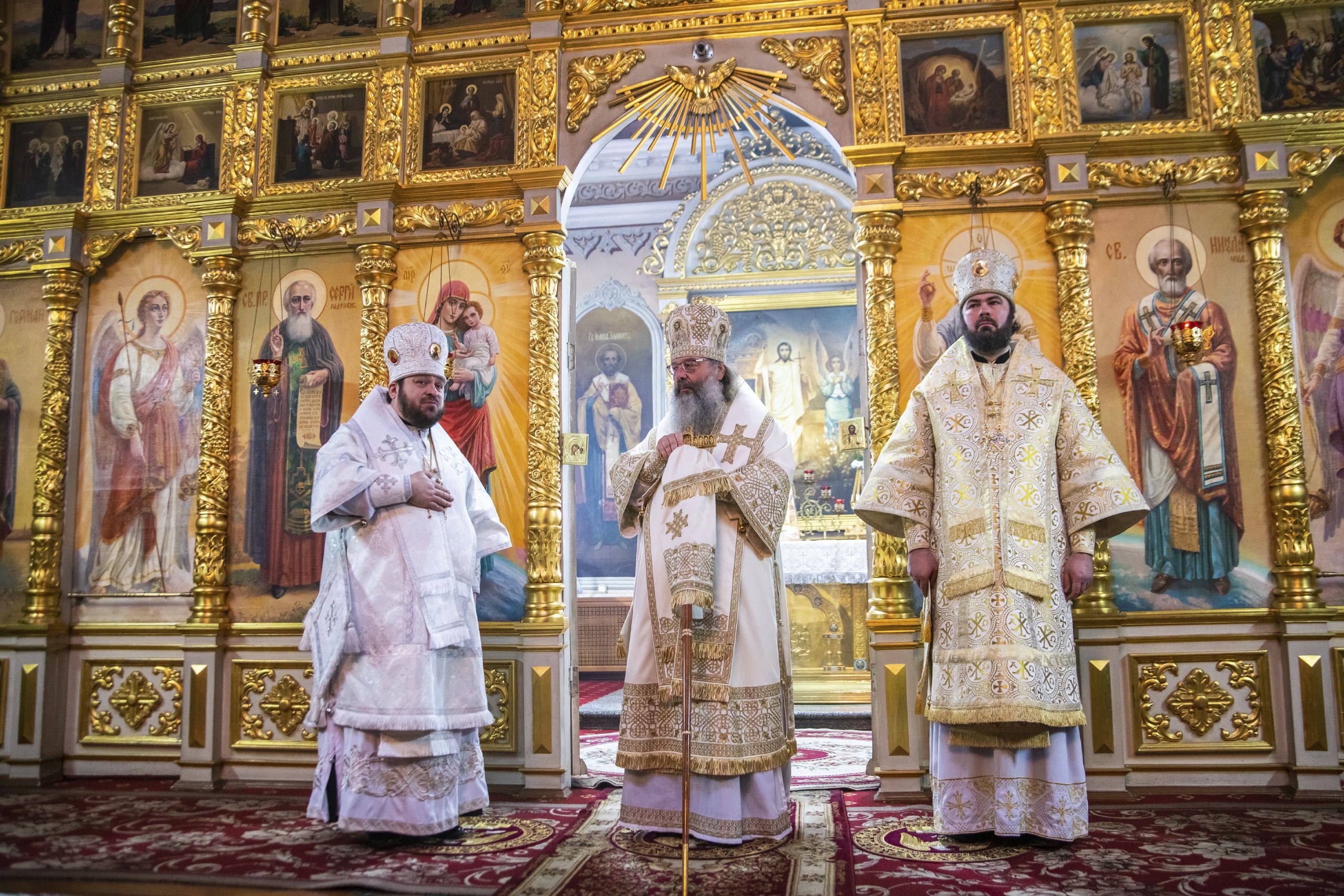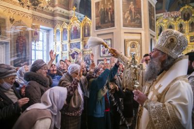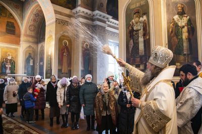 После отпуста Литургии архипастыри и духовенство пропели тропарь, кондак и величание праздника Рождества Христова. Глава митрополии окропил верующих святой водой.