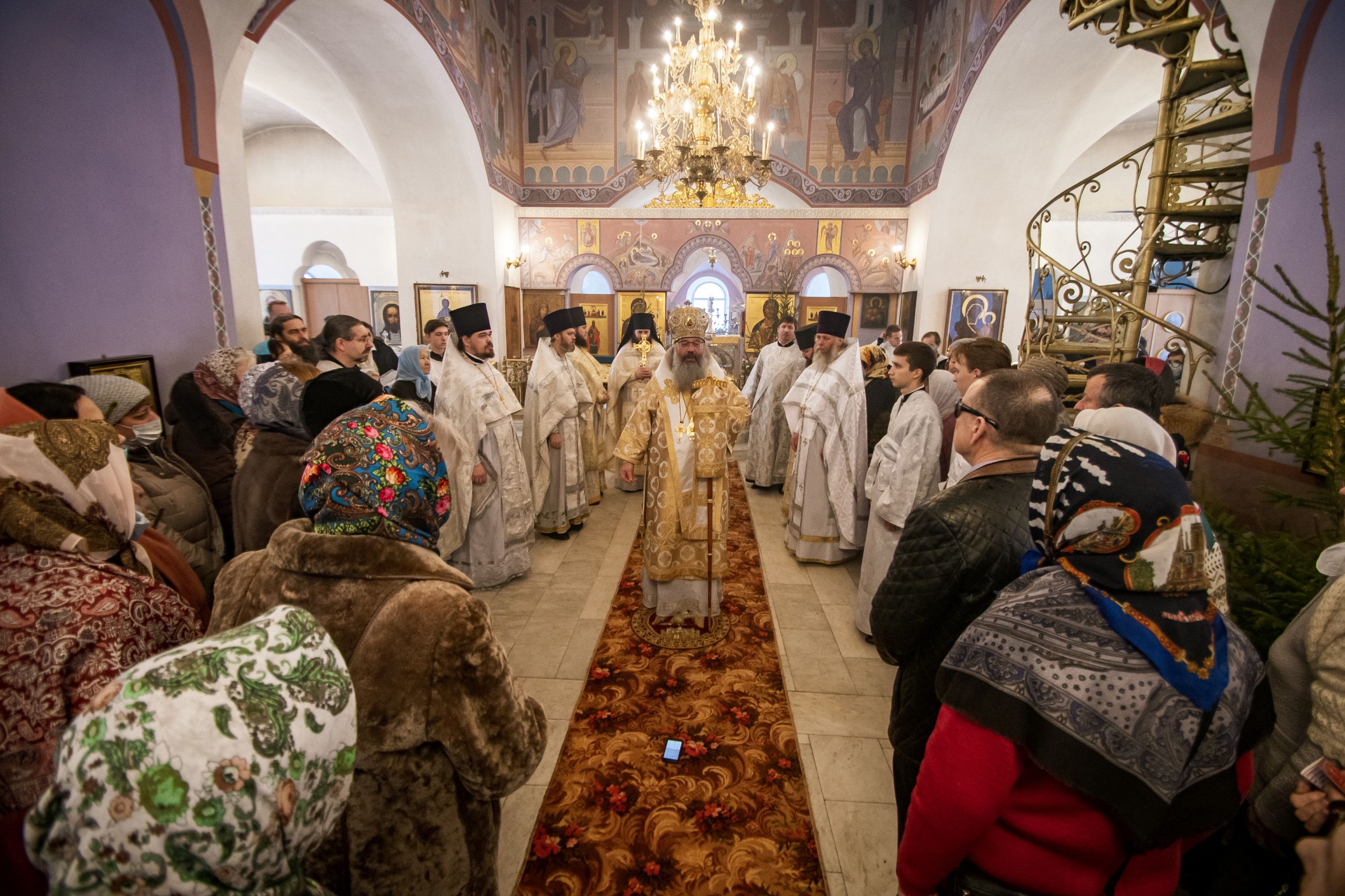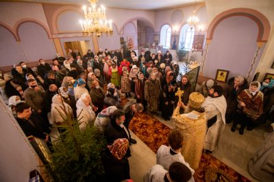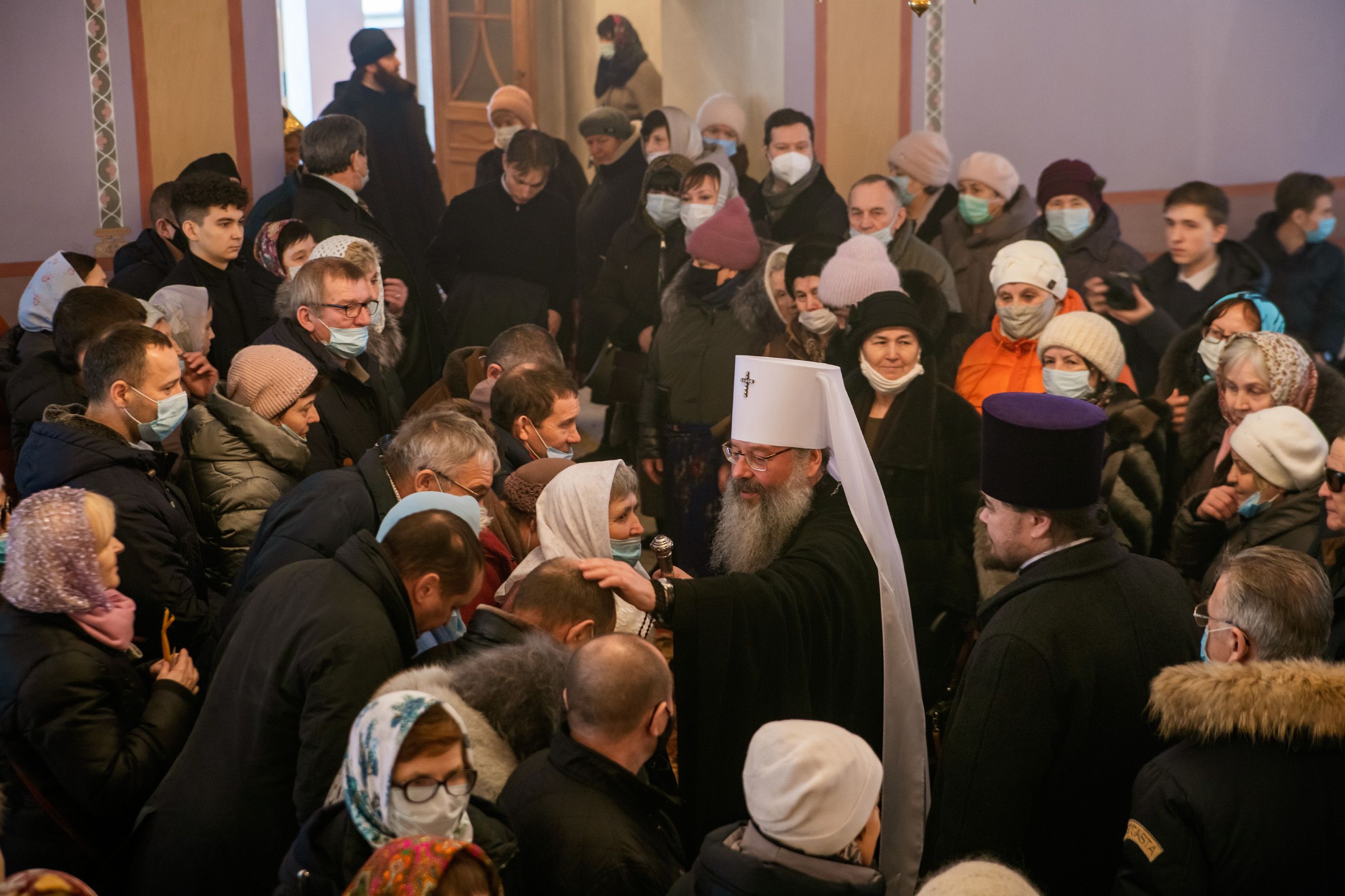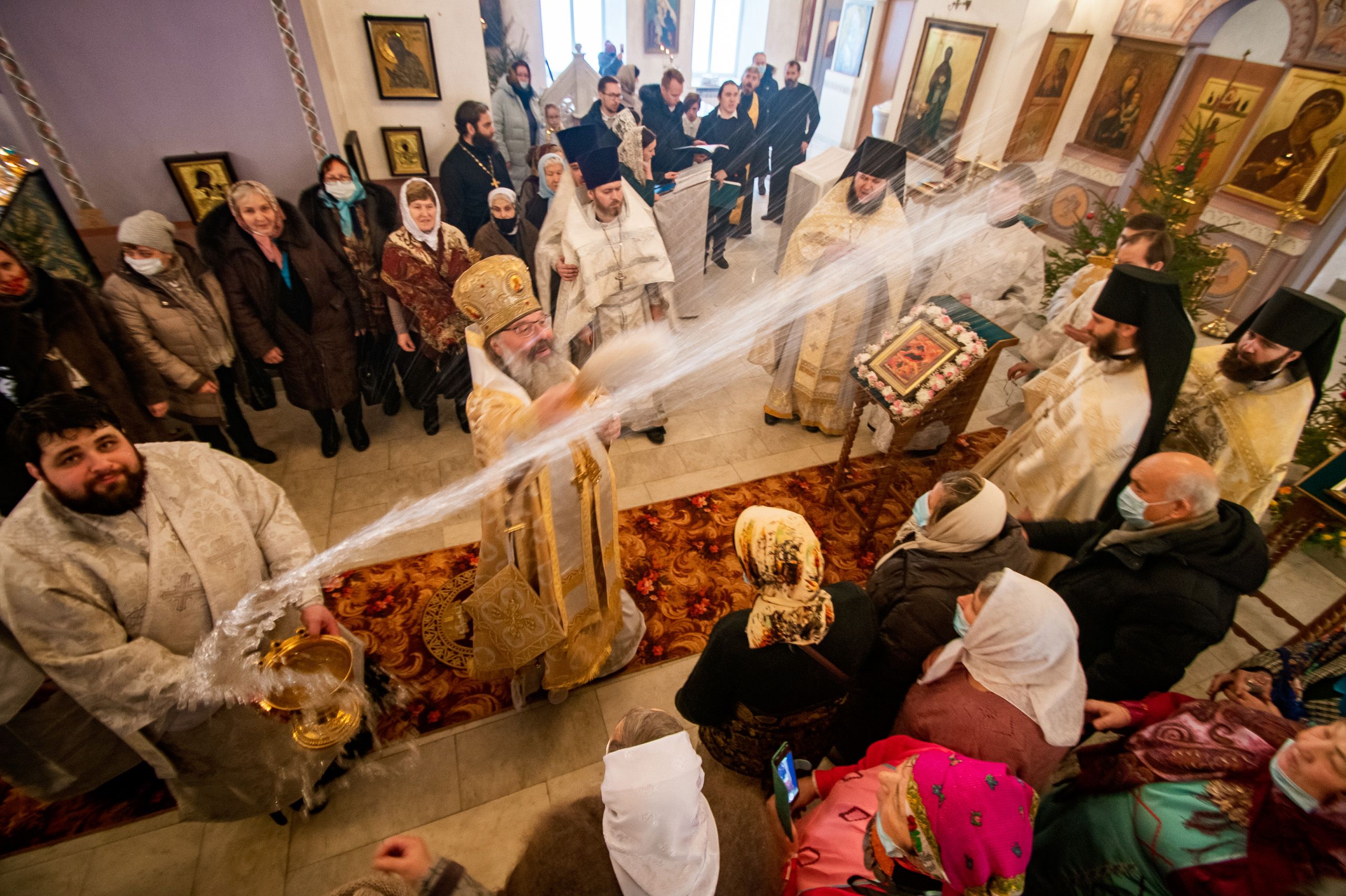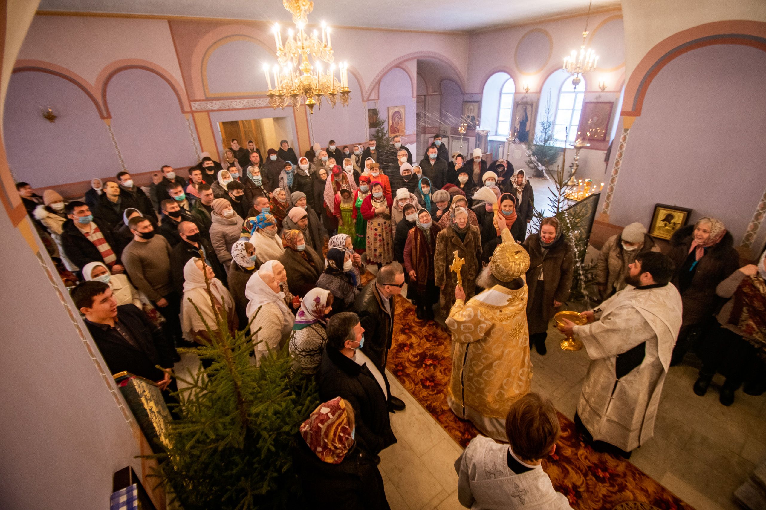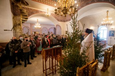 После отпуста Литургии архипастырь и духовенство пропели тропарь, кондак и величание праздника Рождества. Владыка Кирилл окропил верующих святой водой.