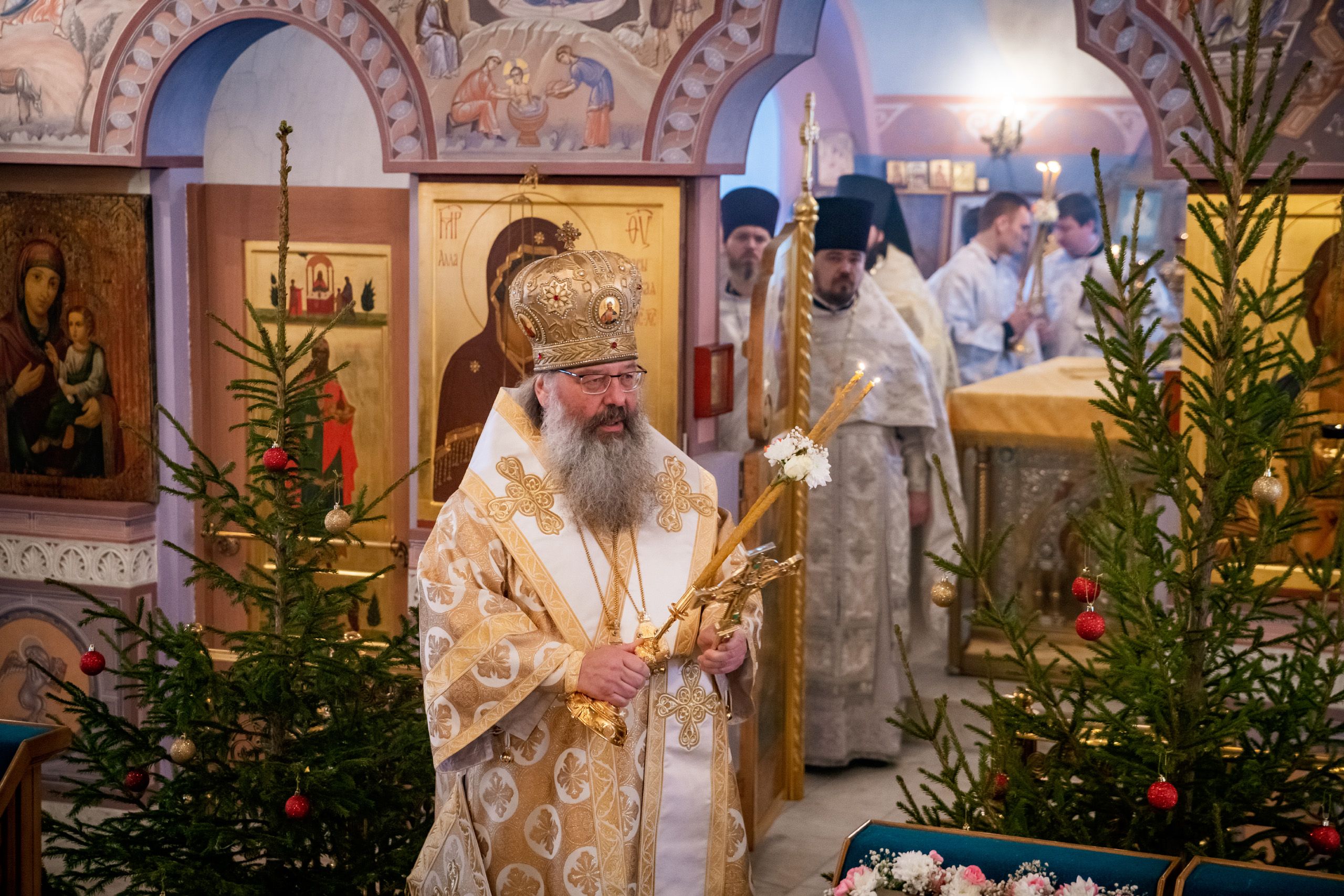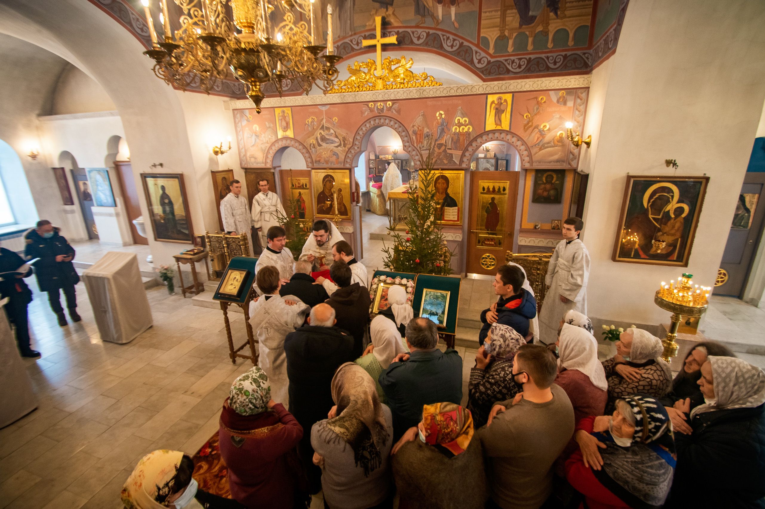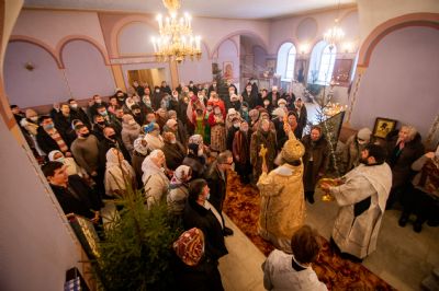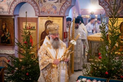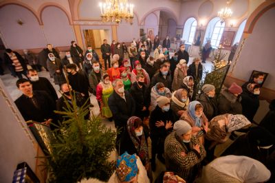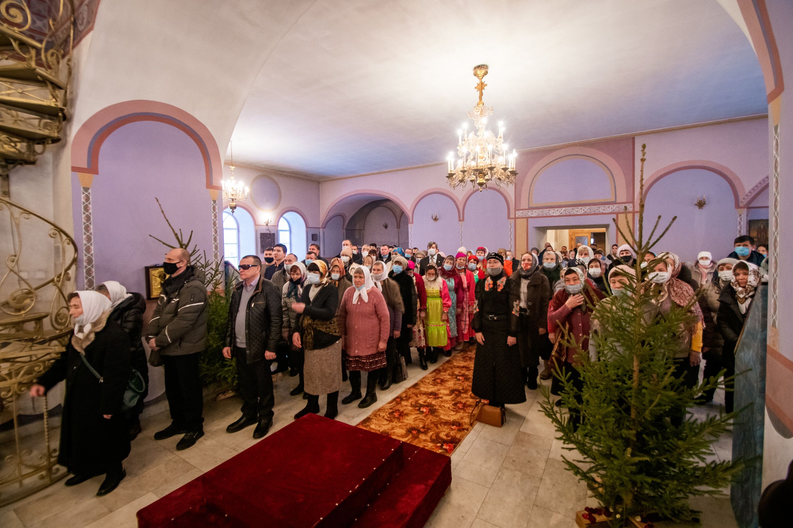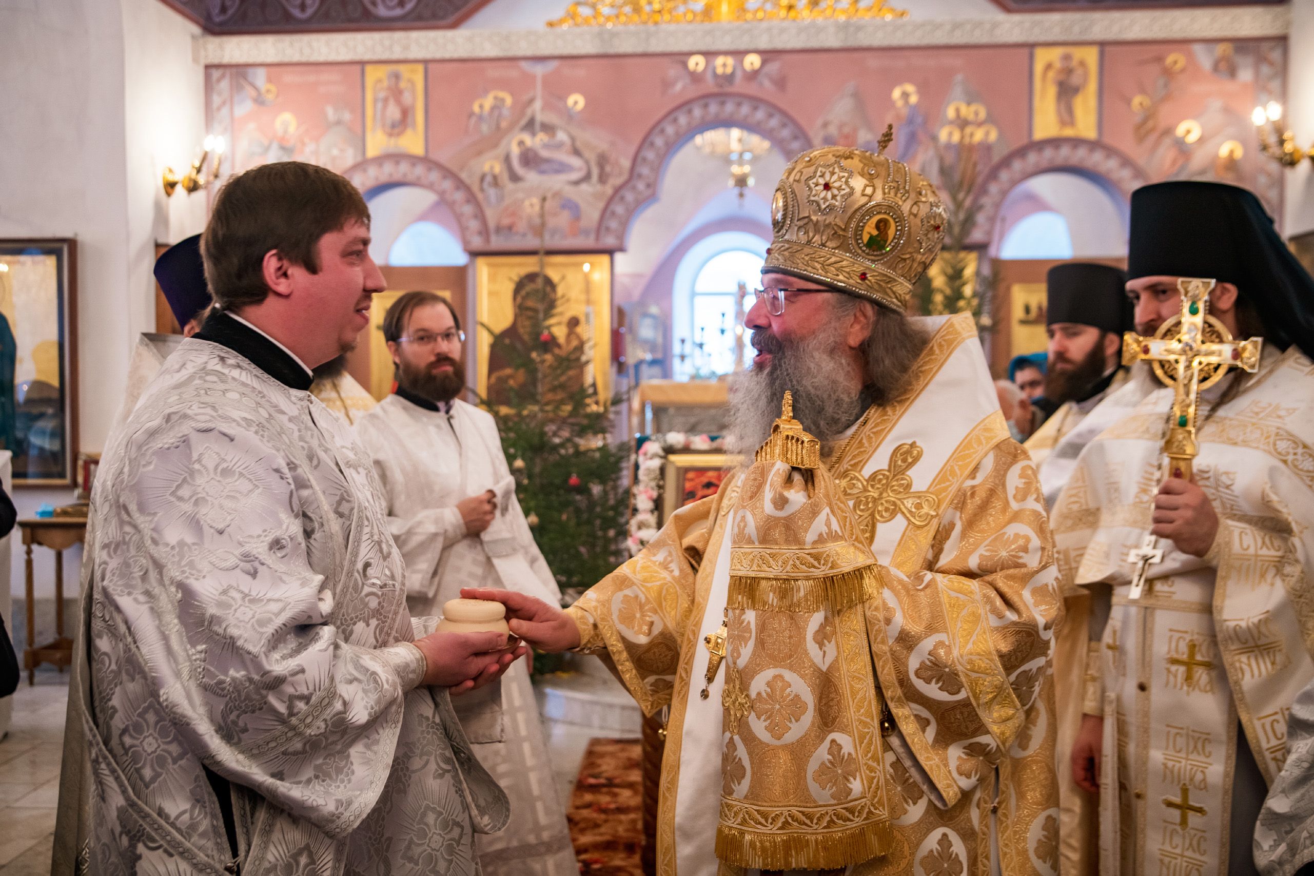 После отпуста Литургии архипастырь и духовенство пропели тропарь, кондак и величание праздника Рождества. Владыка Кирилл окропил верующих святой водой.