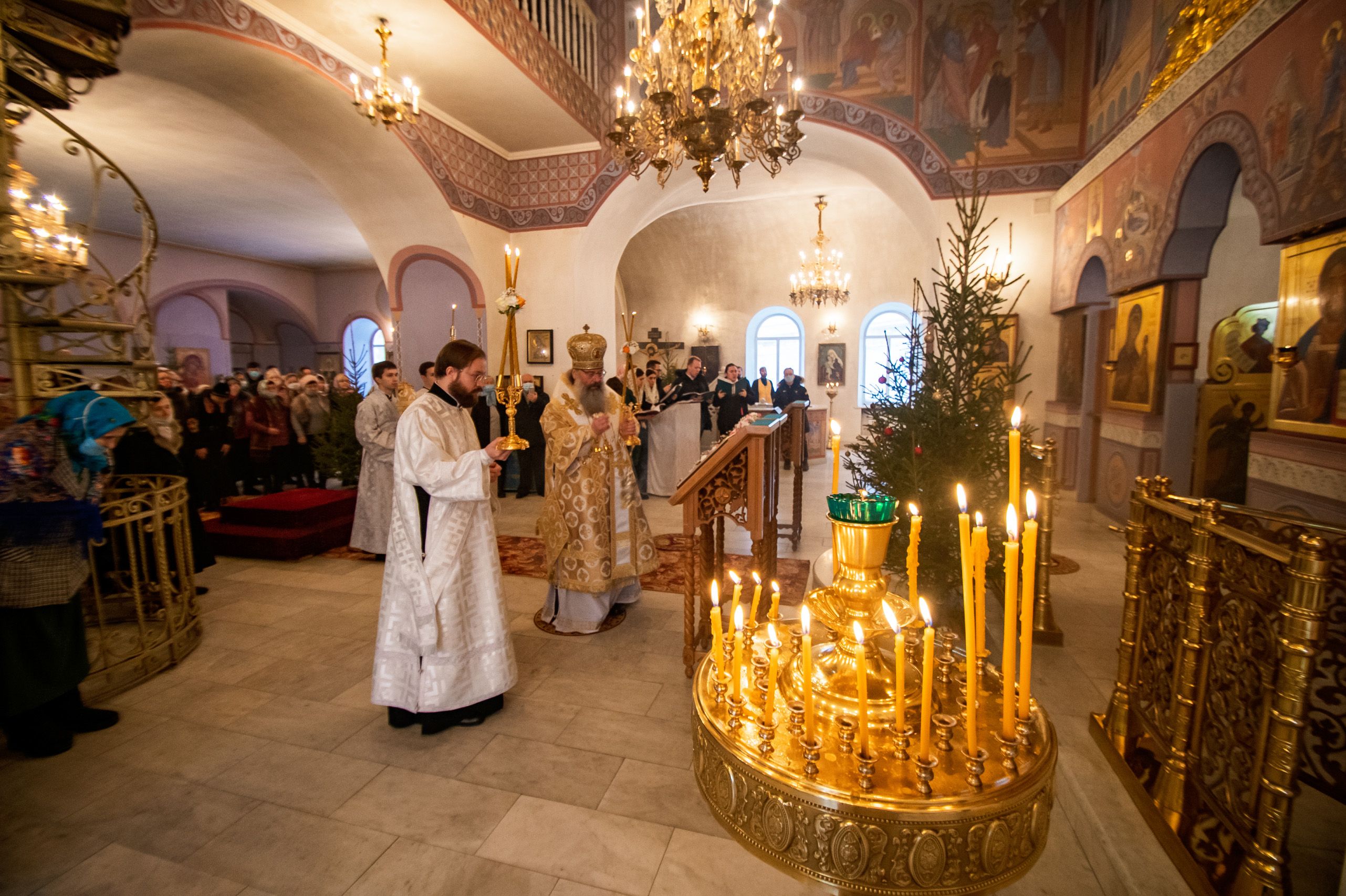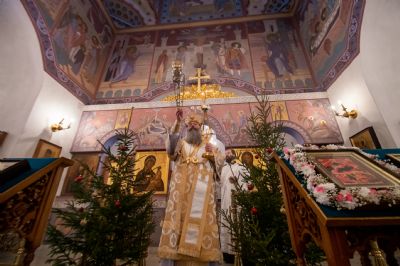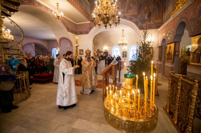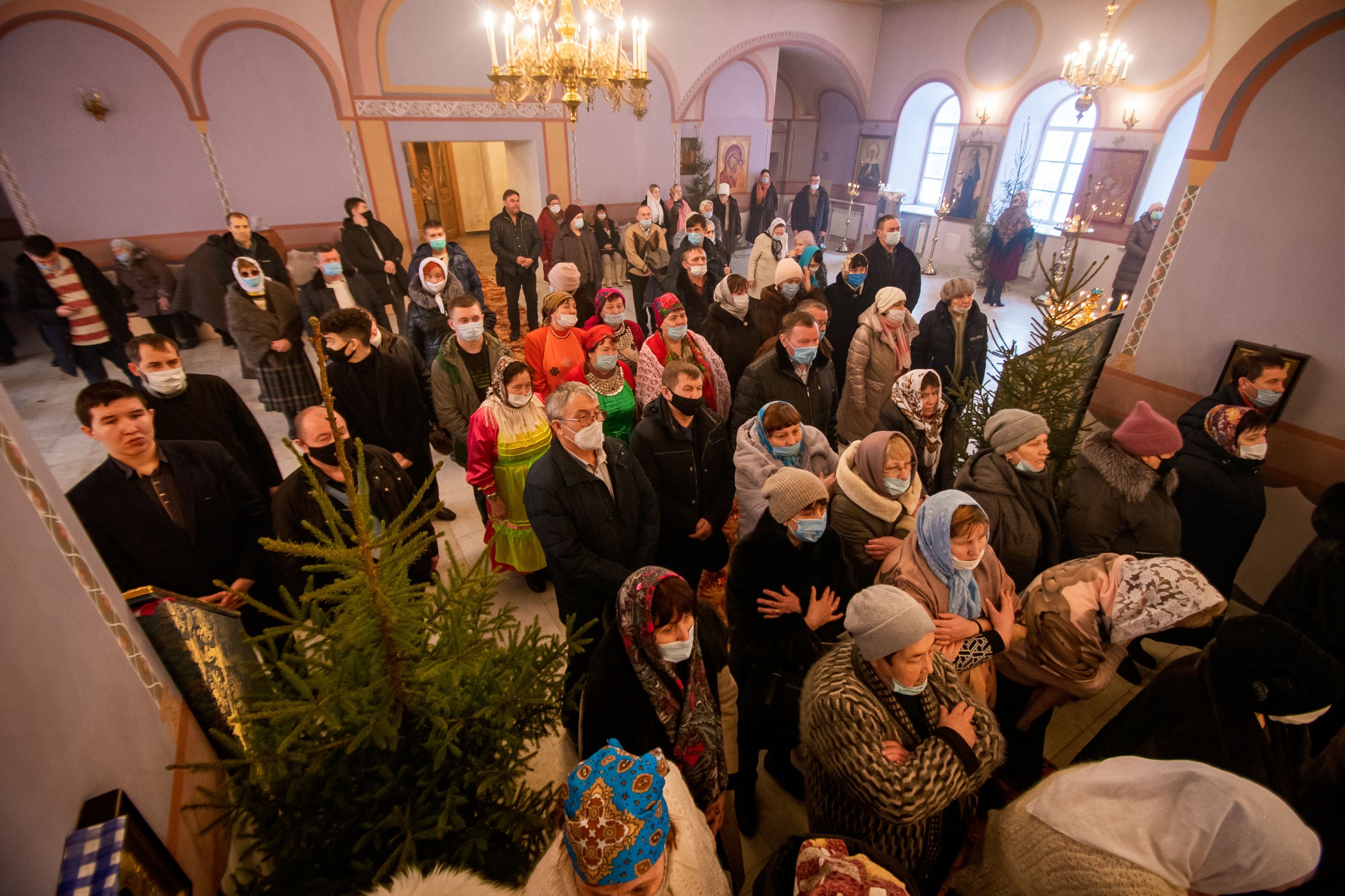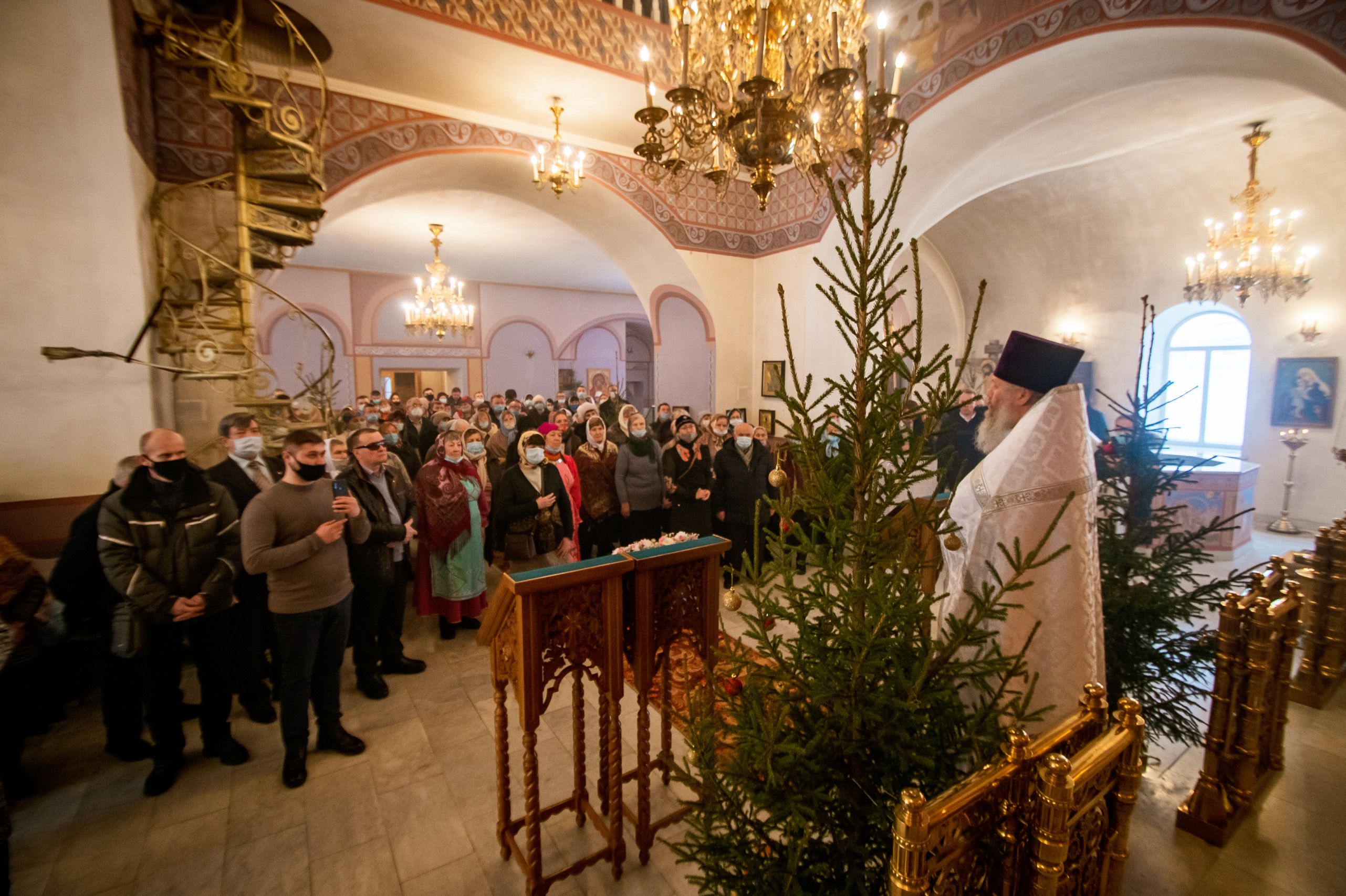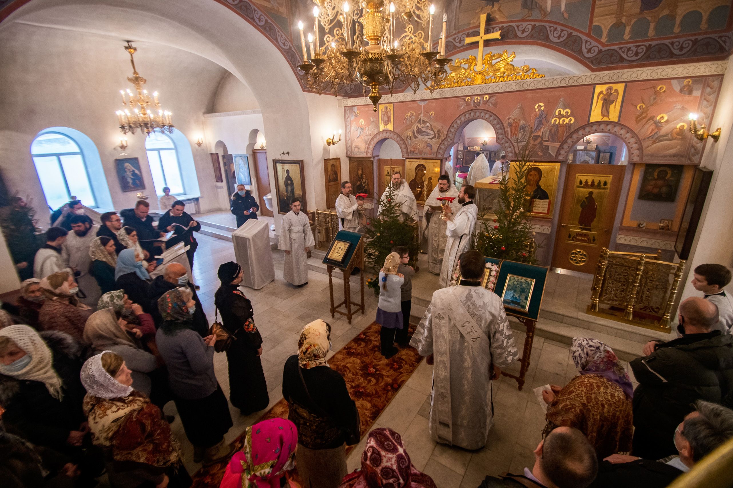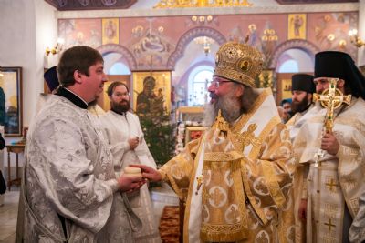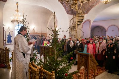 После отпуста Литургии архипастырь и духовенство пропели тропарь, кондак и величание праздника Рождества. Владыка Кирилл окропил верующих святой водой.