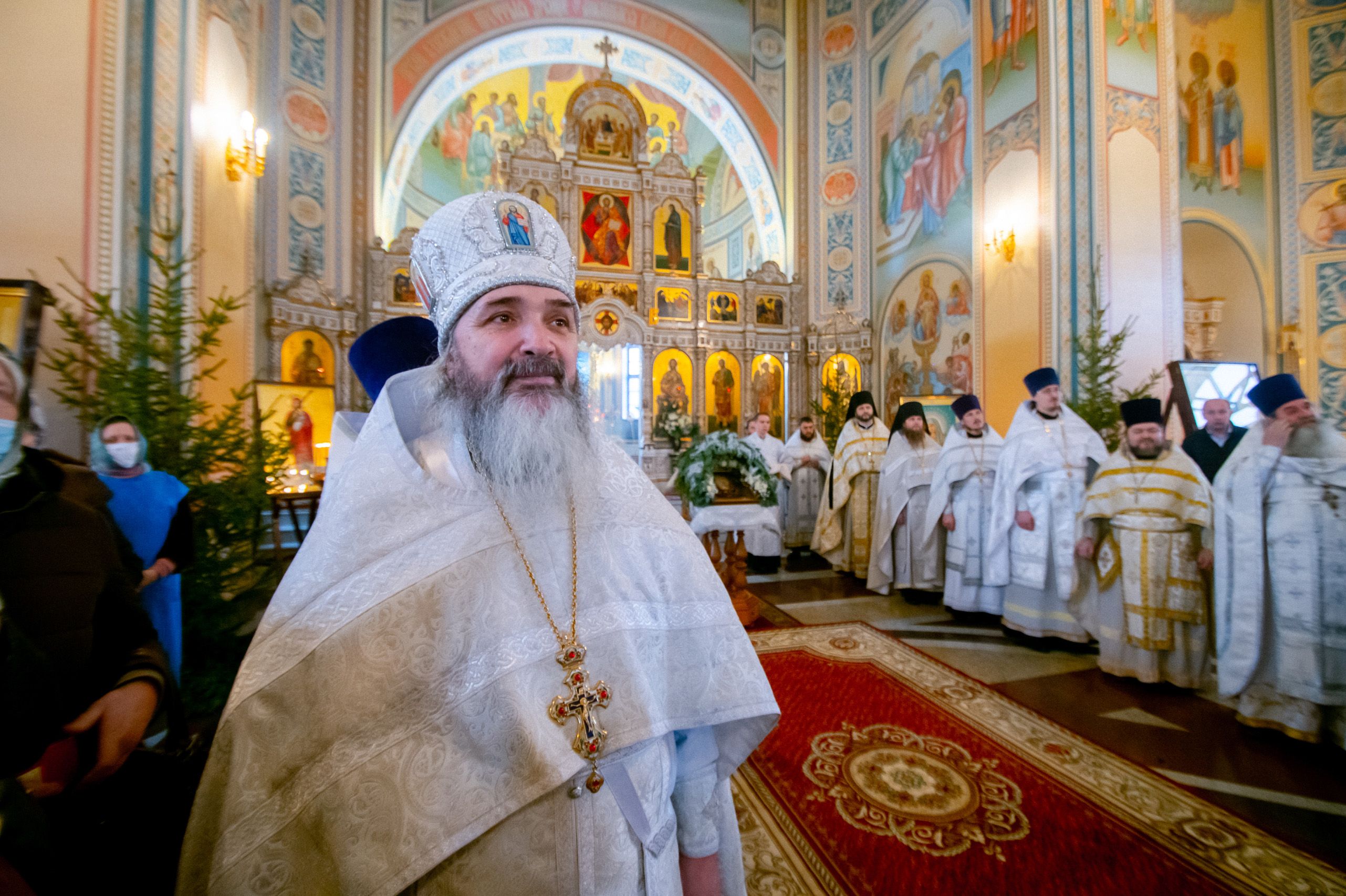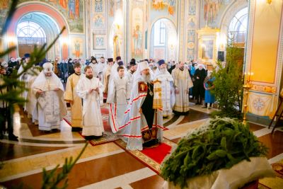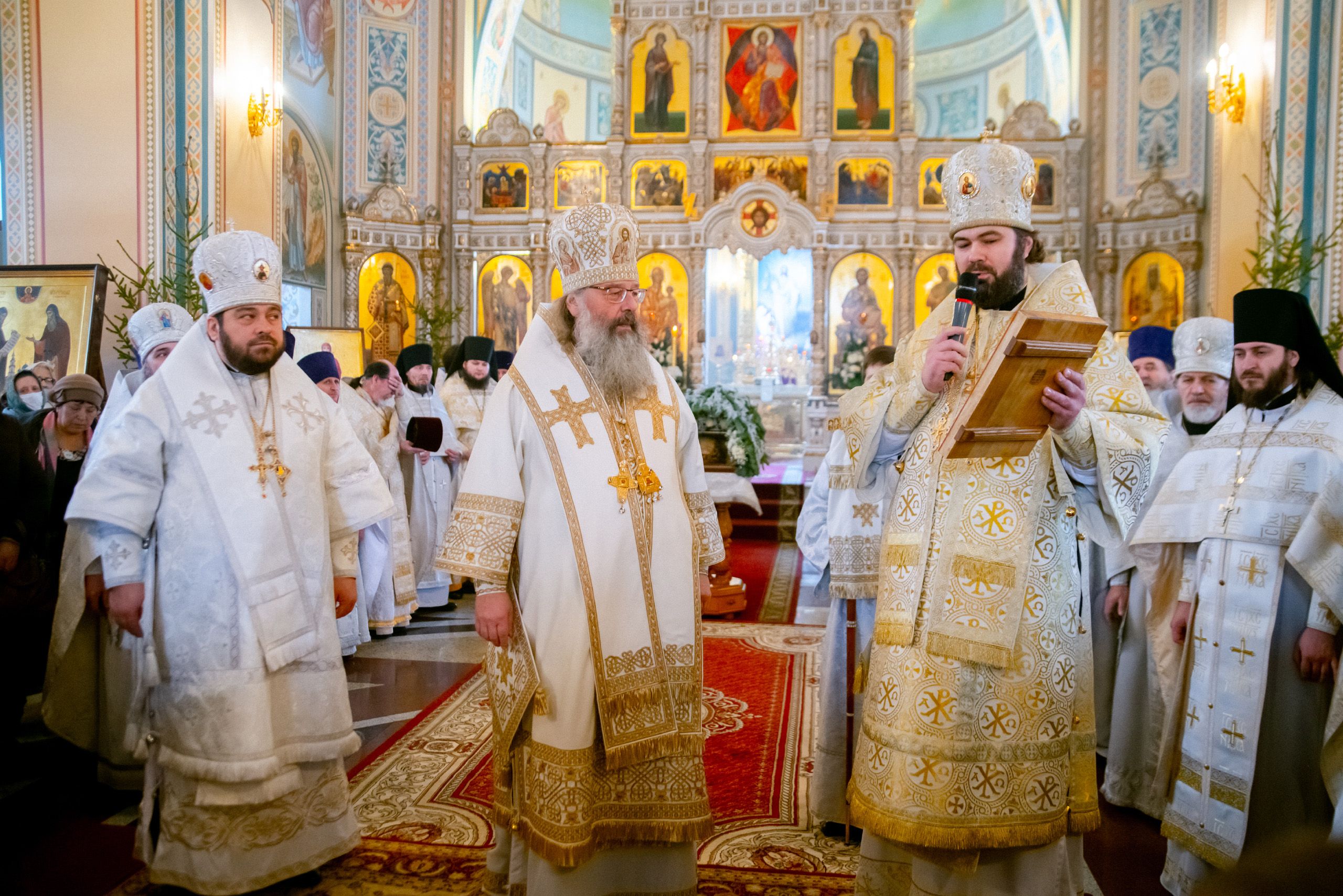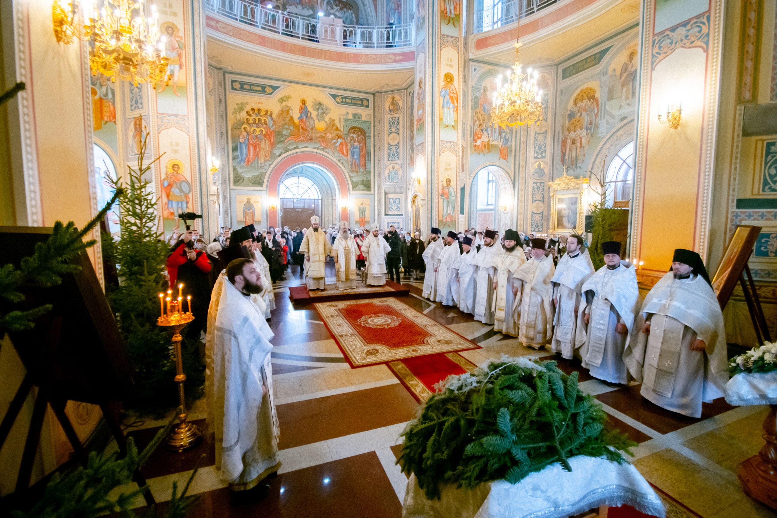 После отпуста Литургии архипастыри и духовенство пропели перед праздничной иконой на середине храма тропарь, кондак и величание Рождества Христова.