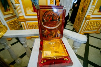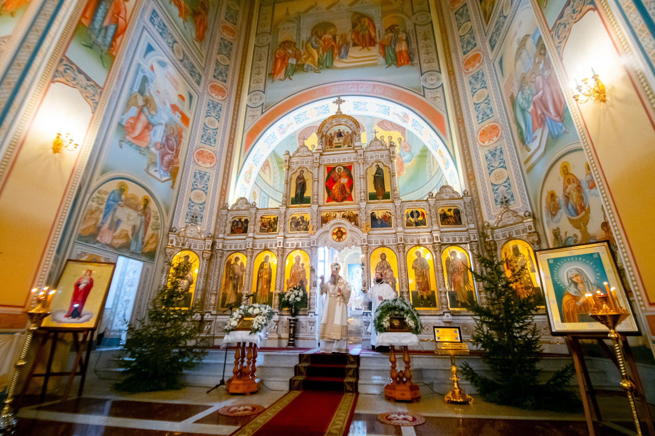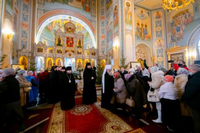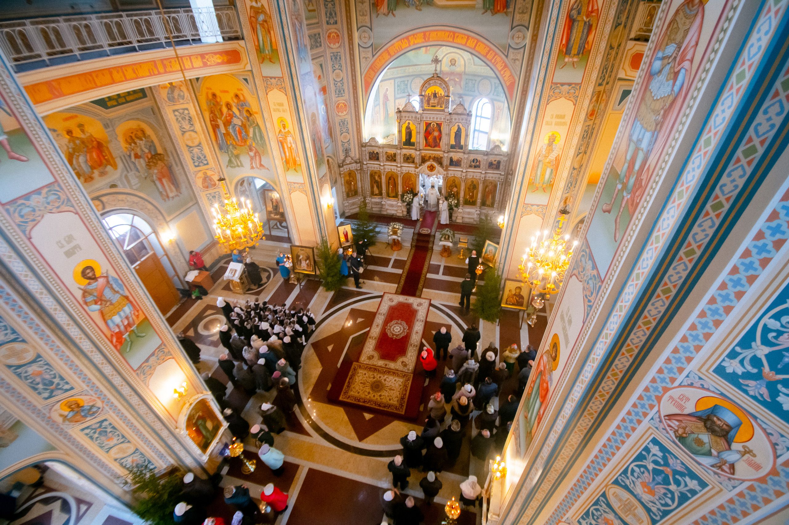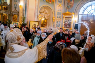 После отпуста Литургии архипастыри и духовенство пропели перед праздничной иконой на середине храма тропарь, кондак и величание Рождества Христова.