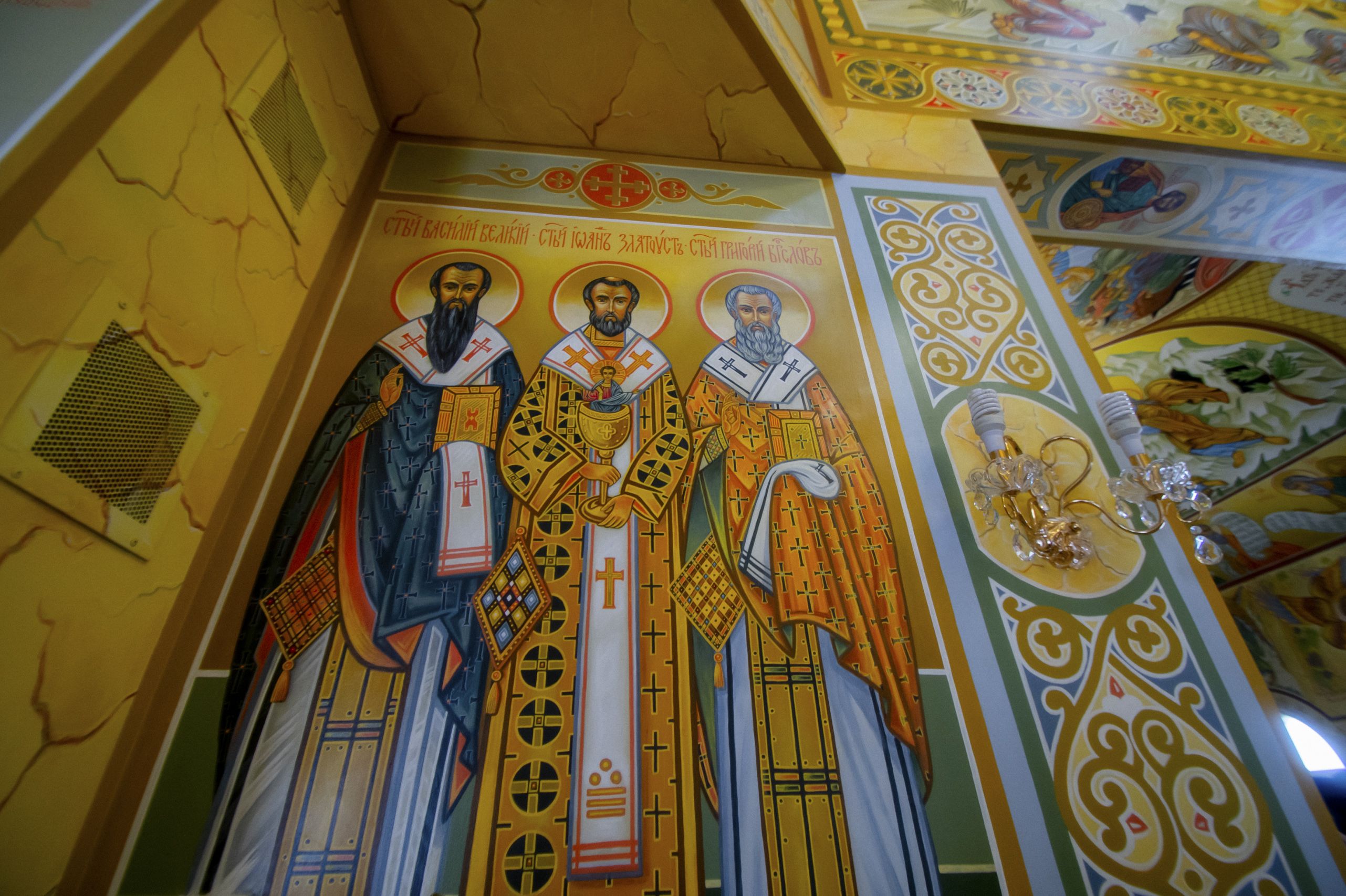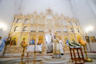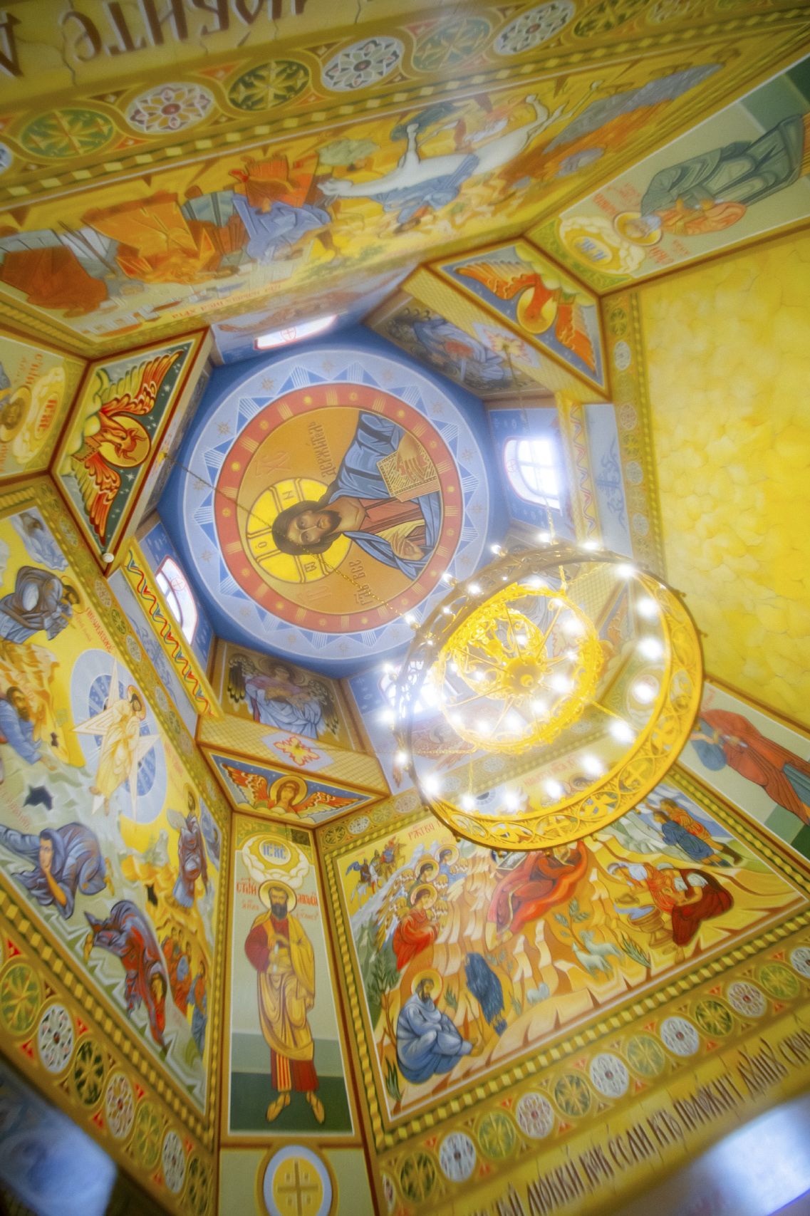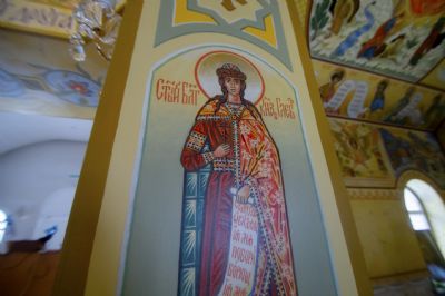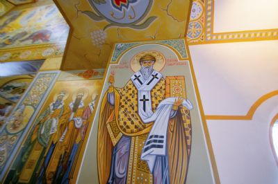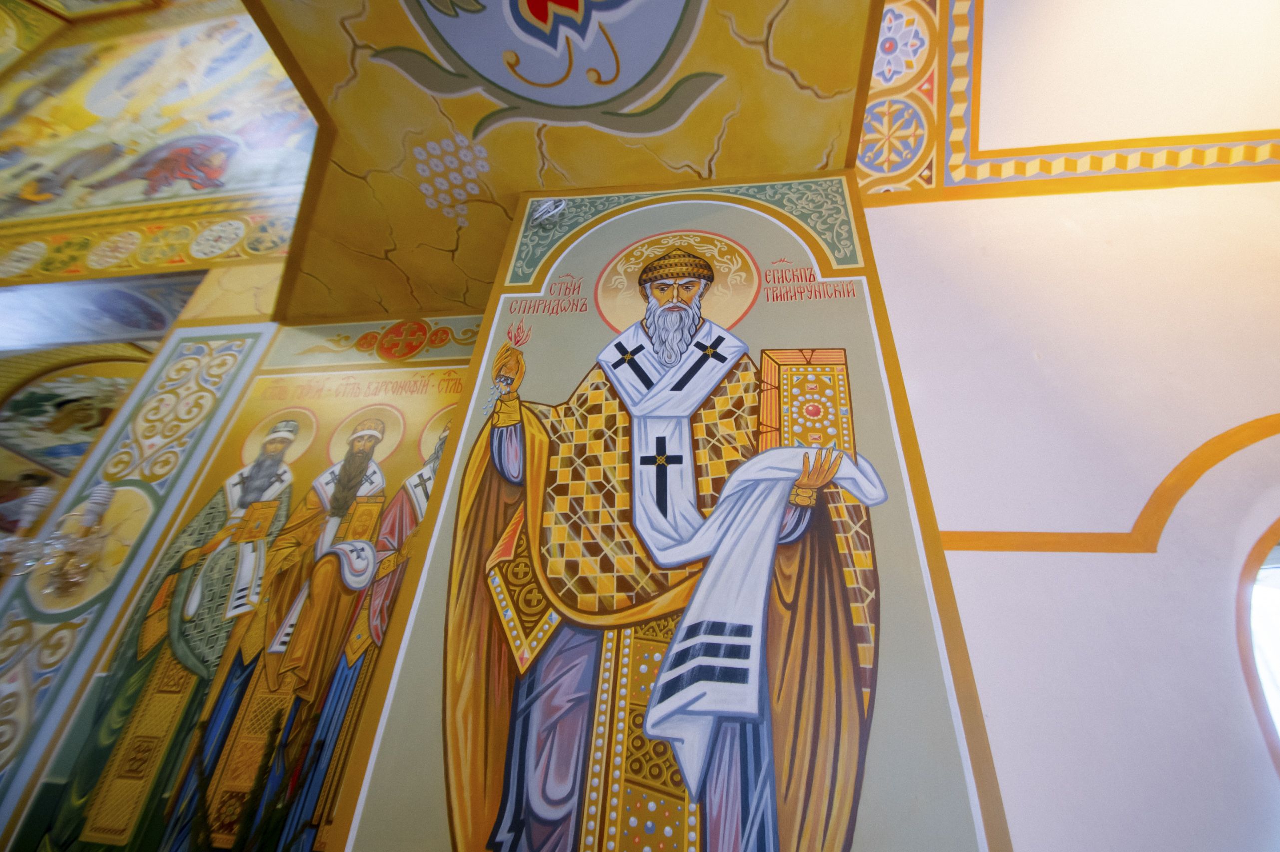 Правящий архиерей также побывал в церкви великомученика Георгия Победоносца, где ознакомился с работами челнинского иконописца Евгения Прохорова. В настоящее время мастер работает над росписью северного крыла церкви. В планах — завершить роспись к следующему году.