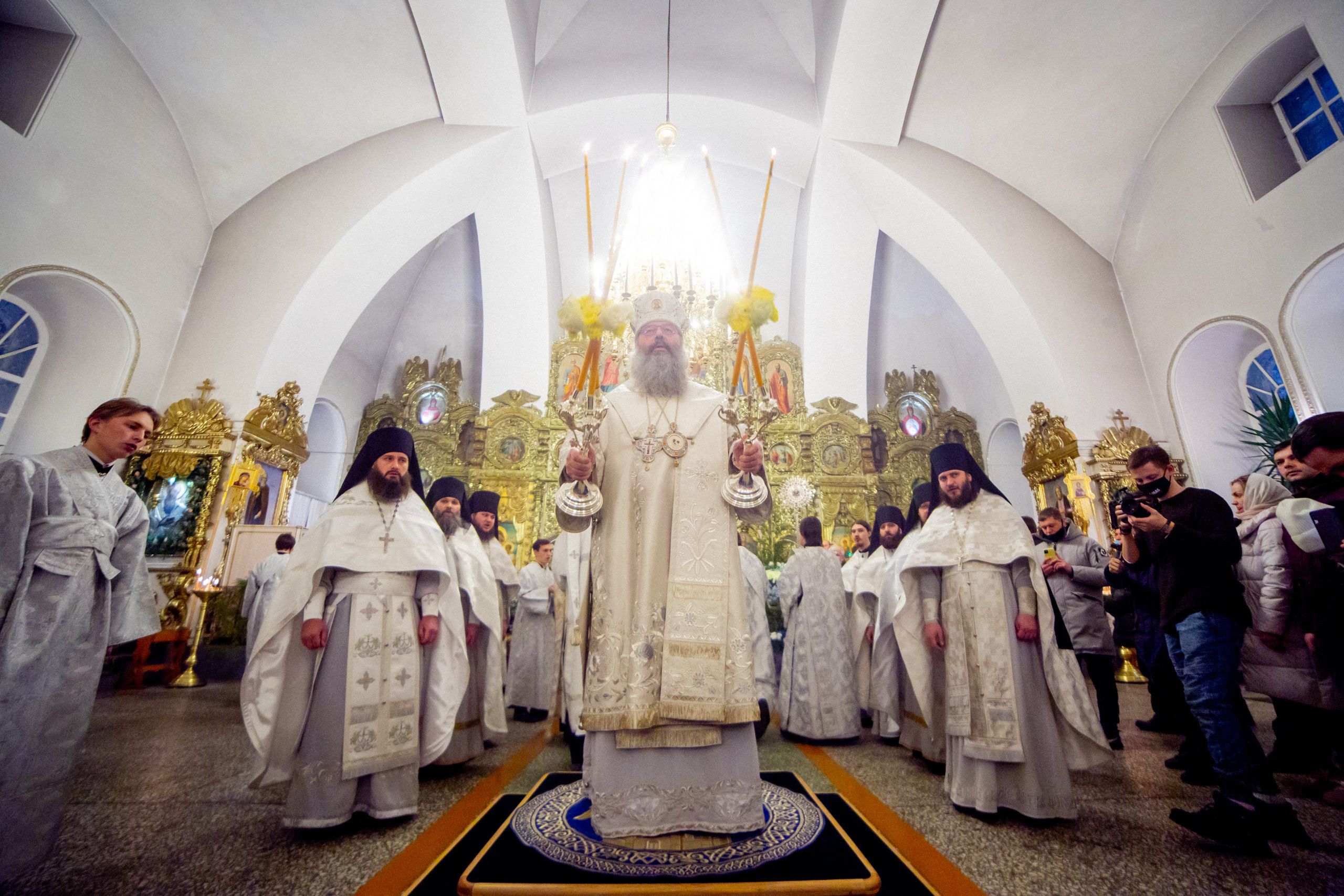 При входе в храм архипастыря приветствовали воспитанники детского приюта Раифского монастыря.