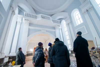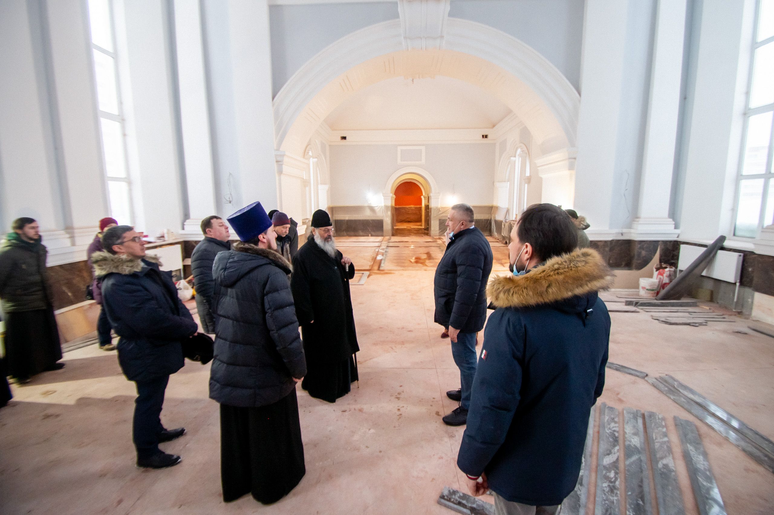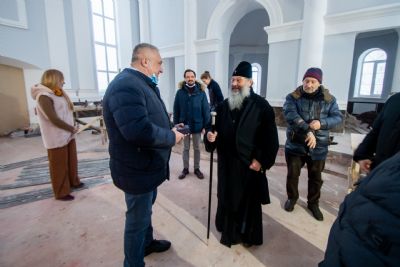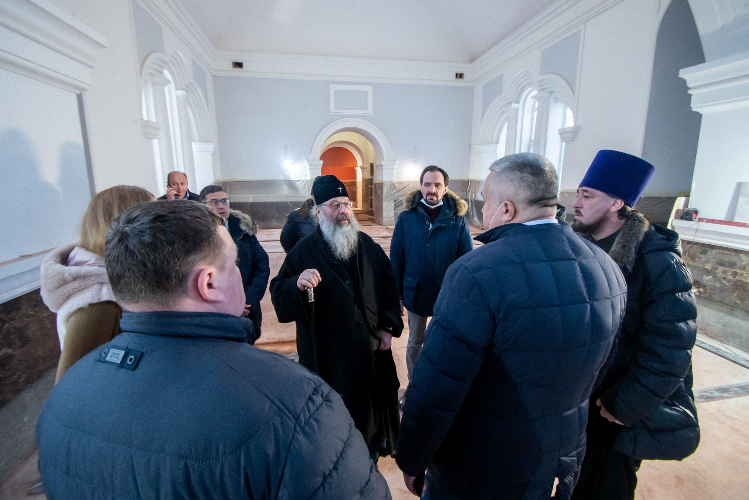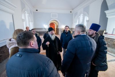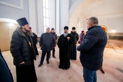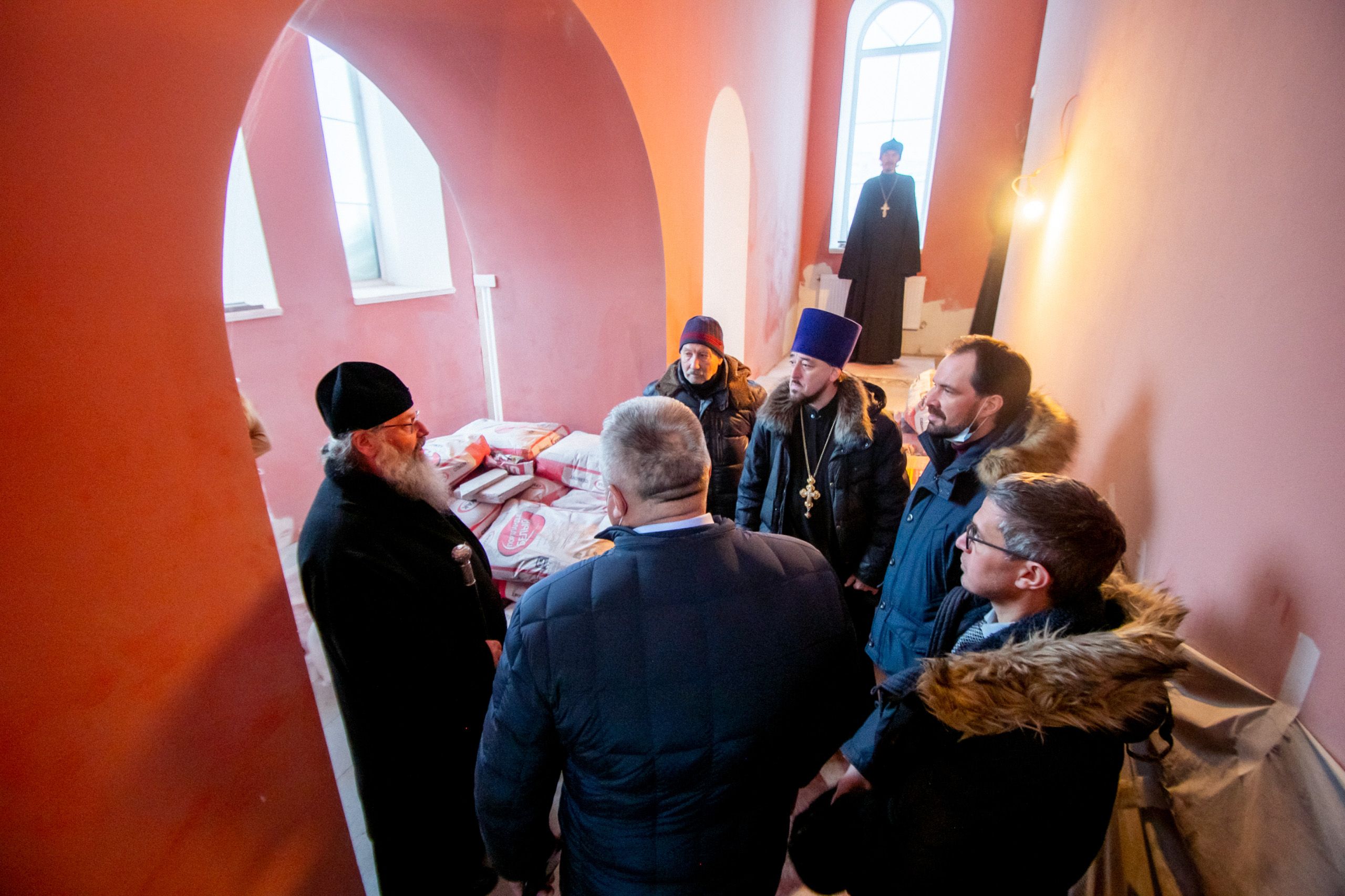 Далее правящий архиерей посетил нижний храм в честь преподобного Сергия Радонежского, где в настоящее время совершаются регулярные богослужения. Также он осмотрел строящийся дом причта, где будут находиться административно-хозяйственные помещения и учебные классы воскресной школы. Площадь возведённого здания составляет 480 квадратных метров.