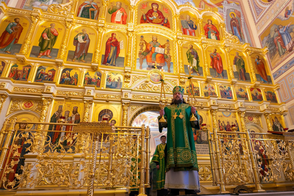 Его Преосвященству сослужили настоятель храма, благочинный I Казанского округа протоиерей Алексий Чубаков; настоятель Введенского Кизического мужского монастыря игумен Пимен (Ивентьев) и клирики прихода.