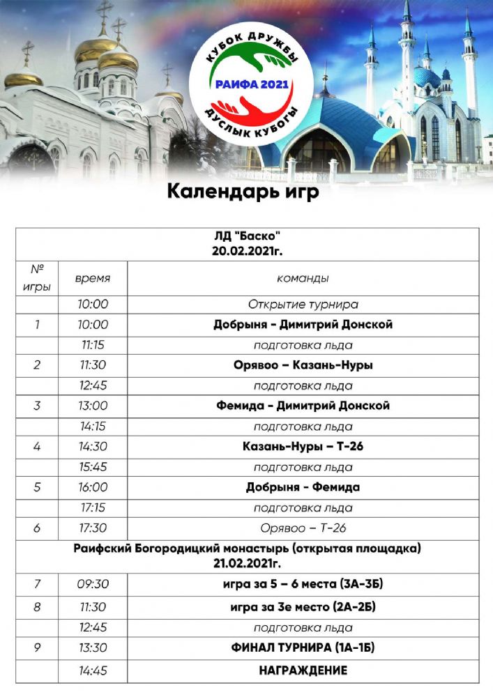 Хоккейный турнир «Кубок Дружбы — Дуслык. Раифа 2021» организован Казанской епархией при поддержке Духовного управления мусульман Республики Татарстан, Зеленодольского муниципального района РТ, Раифского Богородицкого мужского монастыря, Федерации хоккея РТ, Федерации хоккея города Казани, Казанского высшего танкового командного училища, ПАО «Татнефть», ООО «ЗаряД».
