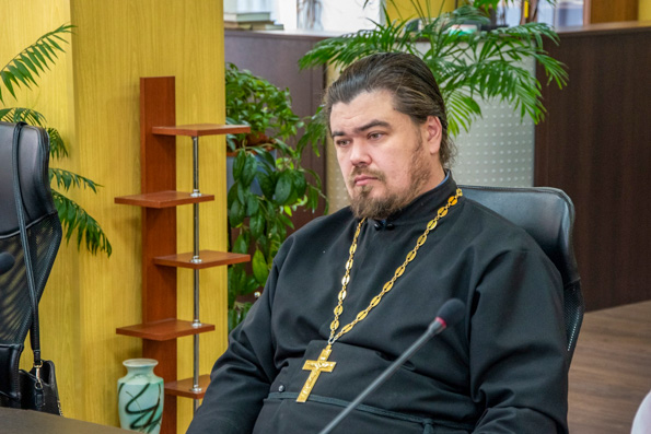 Мероприятие началось с приветственного слова исполняющего обязанности проректора по учебной работе КазПДС диакона Дмитрия Хохлова.
