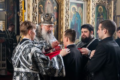 За богослужением Его Высокопреосвященству сослужили настоятель семинарского храма иеромонах Филипп (Киселёв), первый проректор протоиерей Алексий Колчерин, проректор по воспитательной работе иеромонах Кирилл (Забавнов), клирик Благовещенского собора Казани иерей Константин Колыганов, проректор по аккредитации и лицензированию иерей Никита Кузнецов, иеромонах Алексий (Яцейко).