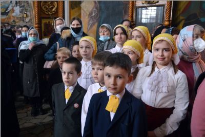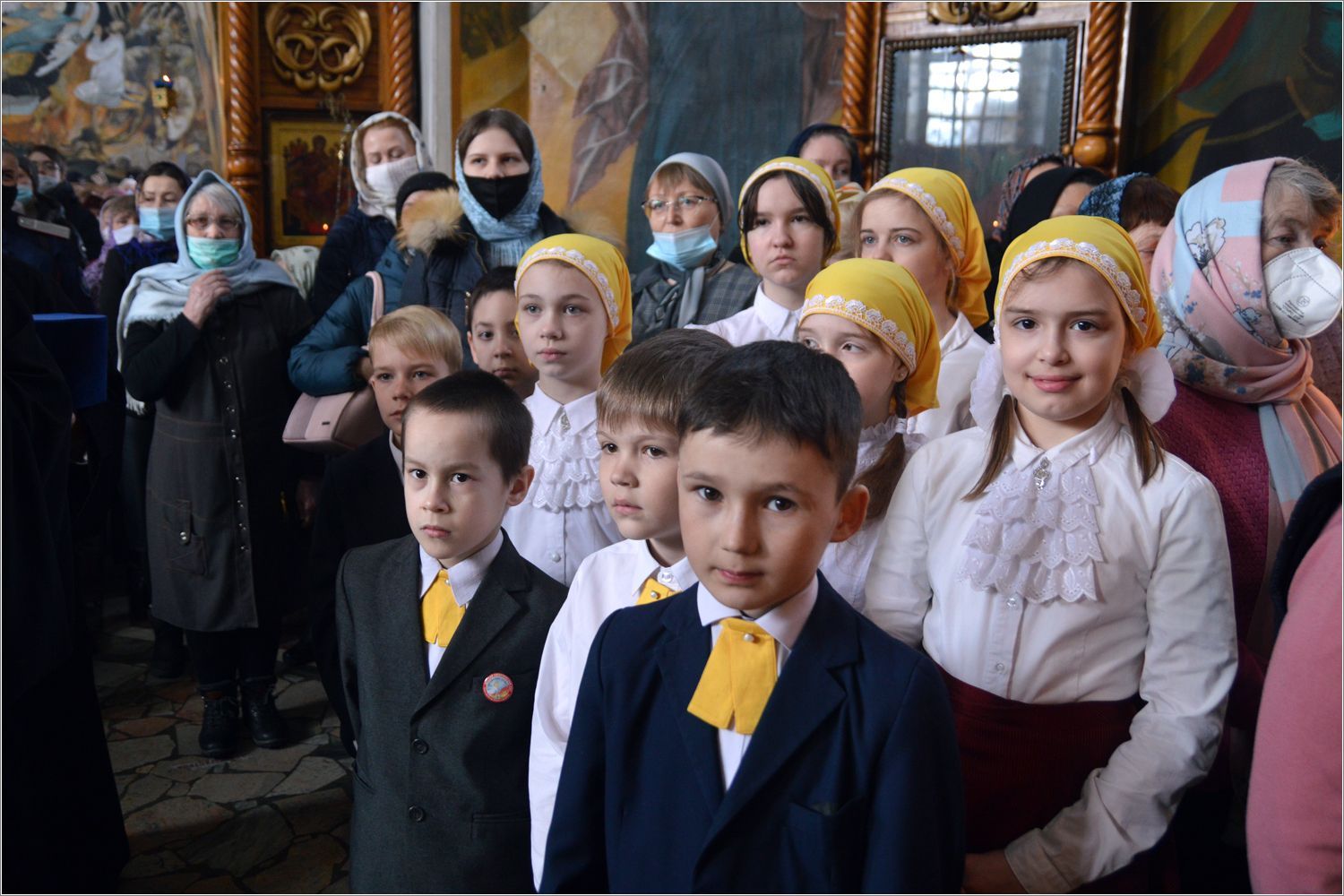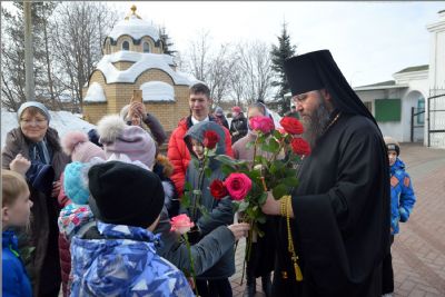 У входа Его Преосвященство встретили воспитанники воскресной школы Орловской церкви, детский хор которой позже, за богослужением исполнил тропарь и величание святым покровителям храма.
