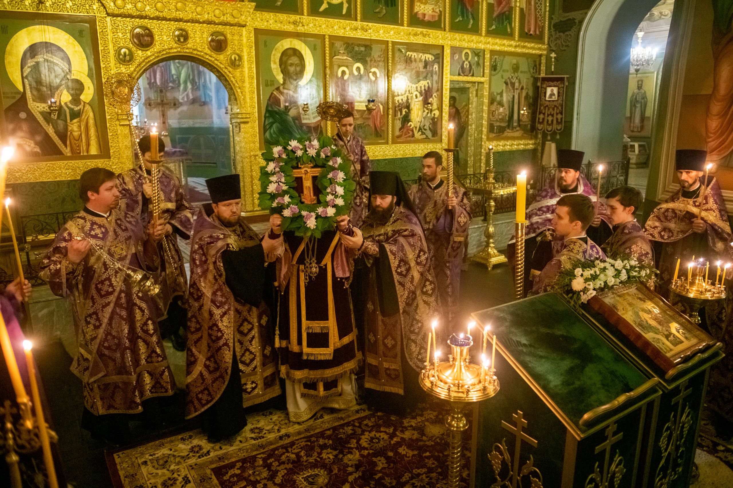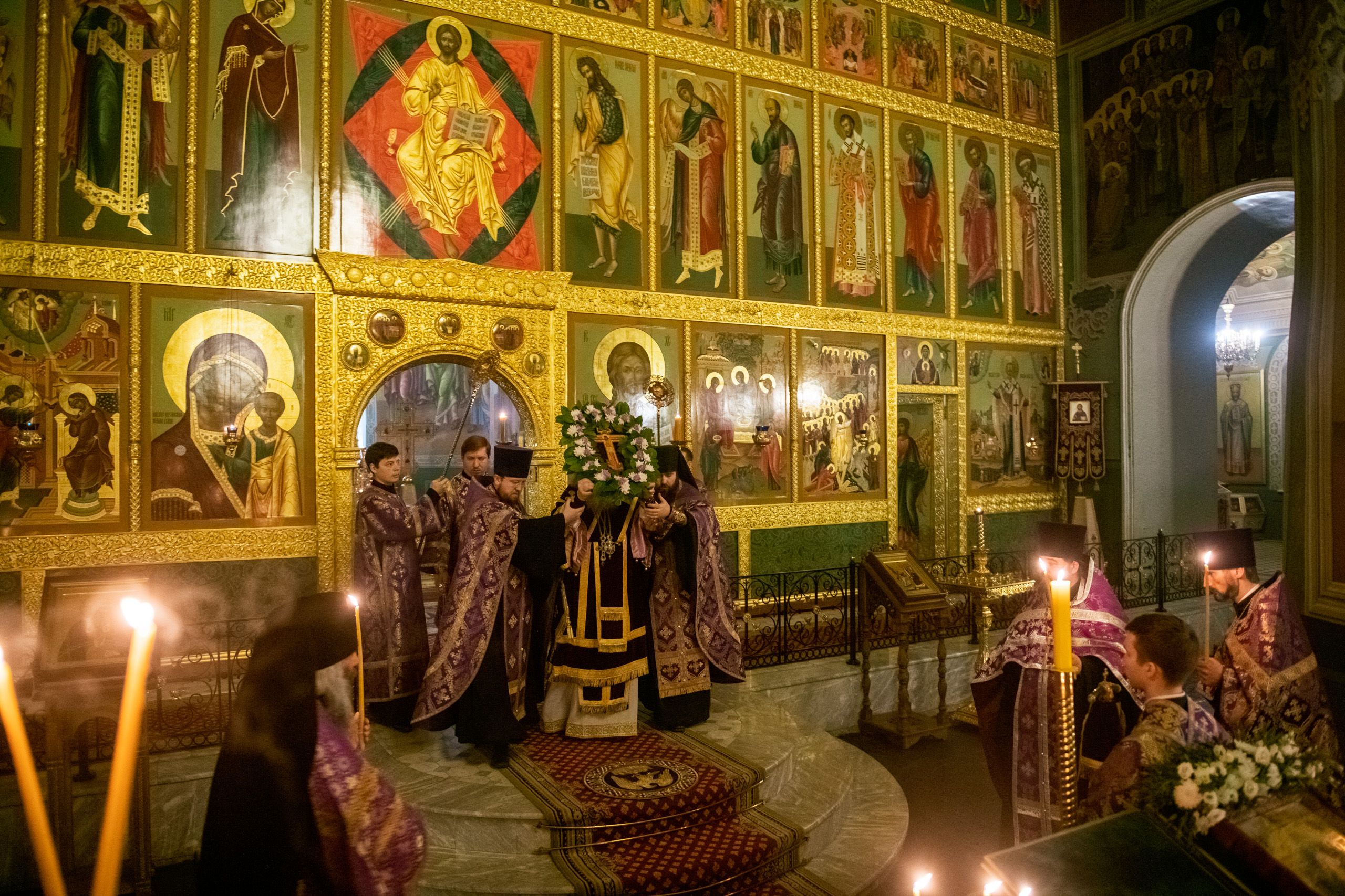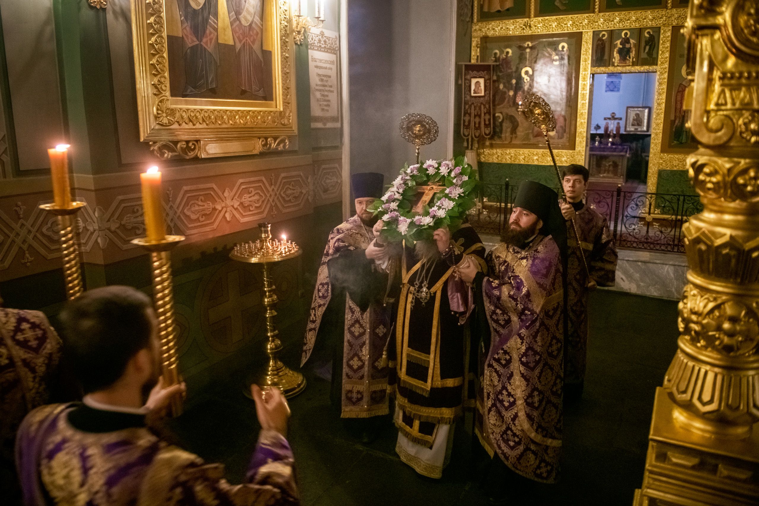 После великого славословия состоялся чин выноса Креста Господня. При пении Трисвятого правящий архиерей через северные двери изнёс святой Крест из алтаря и положил его на центральном аналое для поклонения.