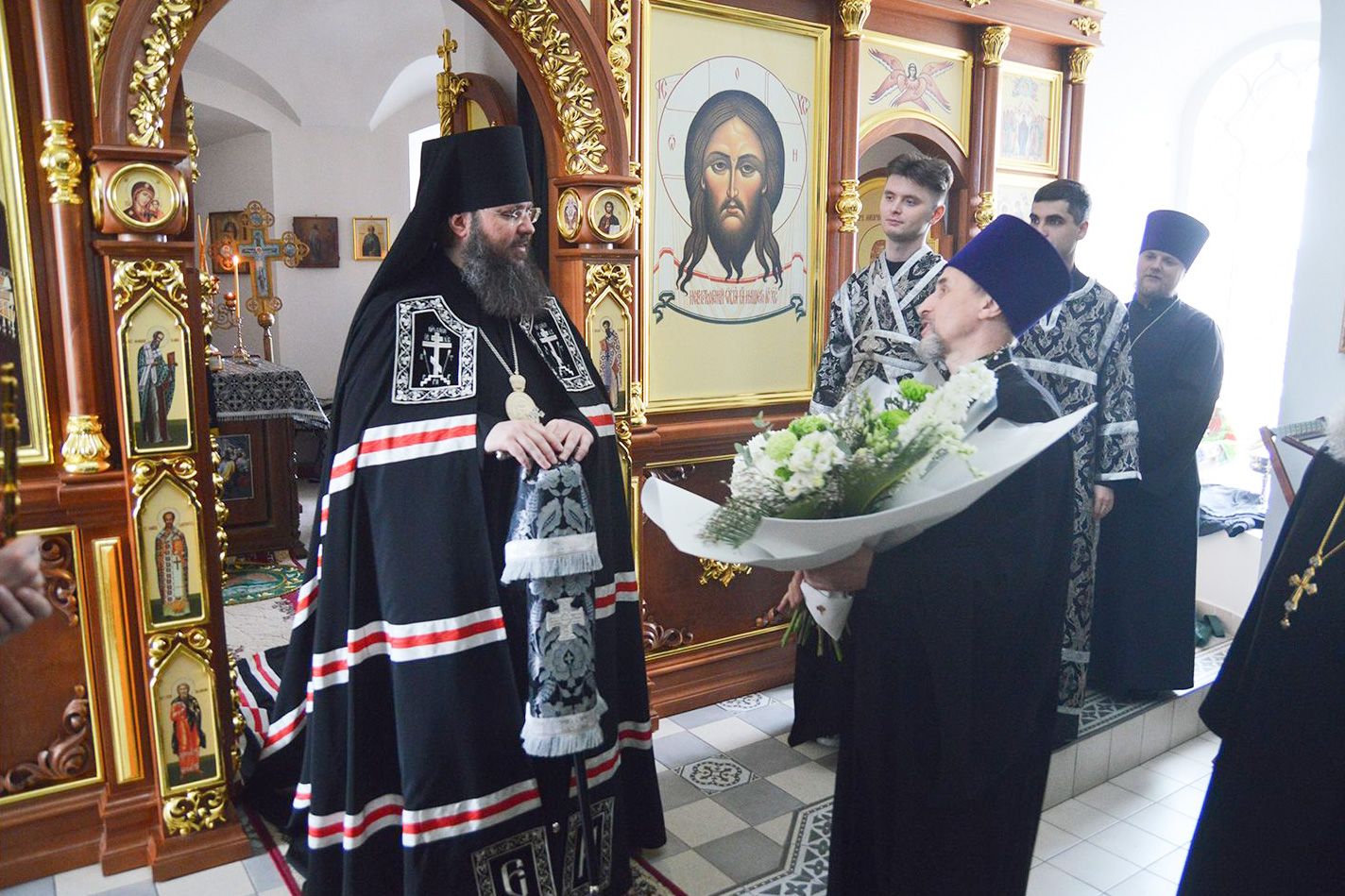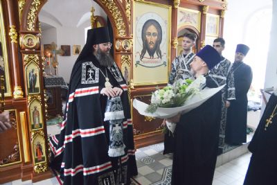 Настоятель храма иерей Владимир Забалуев поблагодарил викарного архиерея за службу и преподнес букет цветов от имени всех прихожан храма: