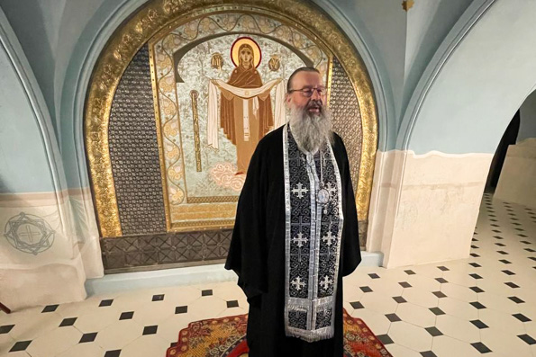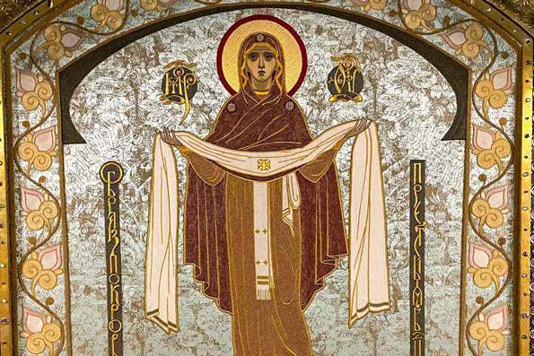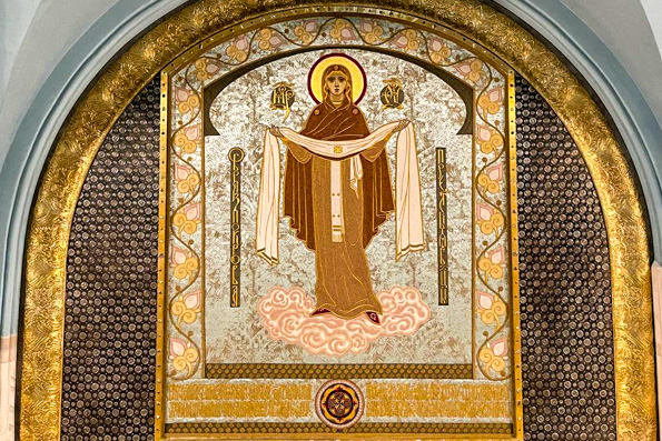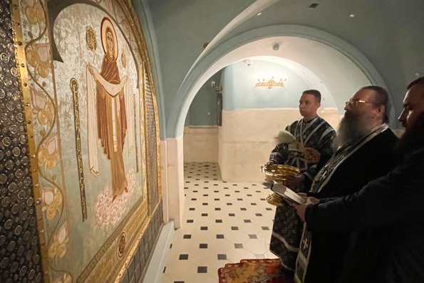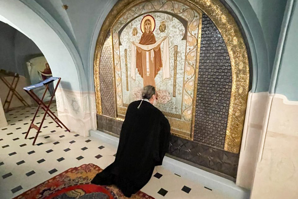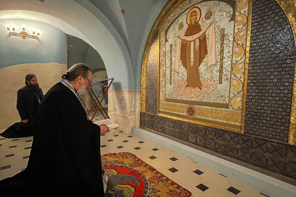 По окончании богослужения владыка Кирилл посетил нижний (Пещерный) храм Рождества Пресвятой Богородицы собора Казанской иконы Божией Матери, где освятил новую икону Покрова Пресвятой Богородицы. Эта икона, воссозданная по эскизам архитектора Алексея Щусева, вышита мастерами московского Донского монастыря в технике лицевого шитья. Образ установлен в восточной части иконостаса Пещерного храма.