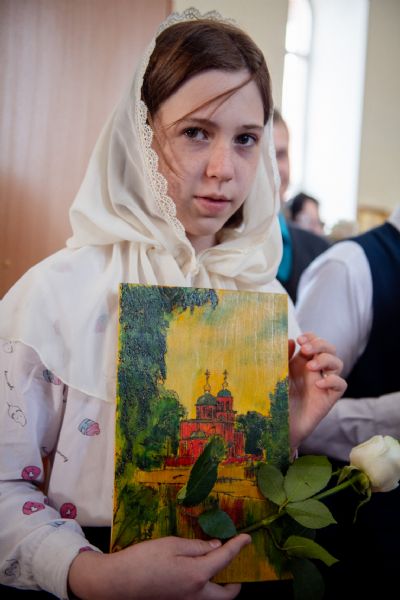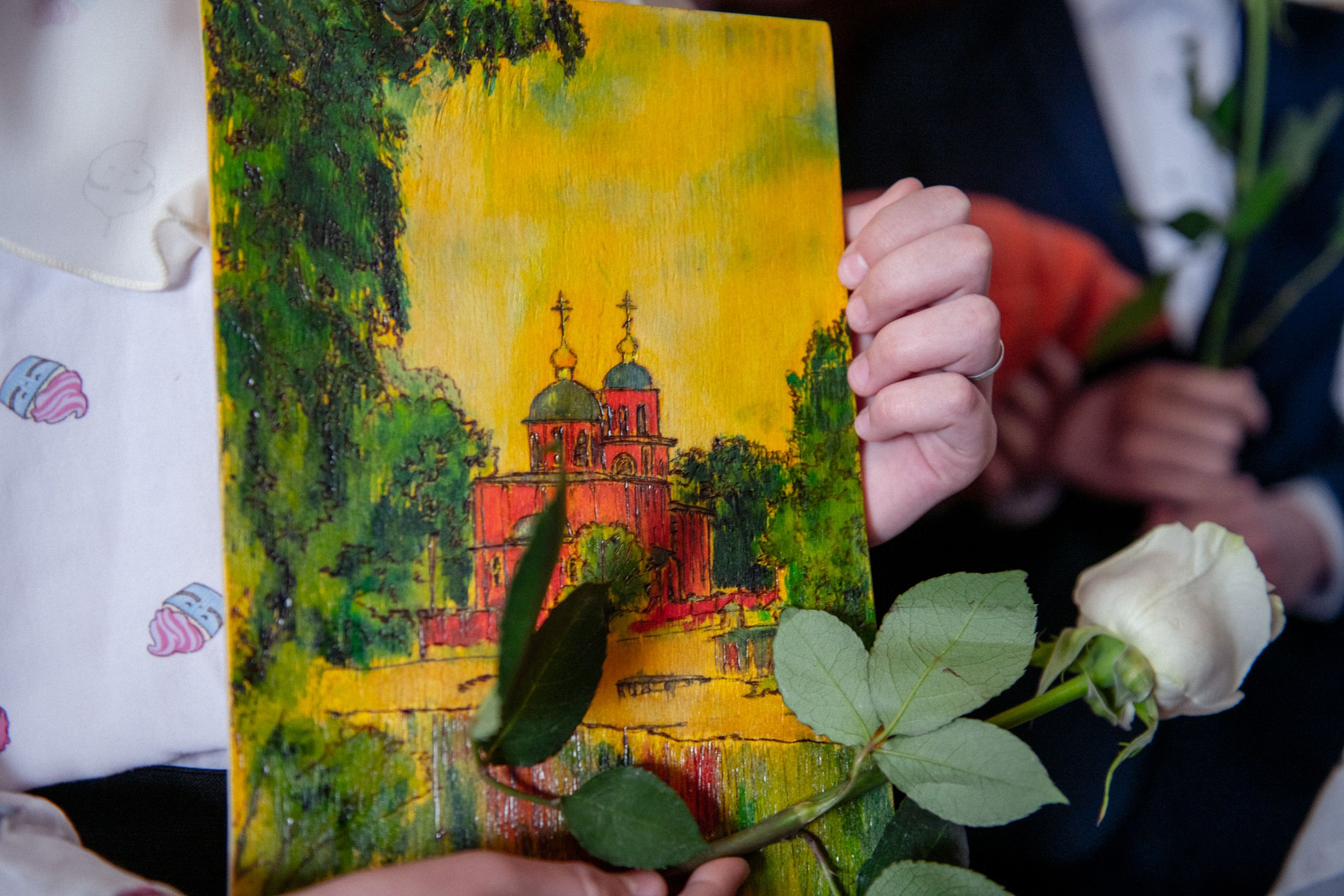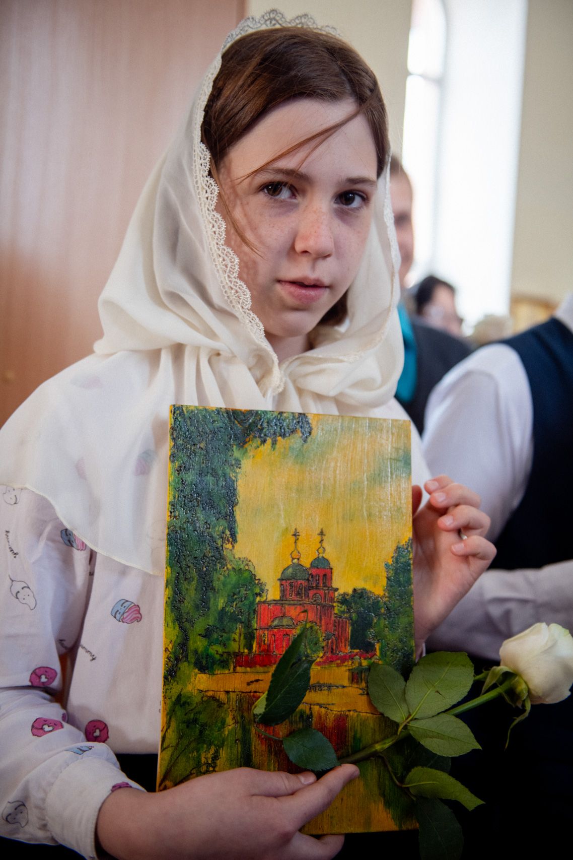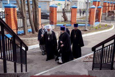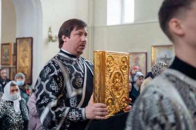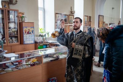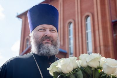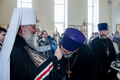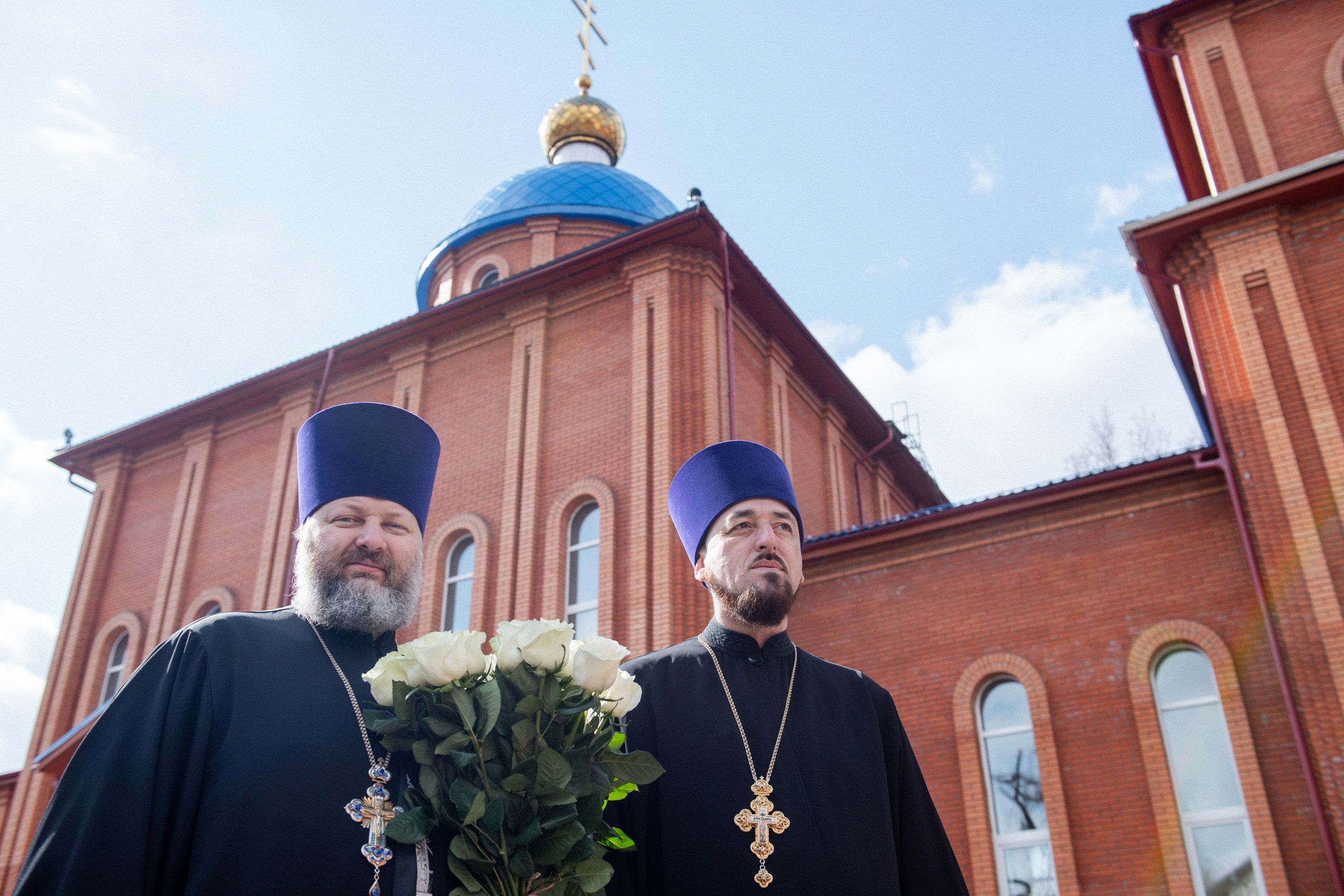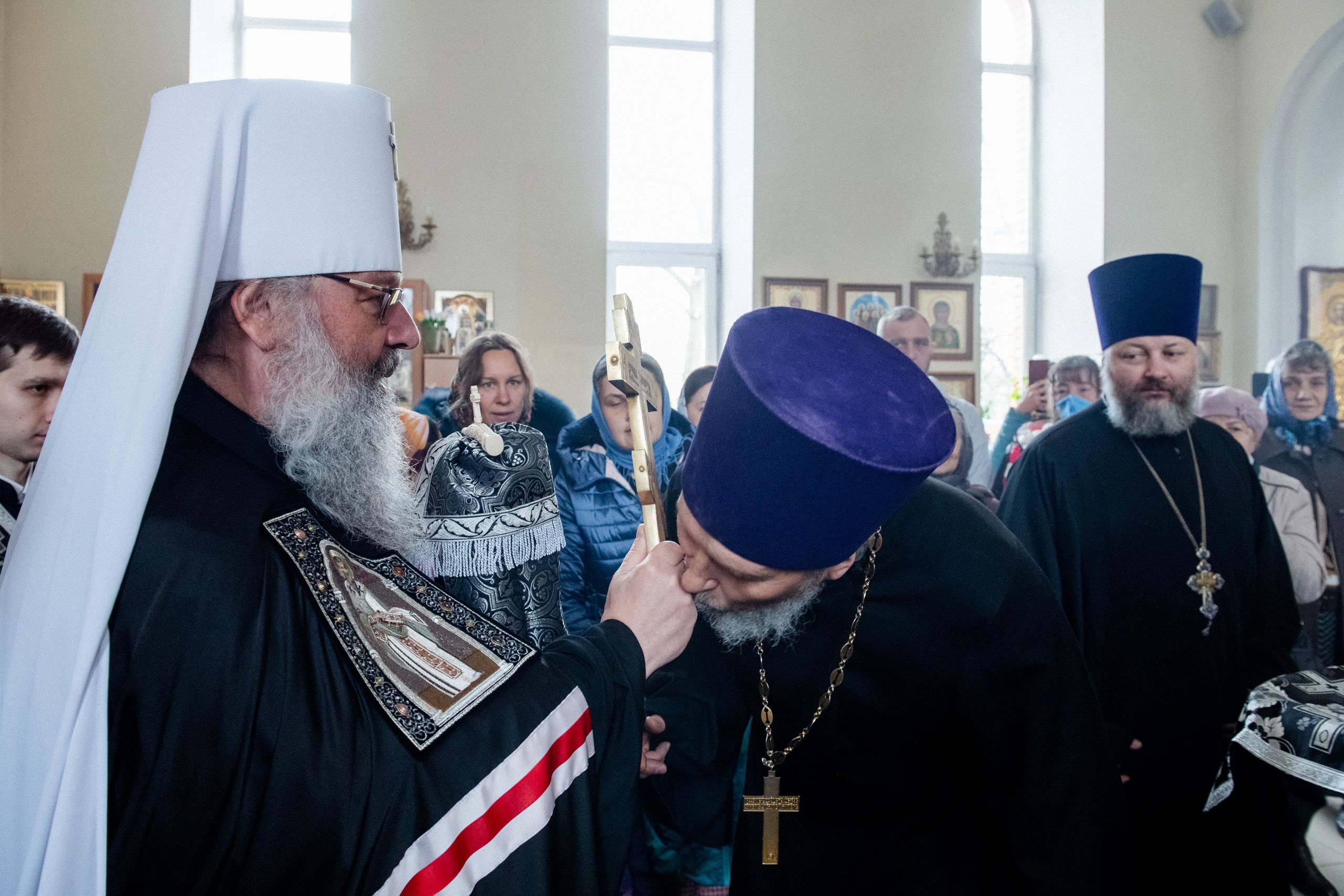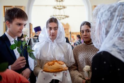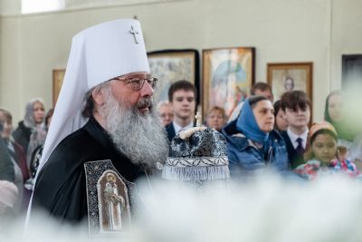 Настоятель Успенского храма протоиерей Алексий Краевский обратился к Его Высокопреосвященству со словами благодарности. На молитвенную память он преподнёс правящему архиерею Владимирскую икону Божией Матери, над украшением которой трудились воспитанники приходской воскресной школы.