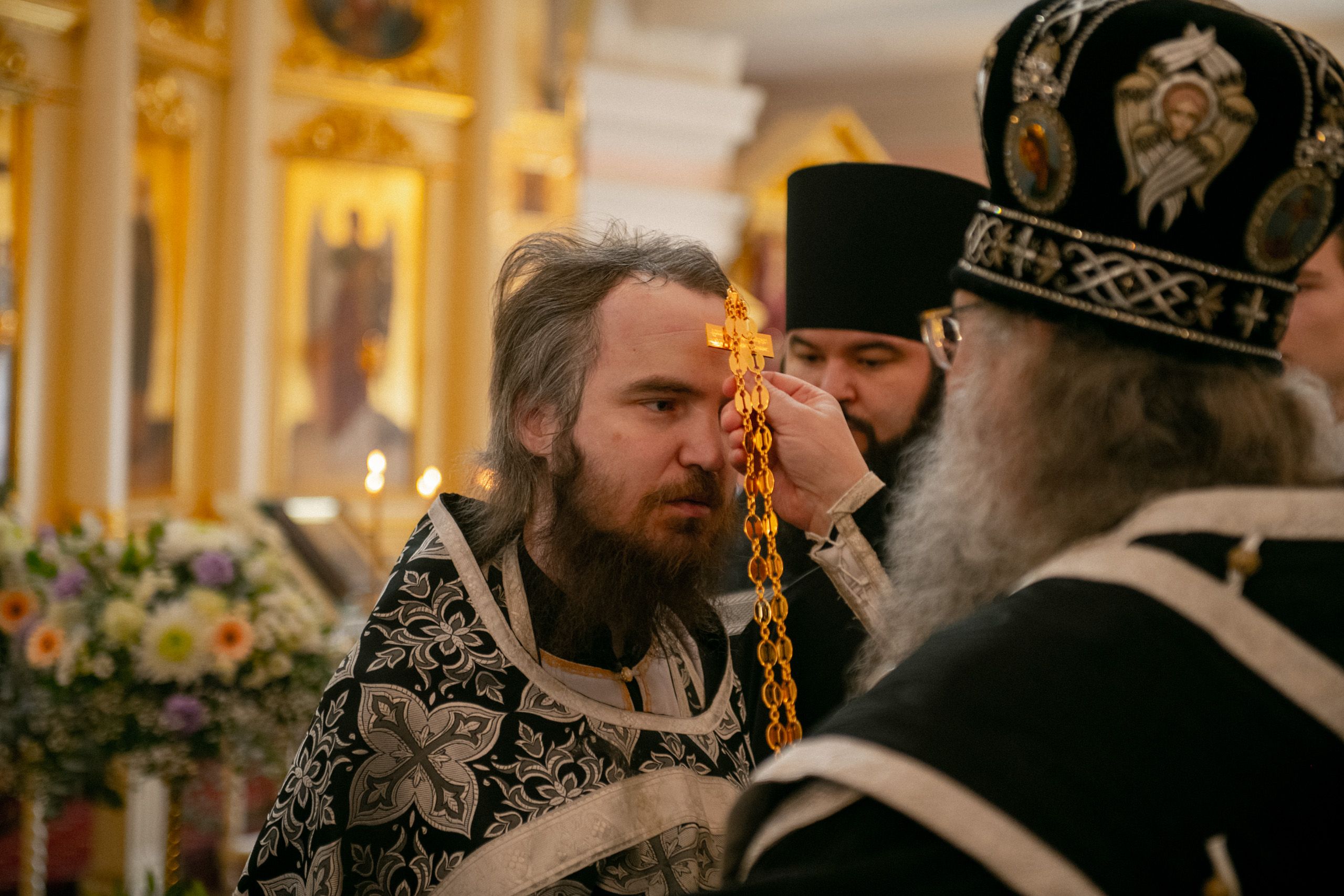 На малом входе правящий архиерей удостоил насельника Казанско-Богородицкого мужского монастыря иеромонаха Харалампия (Егорова) права ношения наперсного креста золотого цвета.