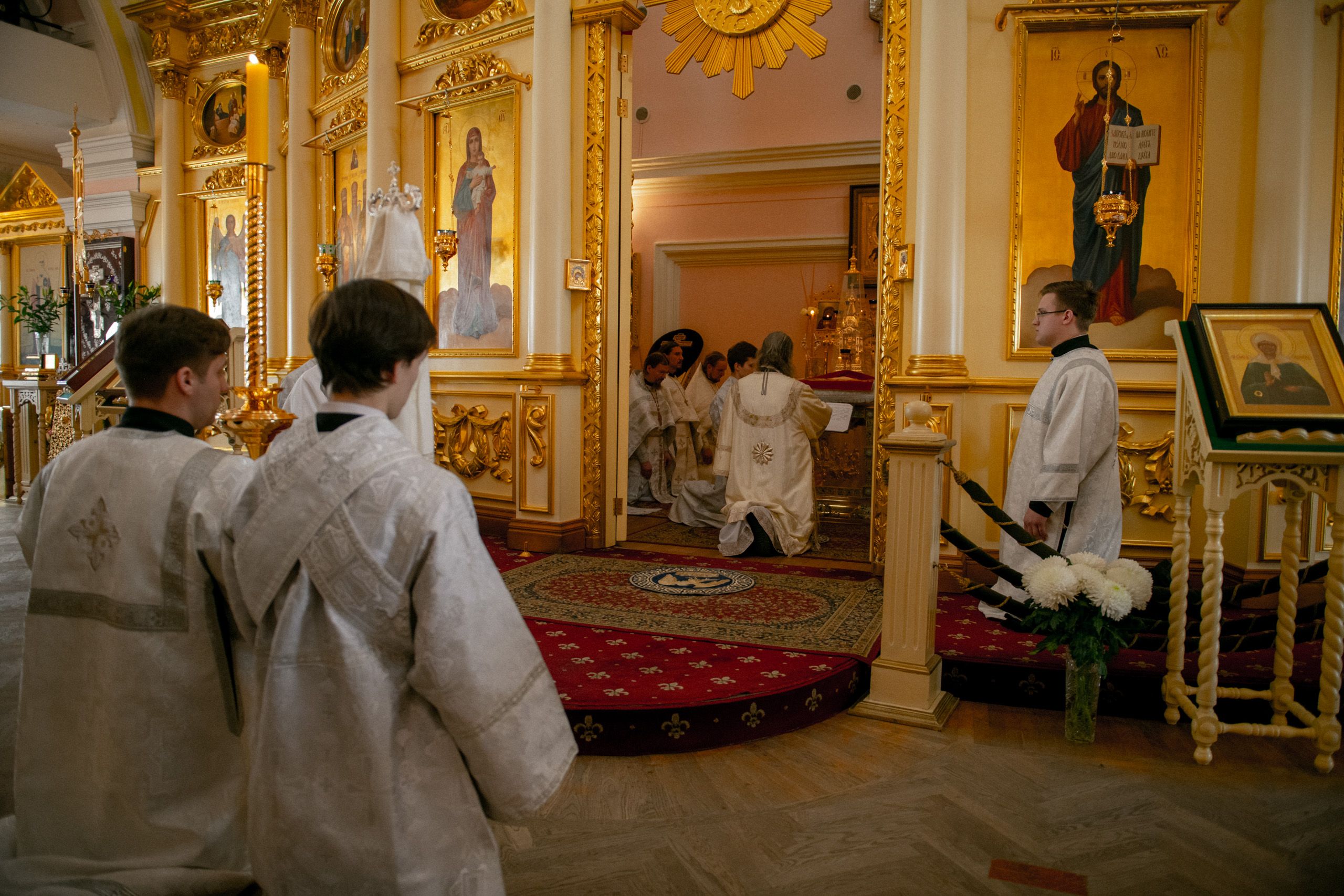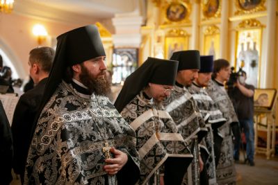 Главе Татарстанской митрополии сослужили наместник игумен Марк (Виленский) с братией обители, иеромонах Алексий (Яцейко), клирик Воскресенского Новоиерусалимского архиерейского подворья города Казани иерей Максим Димаев, клирик Благовещенского собора иерей Димитрий Аликин.