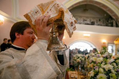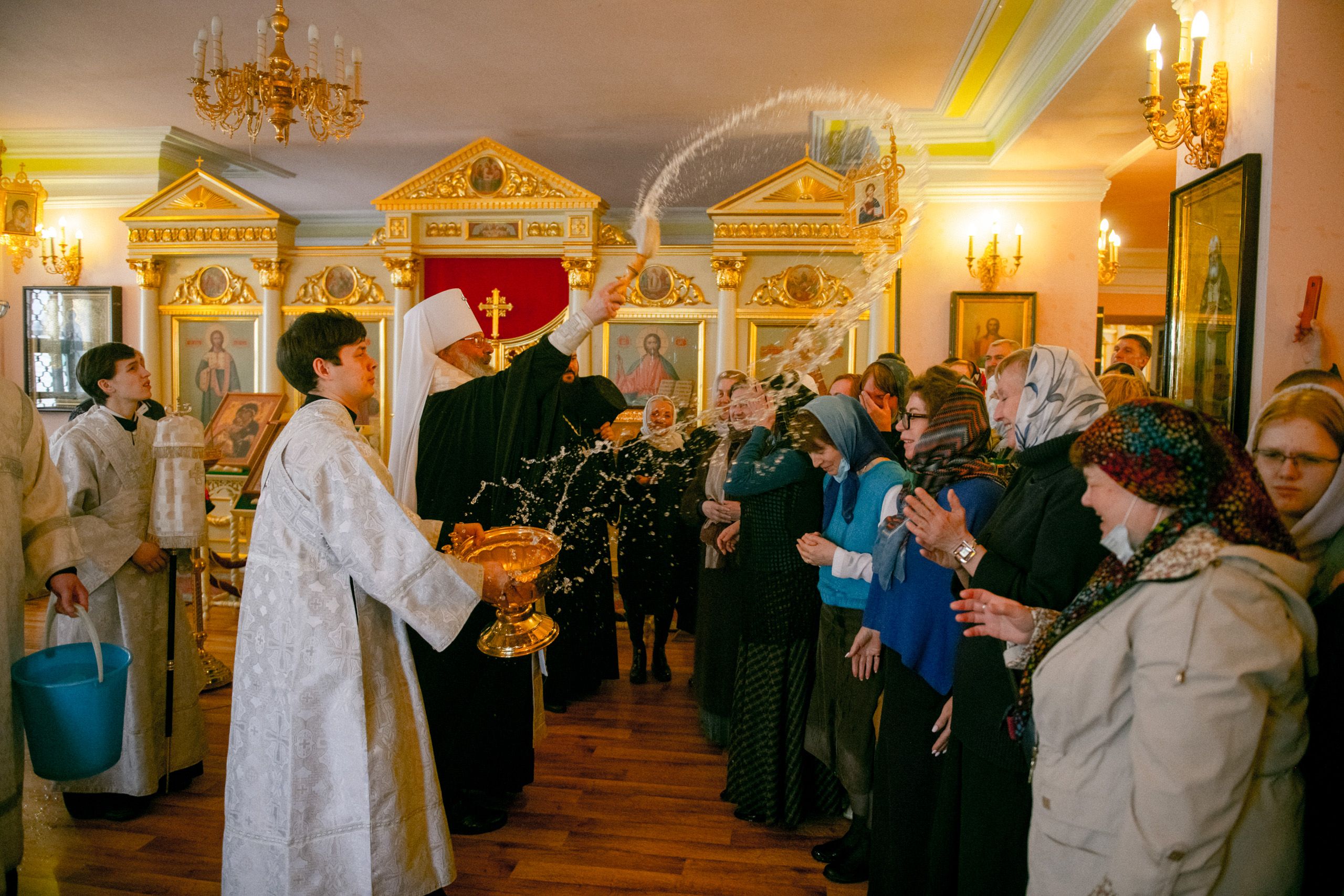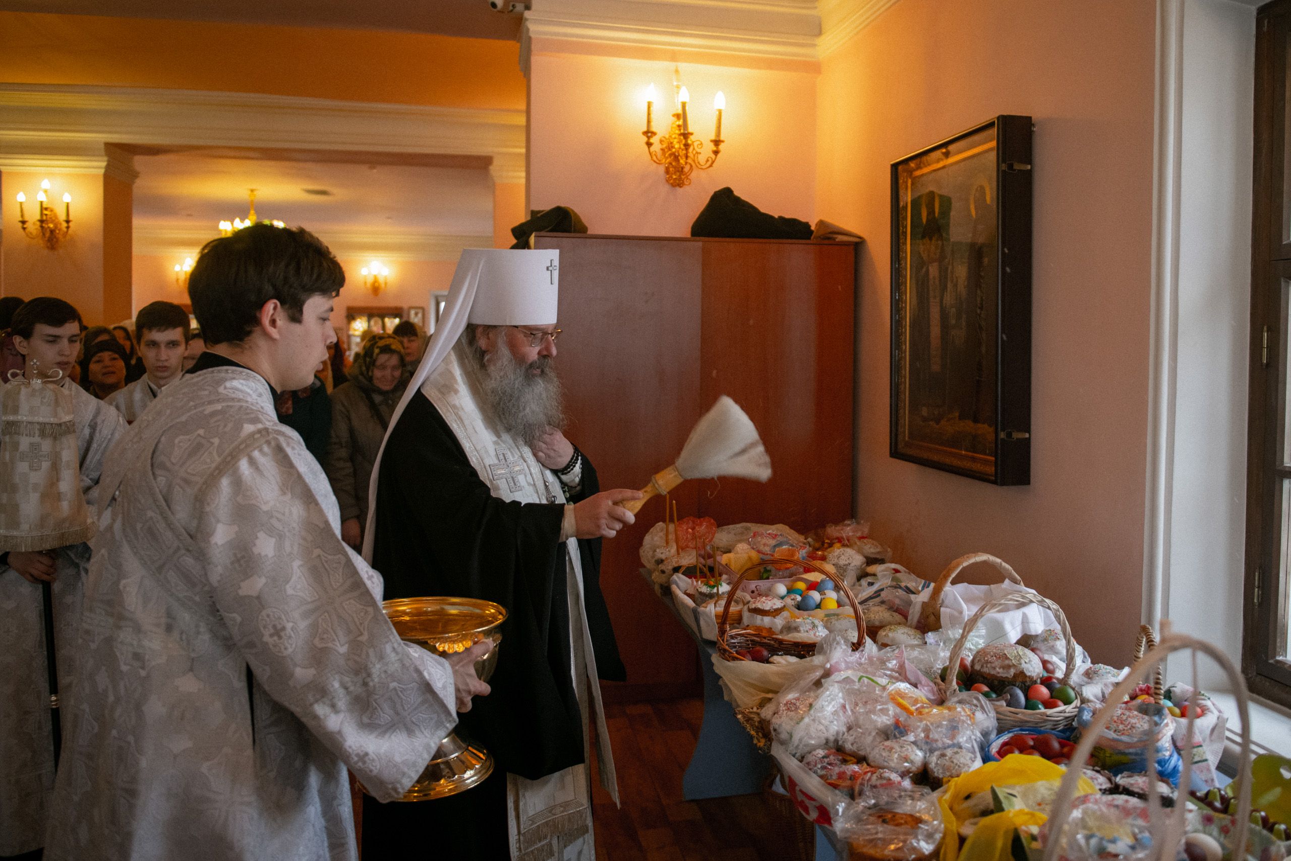 После богослужения в придельном храме священномученика Ермогена Московского правящий архиерей совершил освящение пасхальной снеди, принесённой верующими.